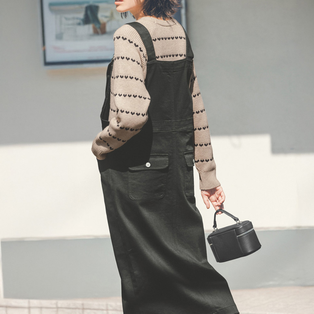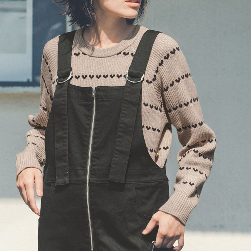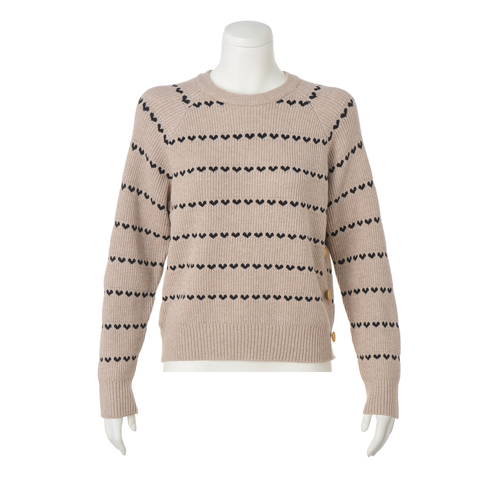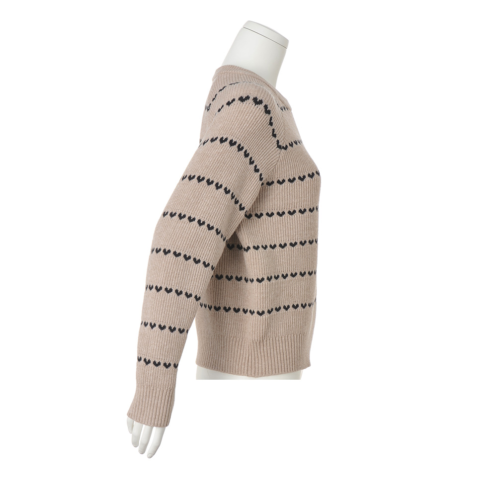 さりげない柄使いがおしゃれ心をくすぐる規則的に並ぶ小さなハート柄がボーダー見えして、気負わず着られるニットプルオーバー。ベージュ×ダークネイビーの落ち着いた配色も、程よく甘さを抑えます。編み地はふくらみがあり軽く、もっちりとした肌ざわりで着心地も◎。