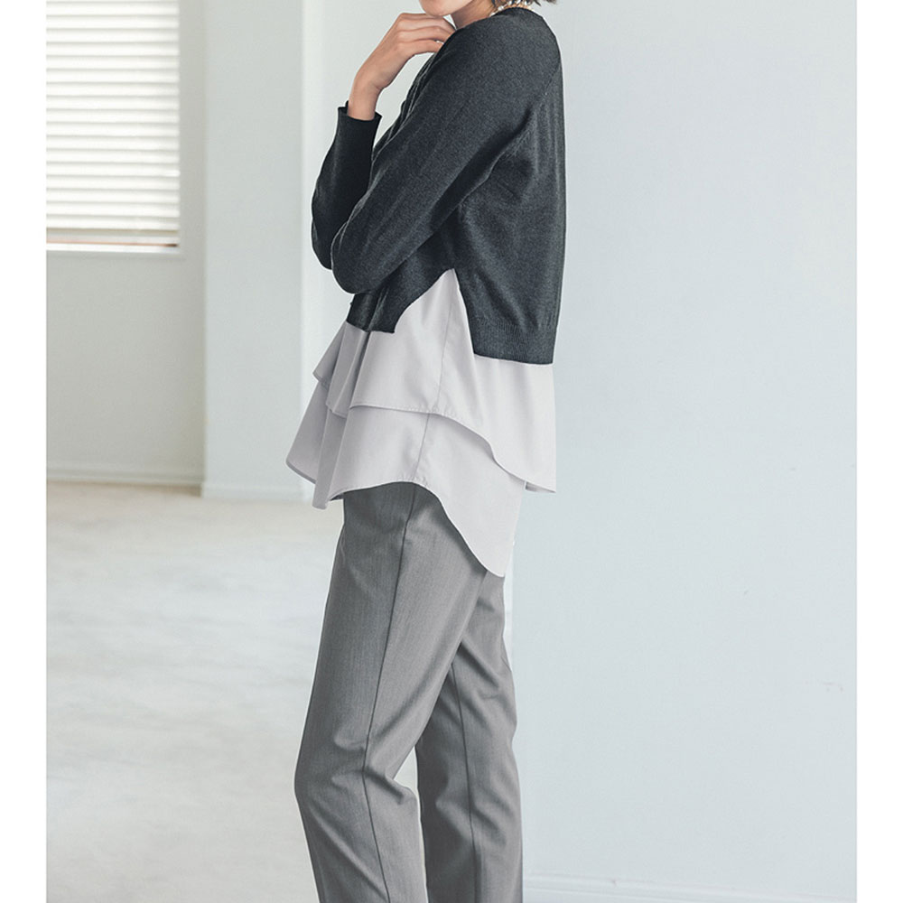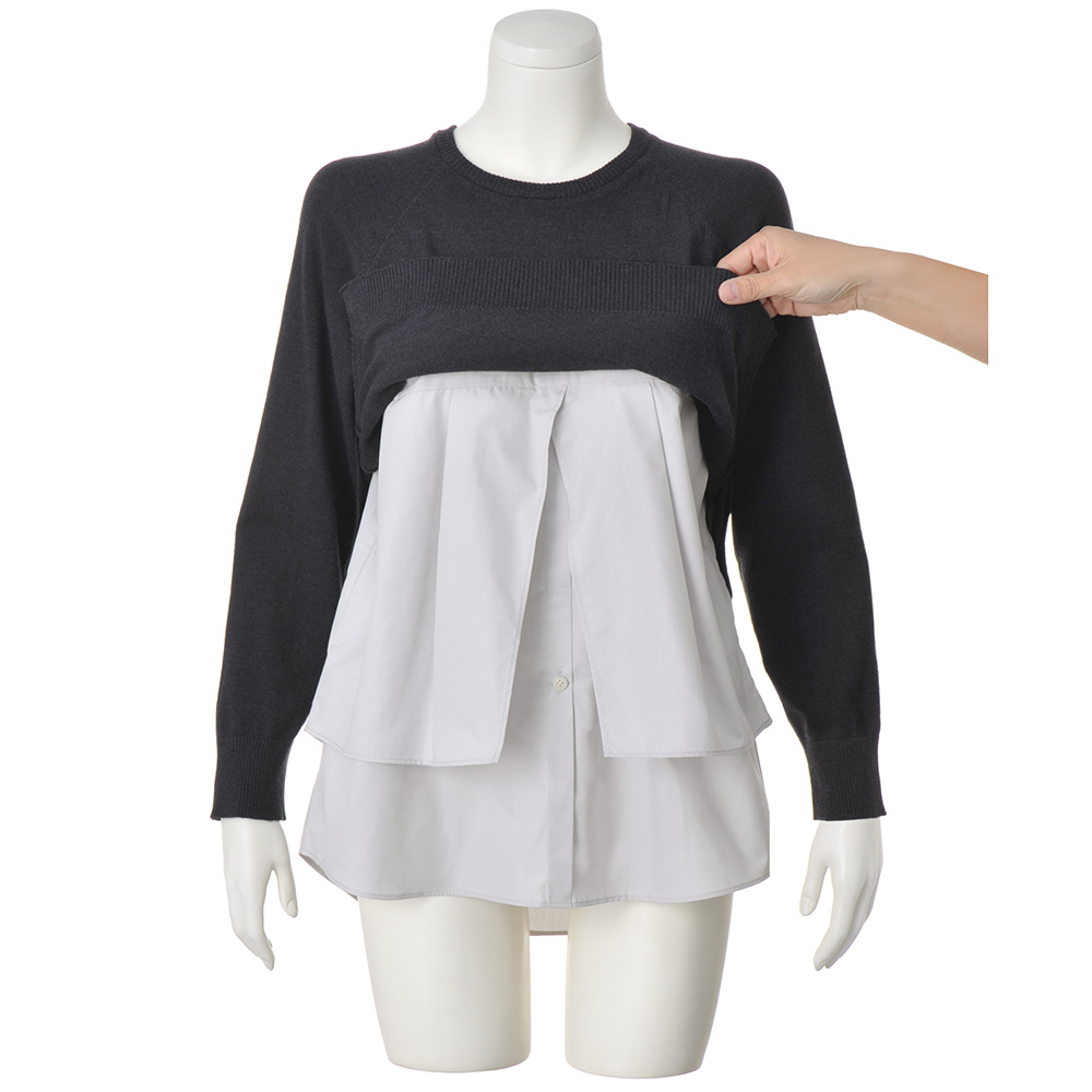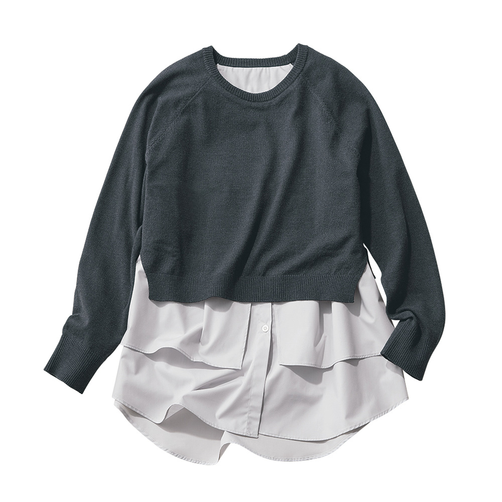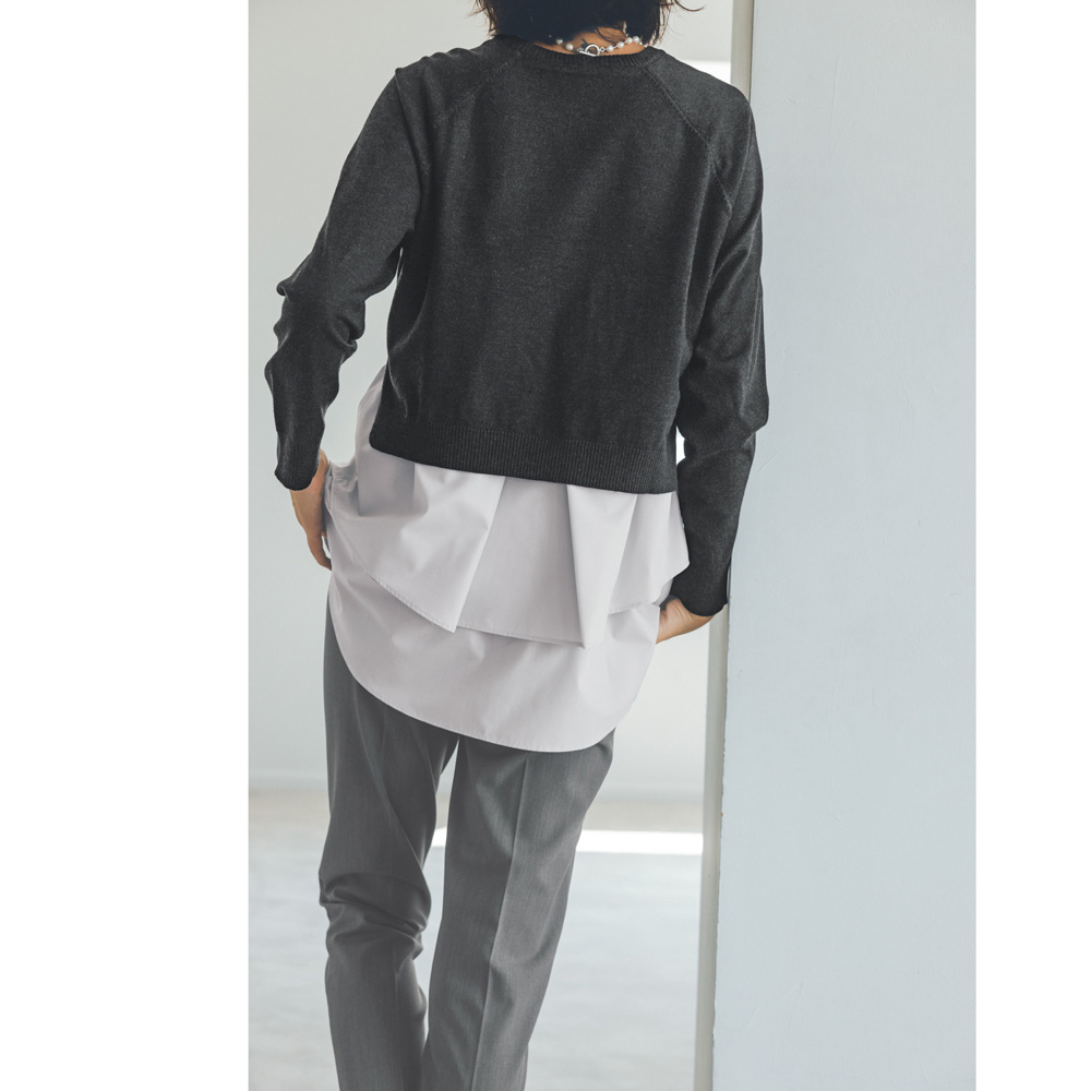 おしゃれ上級者見えが叶う一着を味方につけるショート丈ニットにシャツを2枚レイヤードしたようなデザインが目を引く一着。ニットは軽くてふくらみがあり、シャツは高密度のコットン混タイプライター。ニットのサイドにスリットを入れたり、シャツにタックをほどこし動きをつけ、リアルな重ね着感を演出します。