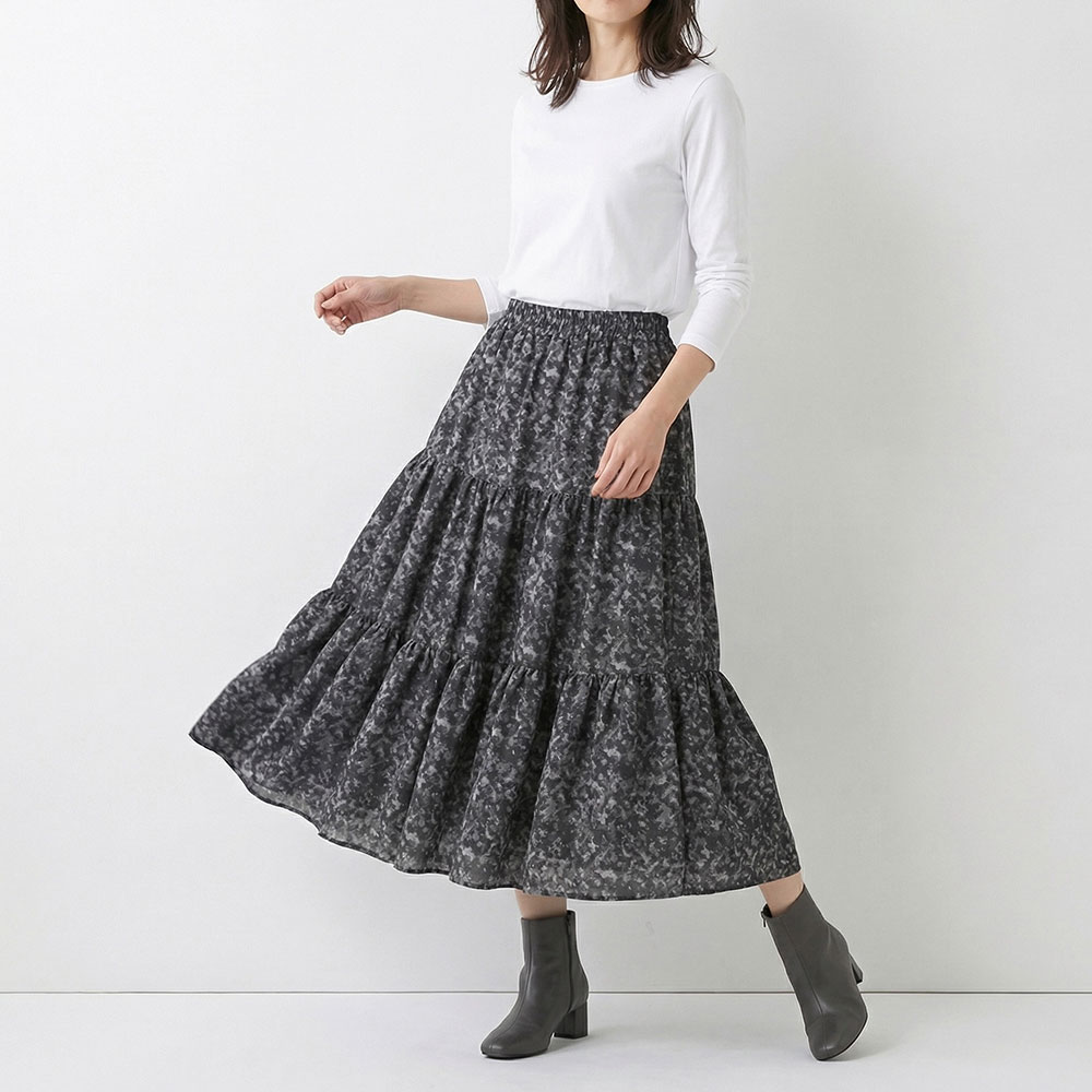 絶妙な甘辛バランスで着こなすリラクシースタイル たっぷりとした分量感を入れた甘めティアードスカートは、モノトーンのカモフラージュ柄で甘辛ミックスな仕上がりに。軽やかな生地に裏地つきの安心仕様で、オールシーズン楽しめます。
