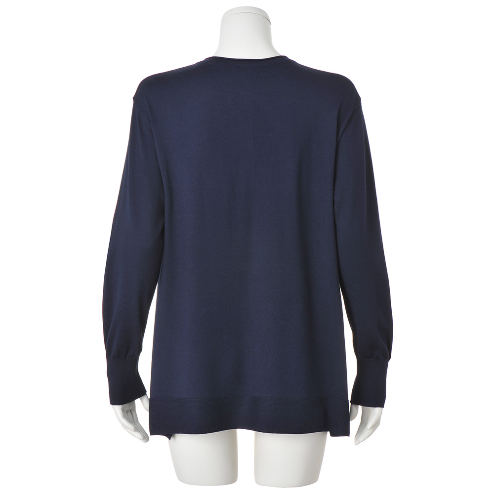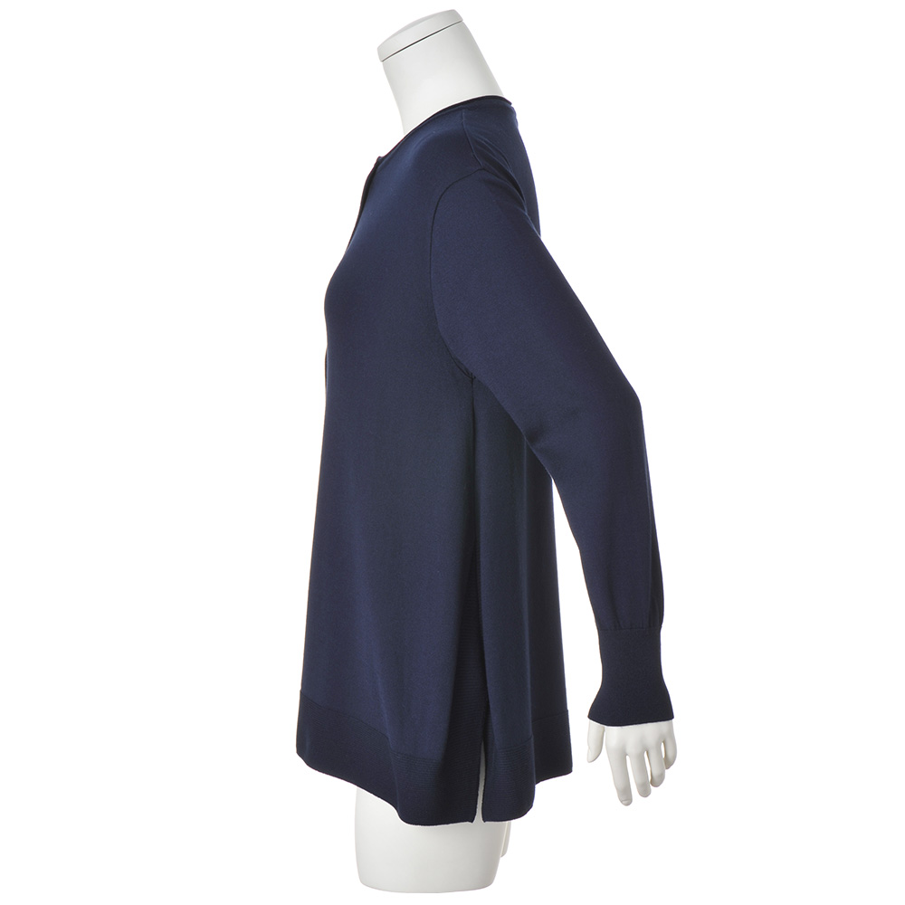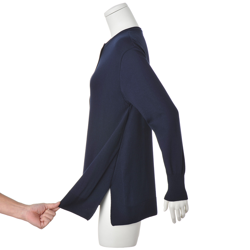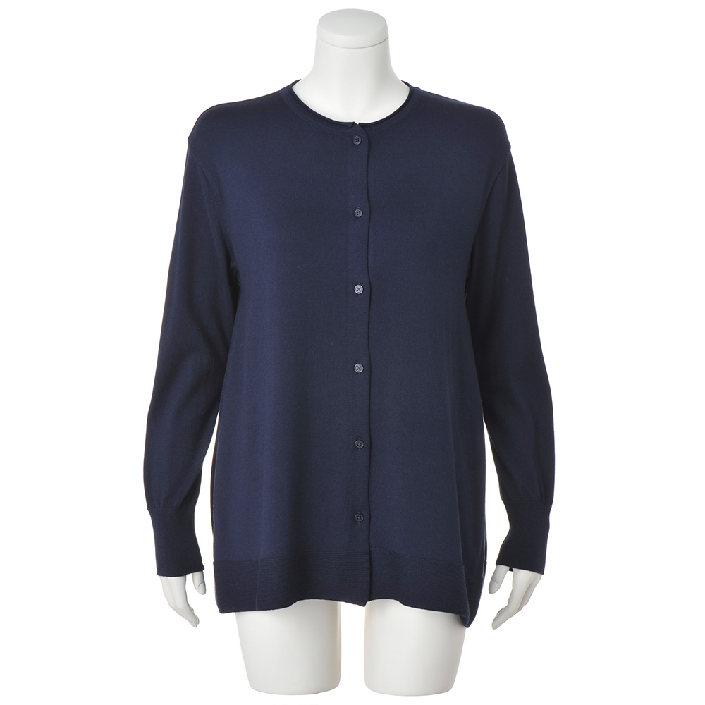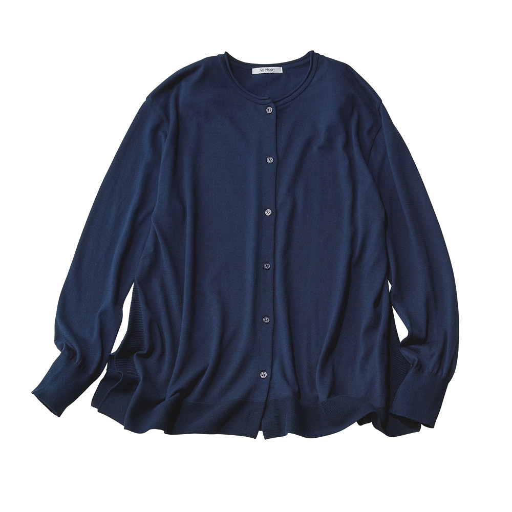 シーズンレスでどんな季節でも活躍!品のよさを感じる艶感と美しい発色のネイビーカラー、程よく薄手の編み地感でロングシーズン着回せて重宝します。おしりを覆う丈感のロングカーディガンは、裾に分量感を持たせたフレアシルエットがポイント。さまざまなアイテムに合わせて活躍します。