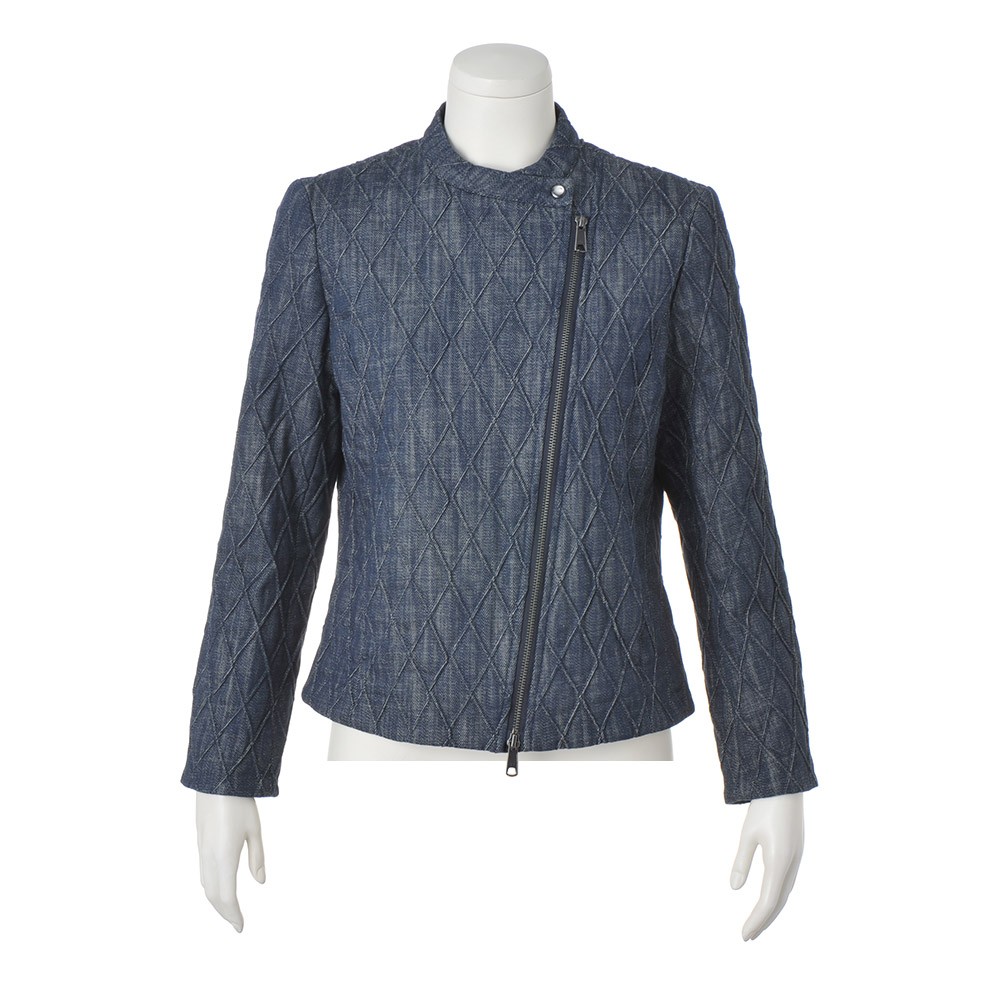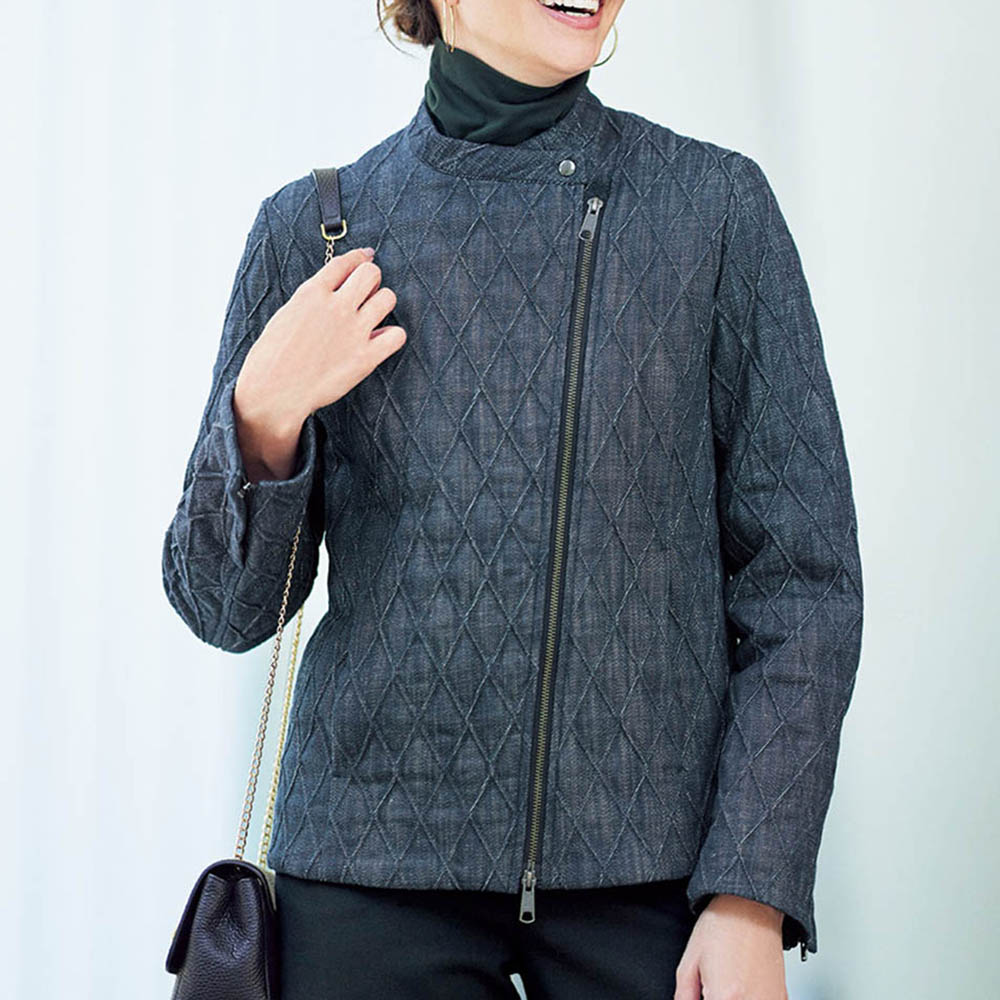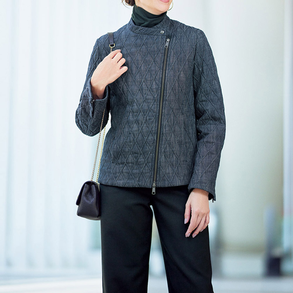 ライダースジャケットをデニムキルティングでアクティブかつ上品にクールなライダースジャケットを、DAMA世代のキャリアスタイルに落とし込んだら…。そんな発想から誕生した、キルティング加工を得意とするイタリア「TEX-LUIS」社らしい中わた入りデニム素材で仕立てたジャケットです。特筆すべきはキルトステッチ。特殊な織り機を使って2本のラインを同時に描き、凹凸のある柄が浮かび上がる逆キルトだから、ぐっと大人っぽい表情に。縦長なダイヤ柄は細見え効果も期待できます。ライダースの着こなしが決まるコンパクトなサイズ感でも、中わたの薄さと表地のしなやかさで着心地良く。纏うだけで美しく、コンフォート!洗練を授ける素材と形斜めのダブルファスナーや袖口ファスナーを利かせたライダースジャケットを、斬新な素材ときれいなフォルムで大人仕様に。