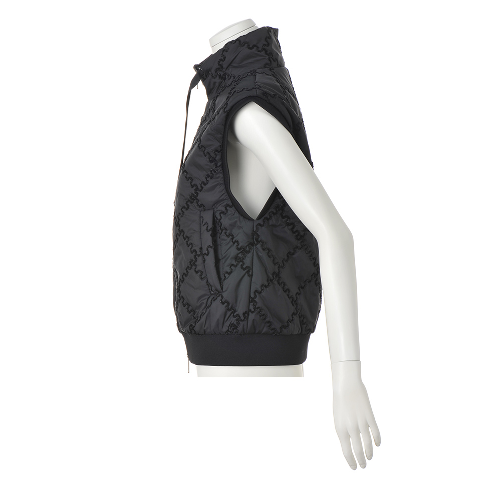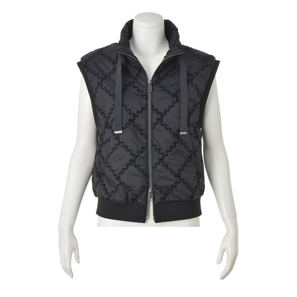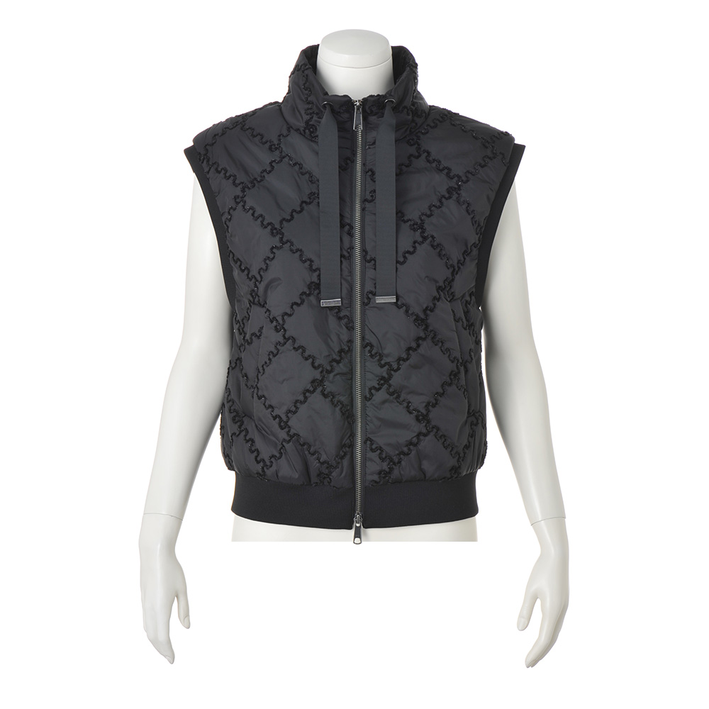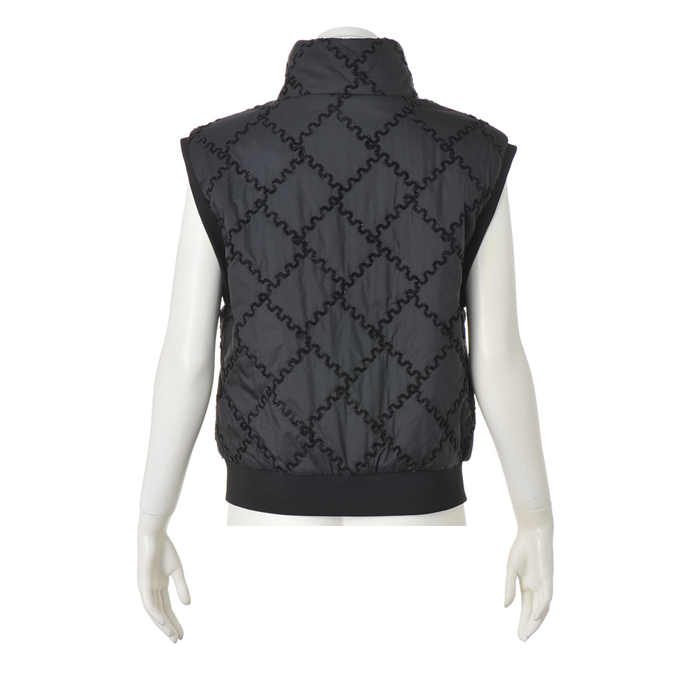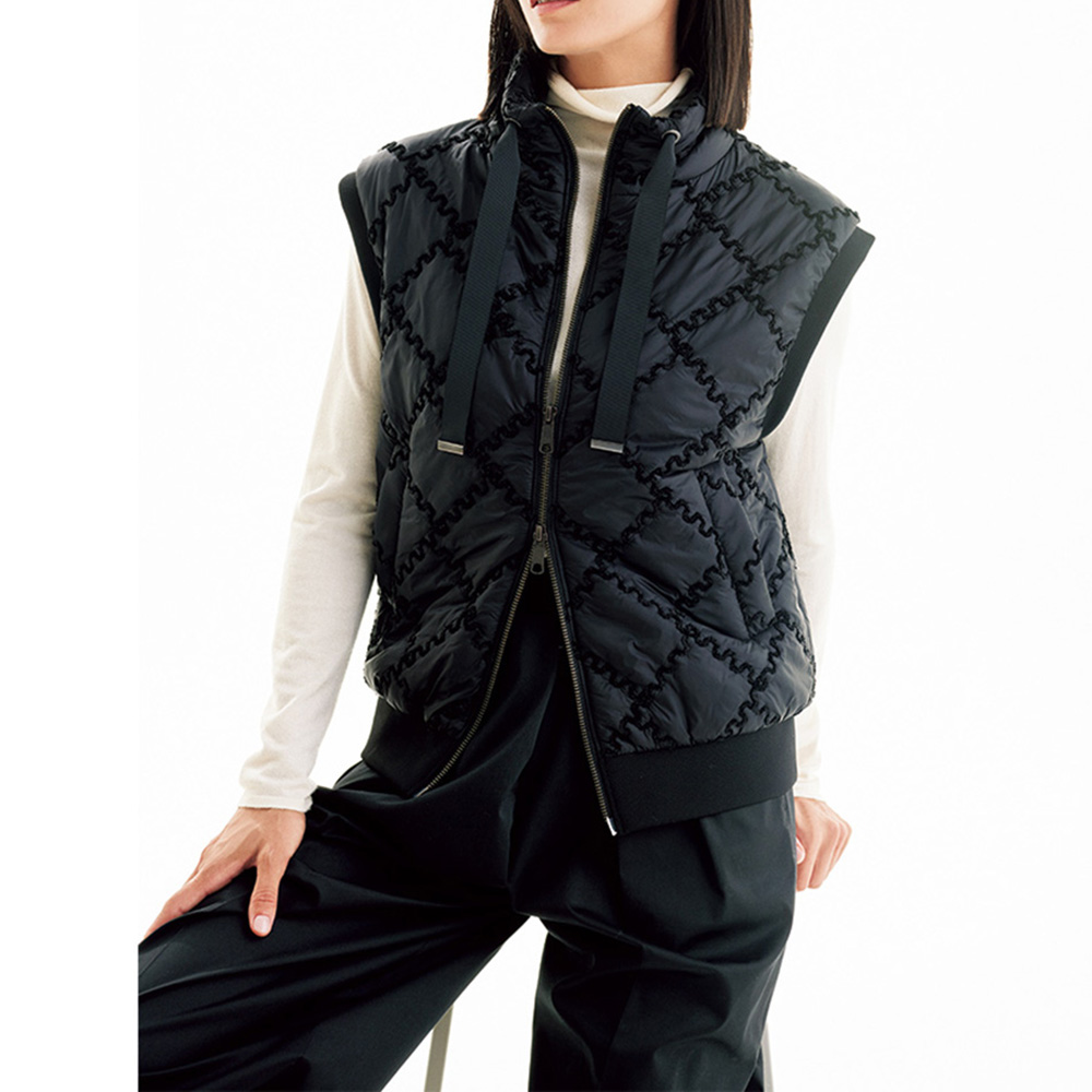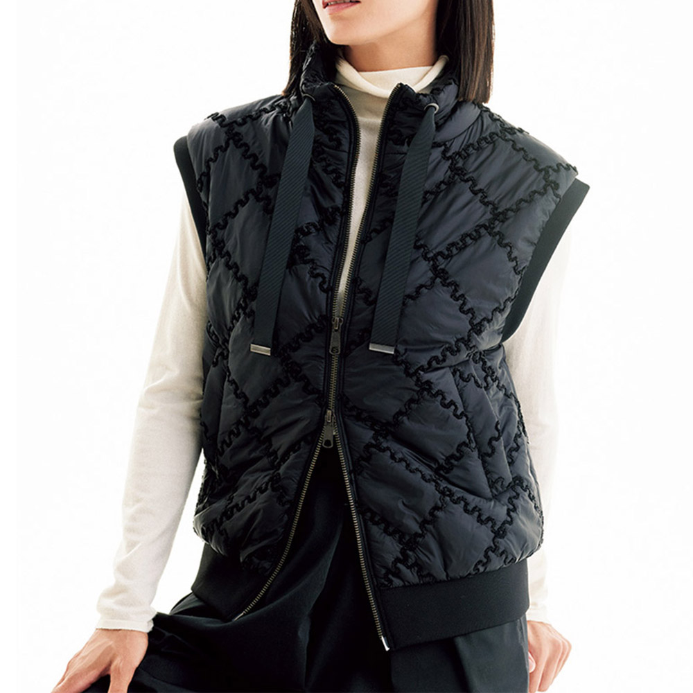 移ろいやすい季節に重宝する中わた入りジレを、大人のエレガンスへ昇華。生地はイタリア「TEX-LUIS」社のキルティングで、艶やかな黒の基布に同色のモールラメ糸によるDAMAコレクションオリジナルのジグザグのスクエアパターンが印象的!軽量でコンパクトなフォルムの中に、襟元のグログランテープ、袖ぐりと裾にハイストレッチリブニットのディテールもちりばめて。≫ POINTジャストなサイズ感もきれいめな印象。ダブルファスナー開閉でバランス良く、窮屈感なく着こなせます。