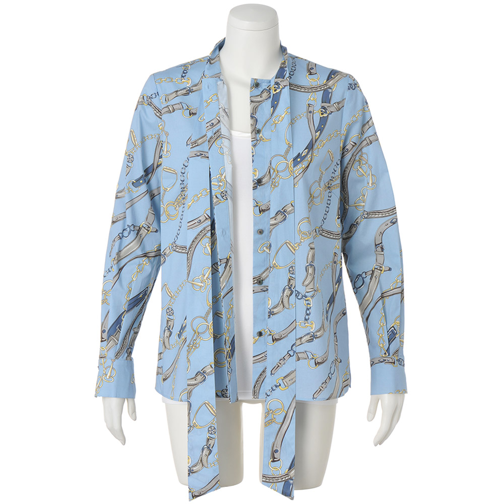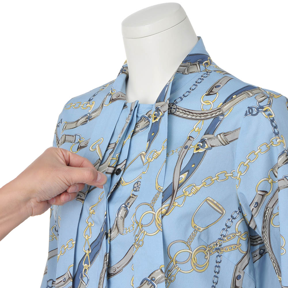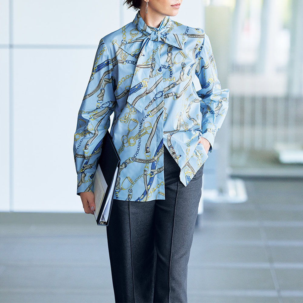 知的で華麗!会う人に好印象を与えるボウタイブラウスふんわりとしたボウタイブラウスのエレガントさとは異なる、働く女性のインテリジェンスをストレッチコットンのシャツ生地に託しました。爽やかなサックス地にプリントされたベルトやチェーン、ビットモチーフの品格は、さすがイタリア素材。流美な柄行きをできるだけ途切れさせないよう、前立ては比翼仕立てにしています。デザインポイントのボウタイは、スタンドカラー続きでズレる心配がなく、デスクワーク中の邪魔にならないボリュームにも配慮。すっきりと着こなせるサイズ感に、前はバストダーツで立体感を、後ろはセンタータックでゆとりを持たせました。