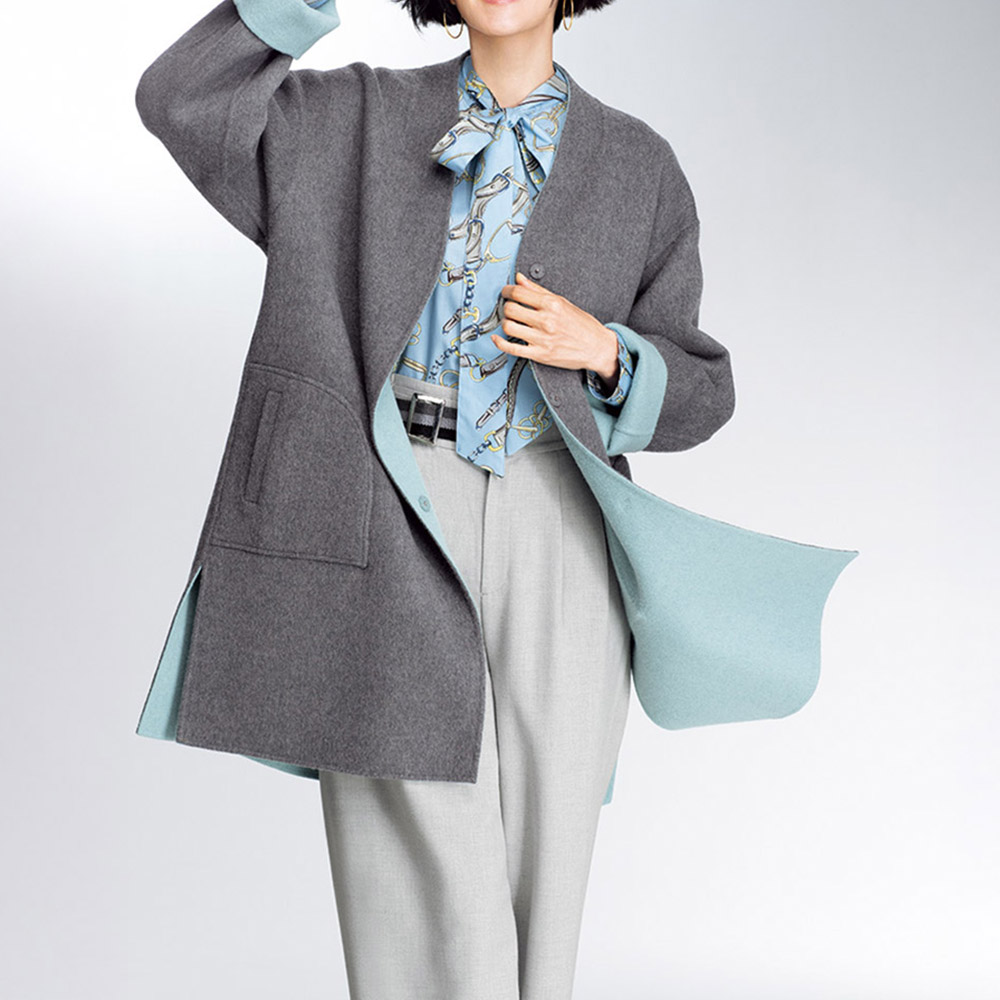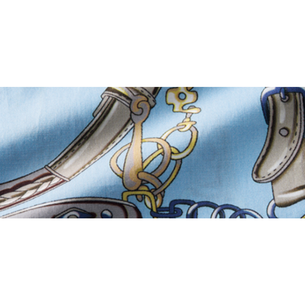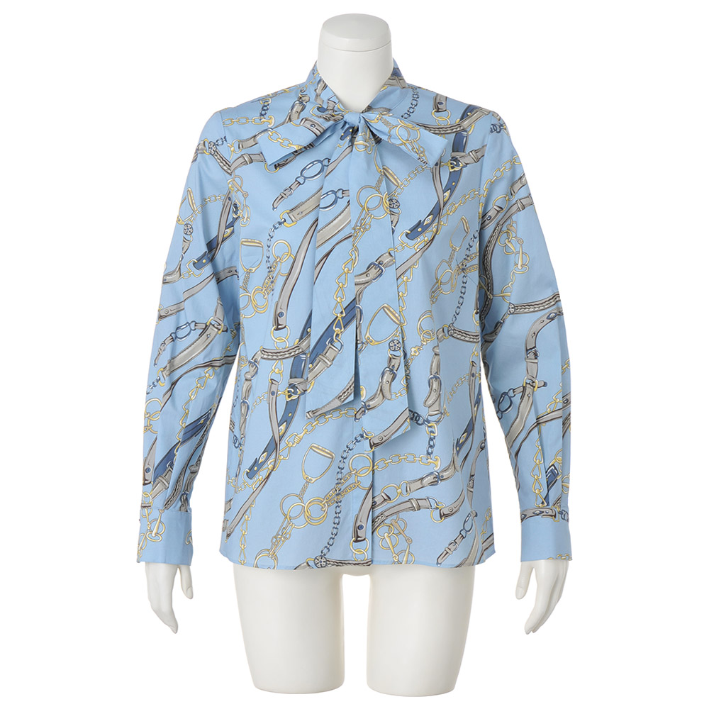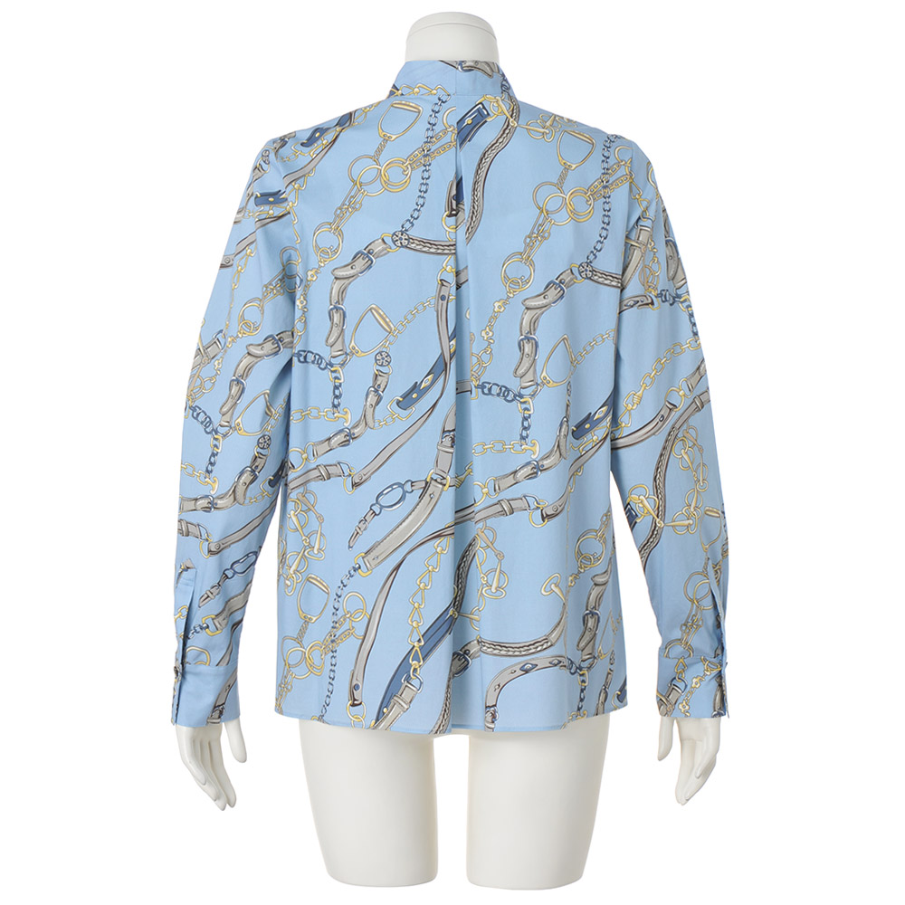 知的で華麗!会う人に好印象を与えるボウタイブラウスふんわりとしたボウタイブラウスのエレガントさとは異なる、働く女性のインテリジェンスをストレッチコットンのシャツ生地に託しました。爽やかなサックス地にプリントされたベルトやチェーン、ビットモチーフの品格は、さすがイタリア素材。流美な柄行きをできるだけ途切れさせないよう、前立ては比翼仕立てにしています。デザインポイントのボウタイは、スタンドカラー続きでズレる心配がなく、デスクワーク中の邪魔にならないボリュームにも配慮。すっきりと着こなせるサイズ感に、前はバストダーツで立体感を、後ろはセンタータックでゆとりを持たせました。