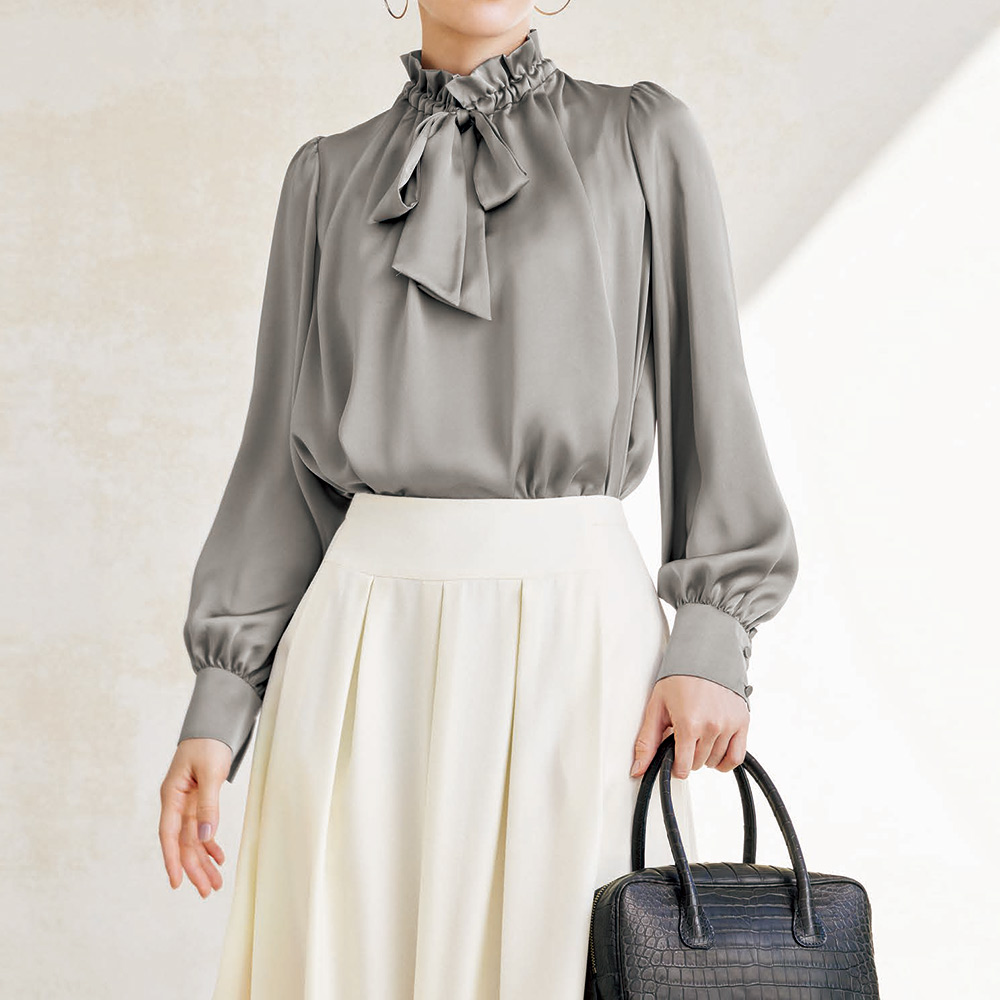 顔周りが甘く華やぐ主役級ブラウスお出掛けにオケージョンにと人気のボウタイブラウス。デザインポイントのフリル襟は、後ろのみゴムを入れてギャザーをキープさせ、サイドから前は共生地のボウタイを引き絞ってギャザーを調節できる仕様。襟周りから流れるドレープ、パフスリーブのふんわり感を際立たせるのは、とろみのある落ち感と上品な光沢のサテン生地。ウォッシャブルでロングシーズン着こなせる人気のマテリアルです。