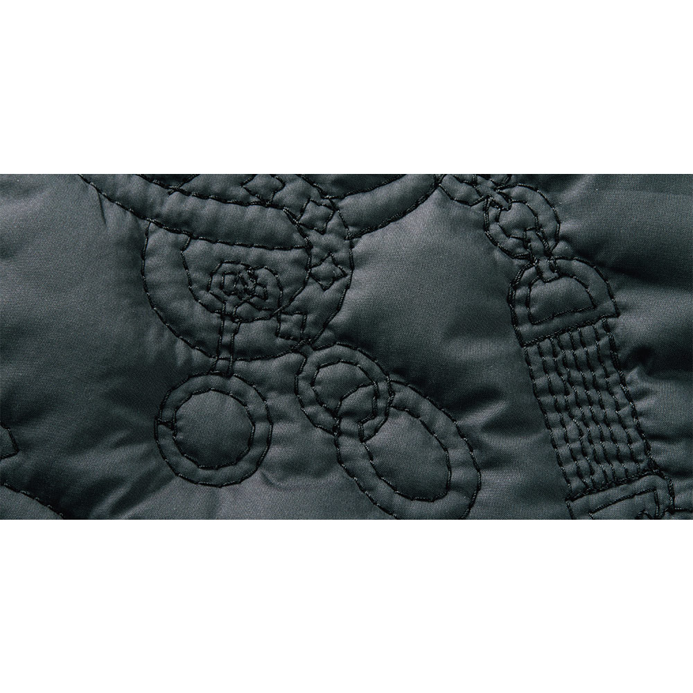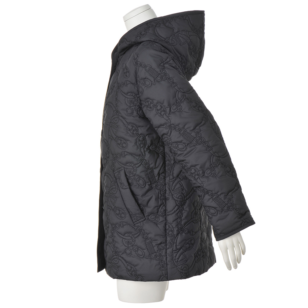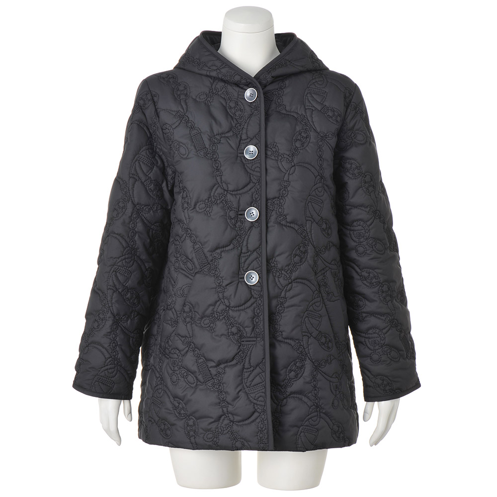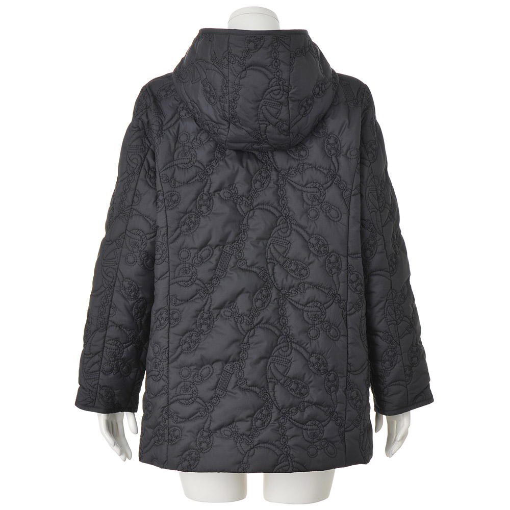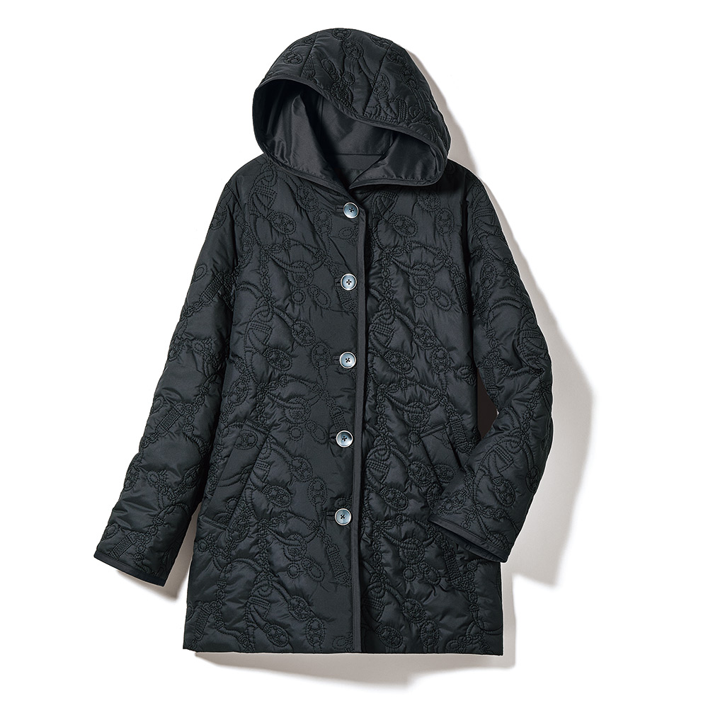 黒のディテールを重ねた品格キルティングコート「敦賀繊維(株)」の刺しゅう入りタフタで仕立てた中わた入り軽量ハーフコート。チェーンとビットとベルトを組み合わせた品格ある柄を、はっ水性に優れた基布に中わたを重ねて太番手のレーヨン強撚糸でステッチ掛けし、柄がくっきりと際立つ仕上がりに。デザインにもさりげない拘りを込めて、スポーティーなフード付き、薄手ながら気になる体型をカバーできてヒップまで暖かいハーフ丈、バックスタイルもすっきり若々しく見えるよう後ろ身頃にはパネル切り替えを施しています。≫ POINTステッチ、パイピング、裏地も黒一色の潔さ!大きめの前ボタンは縁周りのシルバーがさりげなくモードな雰囲気。