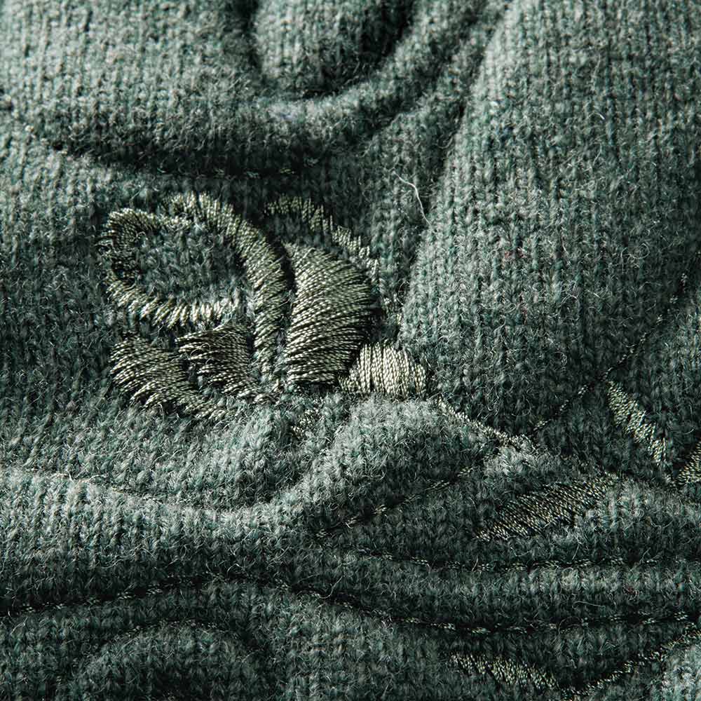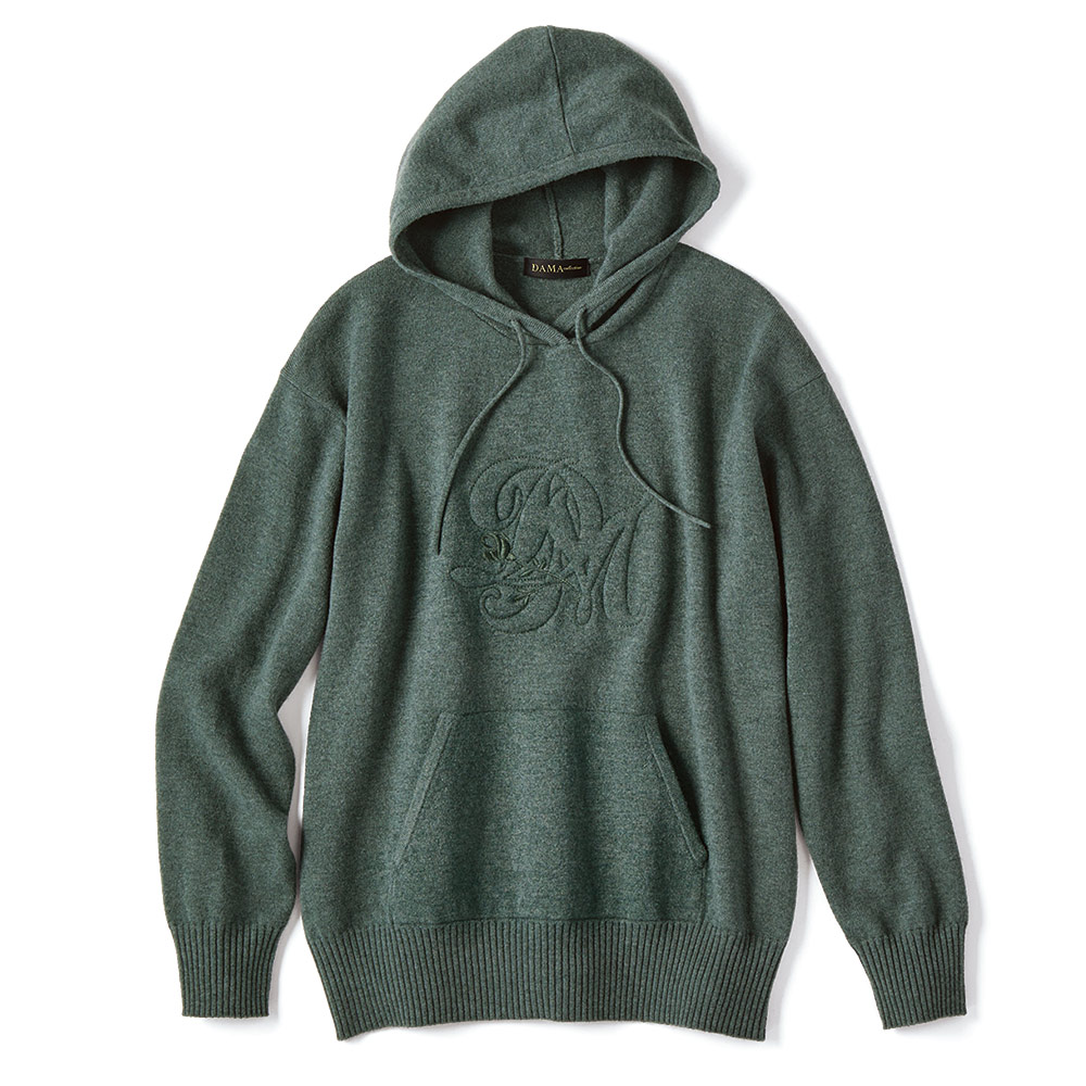 大人のハイカジュアルを3D刺しゅうのニットでミリタリーな雰囲気もある青銅色(スモーキーグリーン)のメランジニットで、大人のカジュアルに活躍するニットアイテムをつくりました。しっかりとした編み地は、高品質と名高いエクストラファインラムズウールの天竺編み。胸元にはアルファベットのDとMをモノグラム化し中わたを入れた立体的な刺しゅうを。さらに同系色の糸で花モチーフの刺しゅうを重ねています。ゆったりしたパーカには、カンガルーポケットを付けてアクティブなアクセントに。≫ POINT胸元の“D”と“M”部分には中わたが入っており、ふっくら立体的。そこに施された同色の花の刺しゅうが印象をより大人好みに昇華させて。