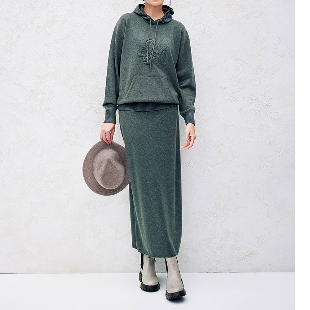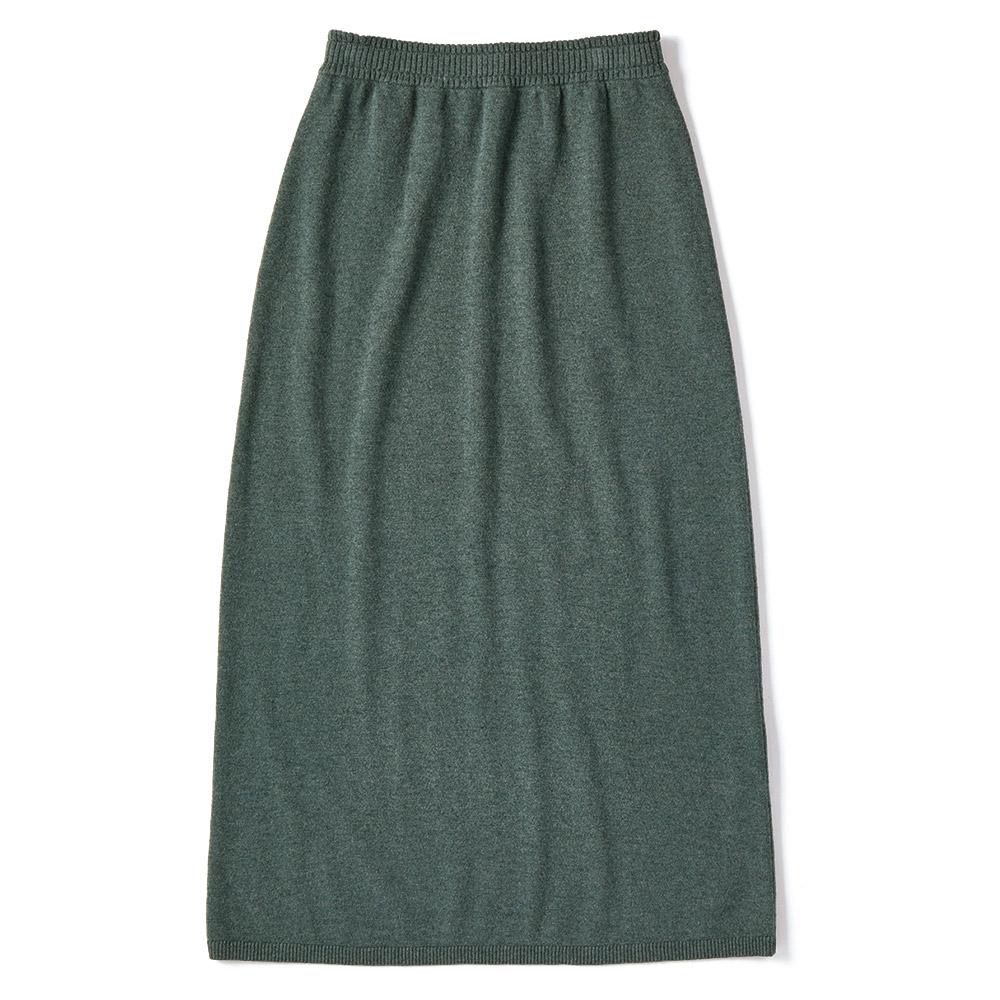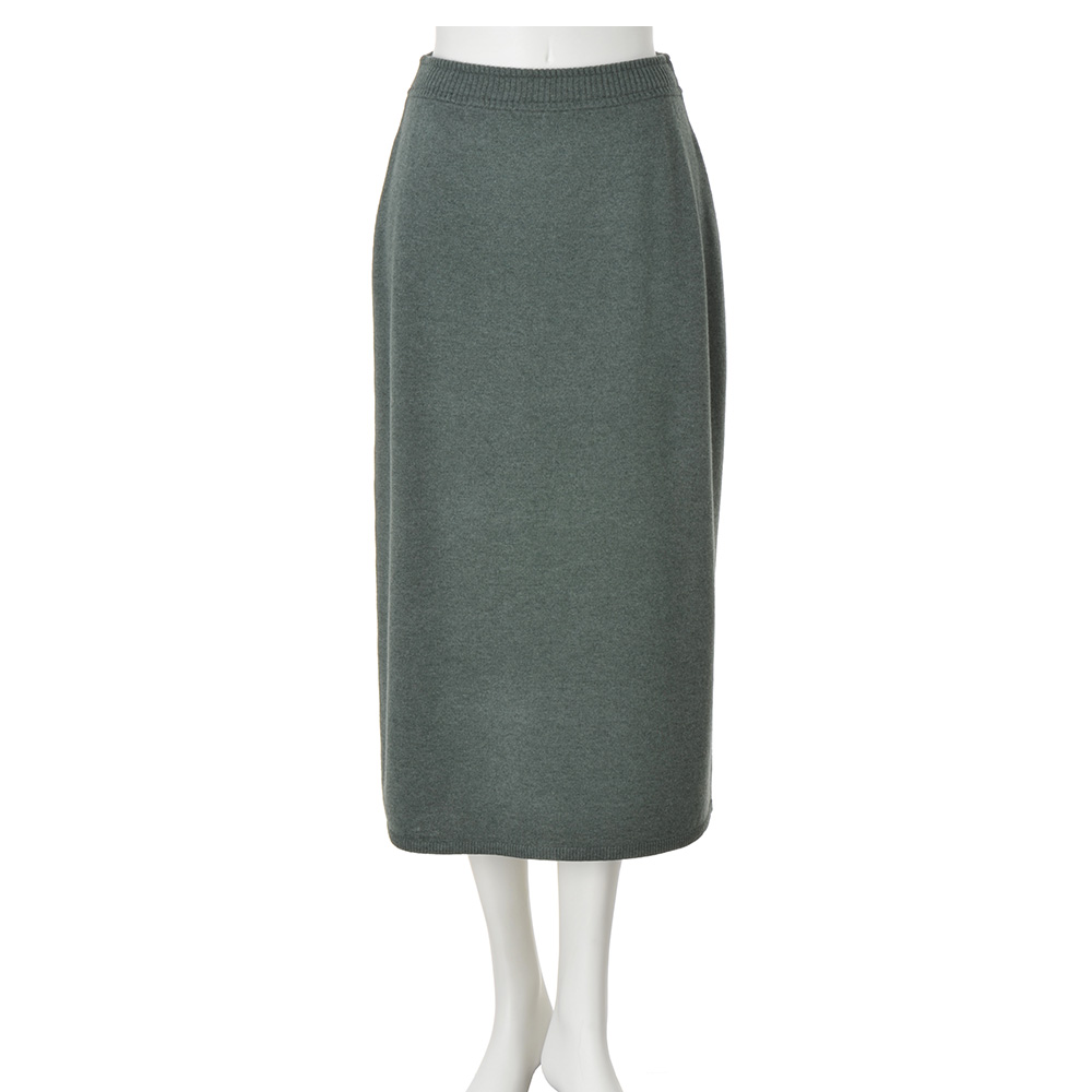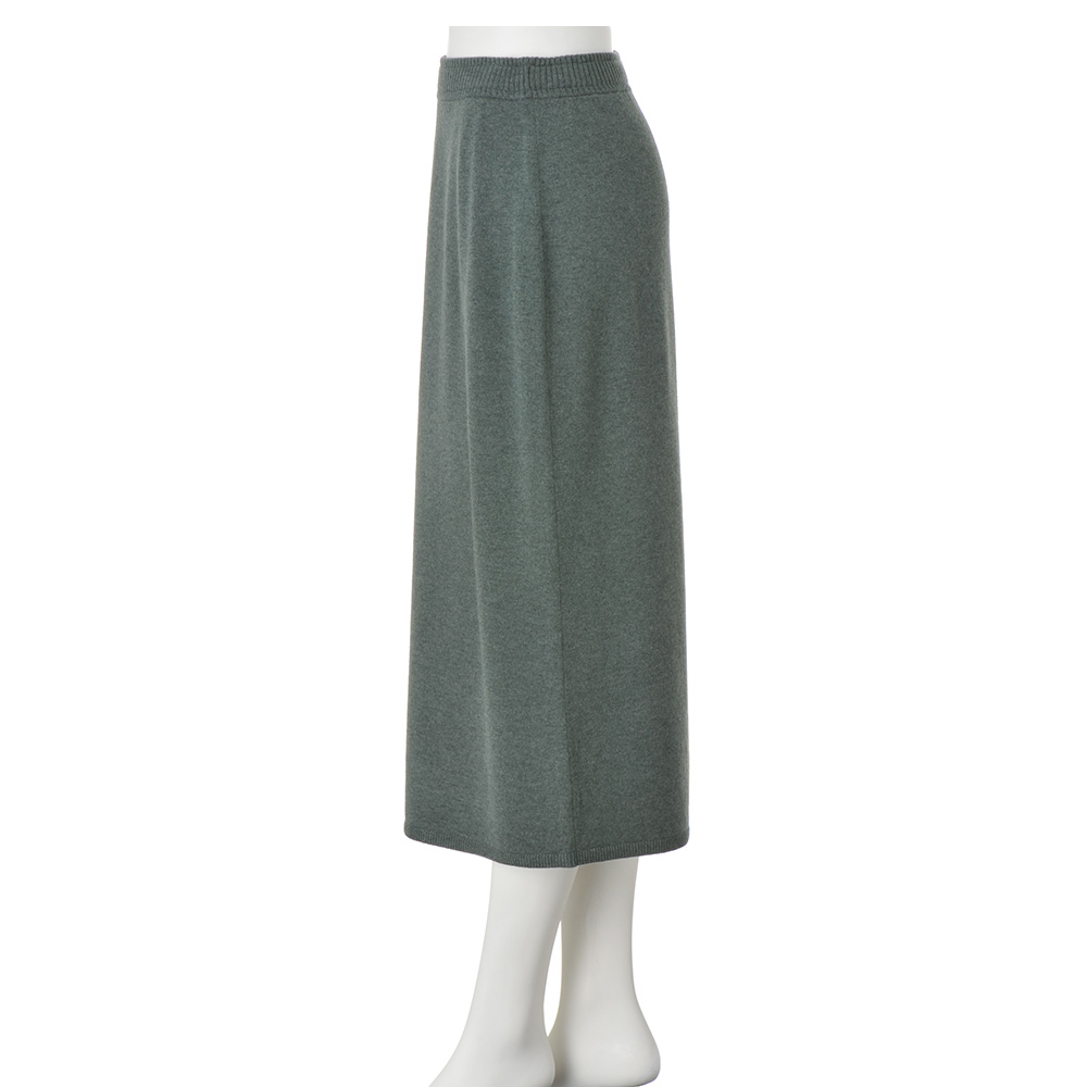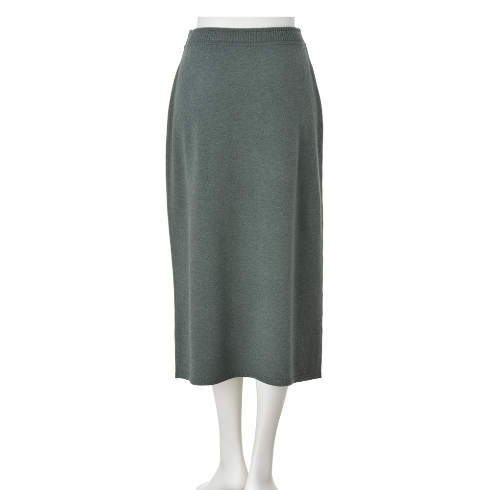 大人のハイカジュアルを3D刺しゅうのニットでミリタリーな雰囲気もある青銅色(スモーキーグリーン)のメランジニットで、大人のカジュアルに活躍するニットアイテムをつくりました。しっかりとした編み地は、高品質と名高いエクストラファインラムズウールの天竺編み。裾に向かってやや広げたソフトAラインですが、着用すると美しいストレートシルエットを描き、女性らしさをキープ。癒される色と凝った刺しゅう、すらりとしたシルエットがリラクシングな装いをスタイリッシュに変えます。≫ POINTシンプルできれいなラインのニットスカート。ダブル使いにしたリブのウエスト部分は中央にゴムを通し、あえてリブ先に遊びを持たせてカジュアルに。