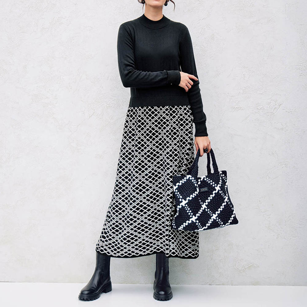 ニットの多彩な可能性をこの一着に込めて――。優しい着心地と着映え力で、大人のワードローブに欠かせないのがニットワンピースです。襟元はすっきりとした程良い高さのスタンドカラーに。身頃と袖はリブ編みに見えますが、じつは針抜きの総針編み。身体のラインを拾い過ぎず、縦方向の編み目がすらりと見せてくれる効果も。襟と袖口、上身頃の裾部分はリブ編みで引き締めて。さらに袖口はリブ部分を折り返してスリットを入れ、小さなボタンを一つあしらってノーブルにデザインしました。スカート部分はくっきりした柄と美しいシルエットを描出するため、袋ジャカード編みに。ウエストの裏側に平ゴムを付けることで、メリハリのあるシルエットをフォローしています。