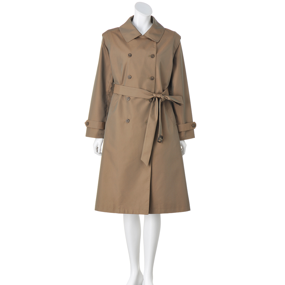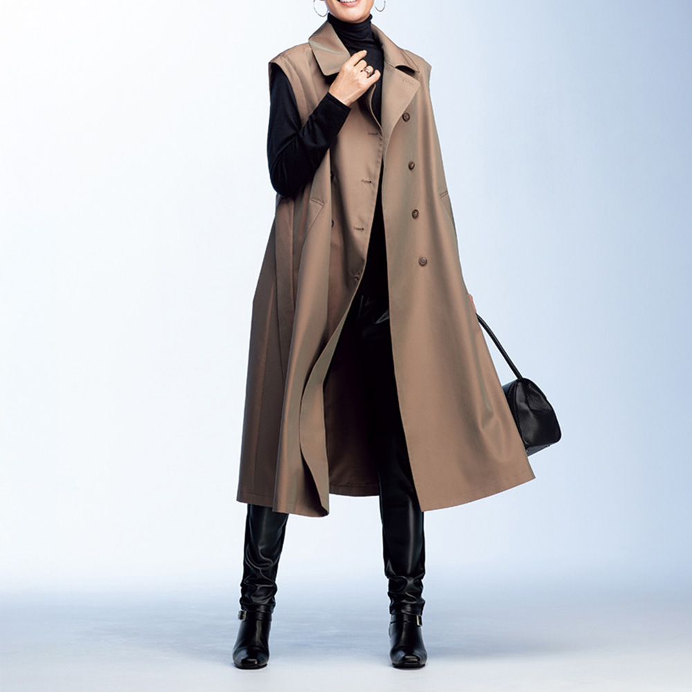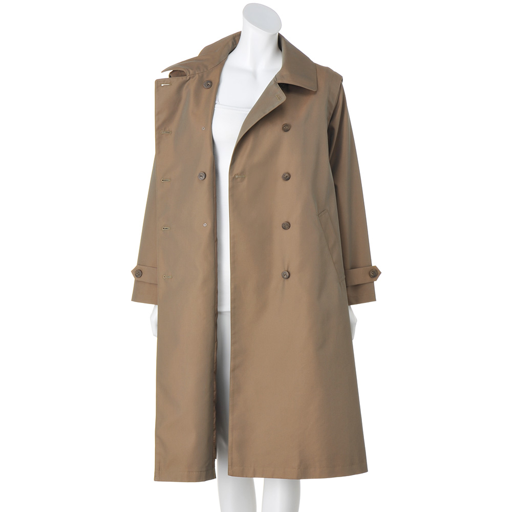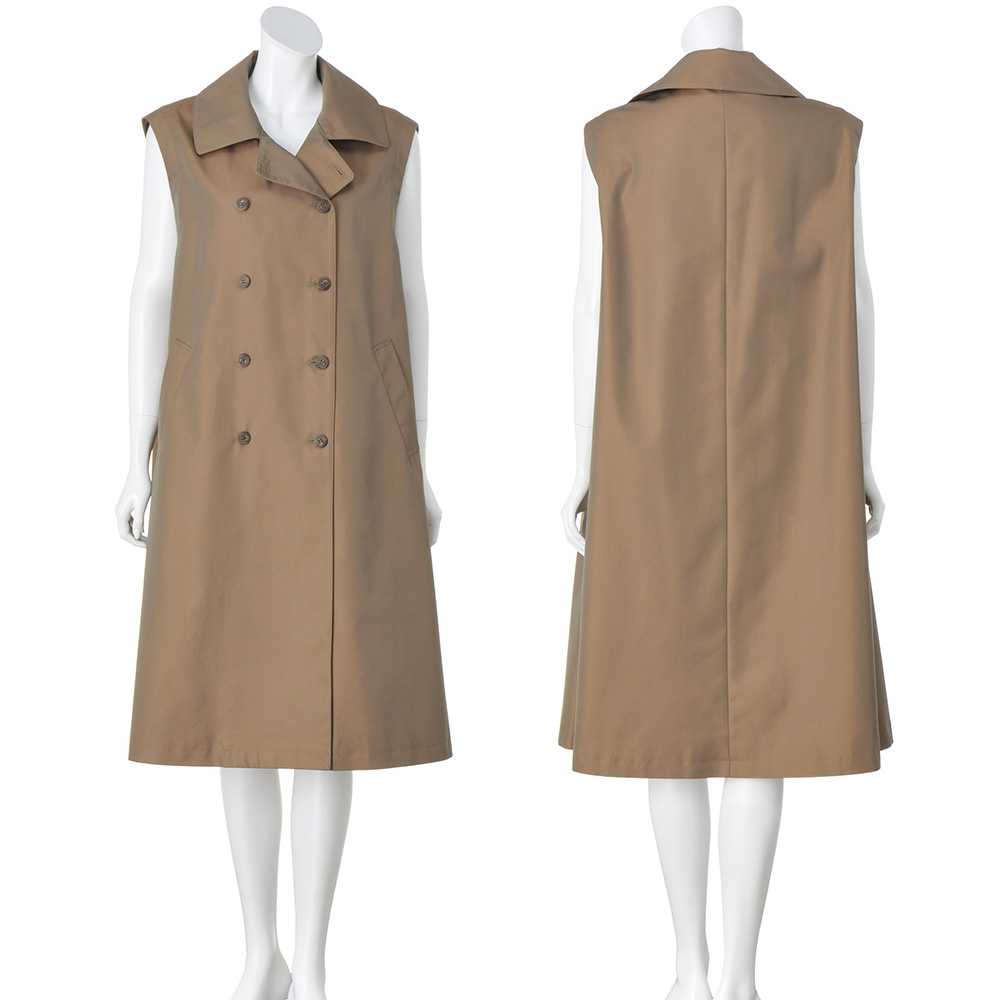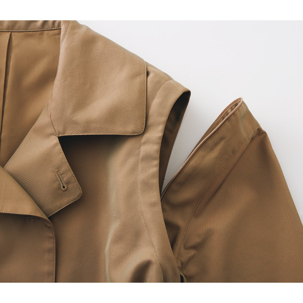 コートとして、ジレとして、ロングシーズン格好良く!端正なトレンチコートとして着られるだけでなく、袖を取り外してスリーブレスコートやロングジレ感覚で軽やかに羽織ることもできる優秀アウターの登場です。デザインはテーラードカラーのダブルブレストをベースに、マニッシュになりすぎないようディテールはシンプルに徹して。アレンジ力があるのは袖だけでなく、襟は首元のボタンを留めればステンカラーになり、ウエストベルトは長さがある分、多彩な結び方を楽しめます。生地はコットン糸とポリエステル糸を高密度で織り上げた、リッチな光沢感のシャンブレーツイル。サステナブルとはっ水機能を両立させた非フッ素系のはっ水加工も高ポイントです。≫ POINT袖ぐりにあしらわれたファスナーで袖を取り外せる仕様。身頃には同色の裏地付き。