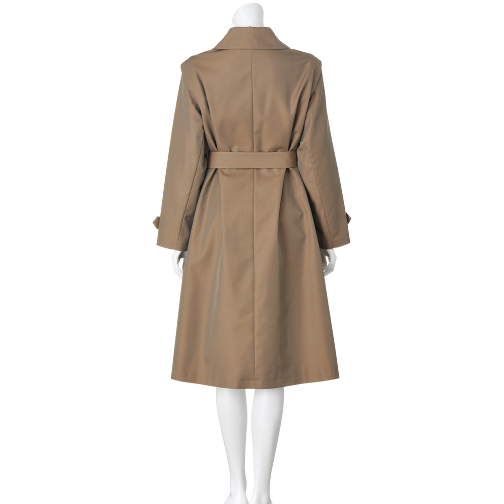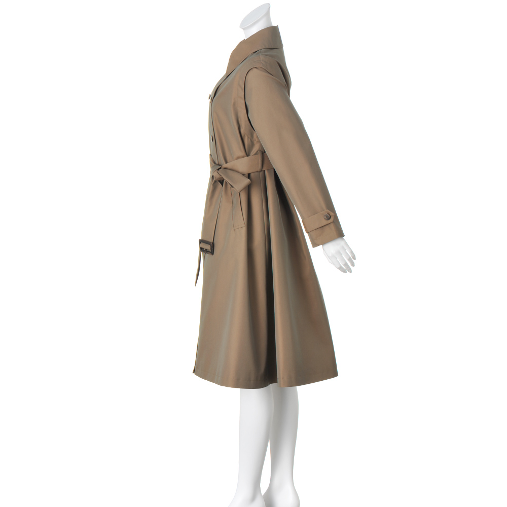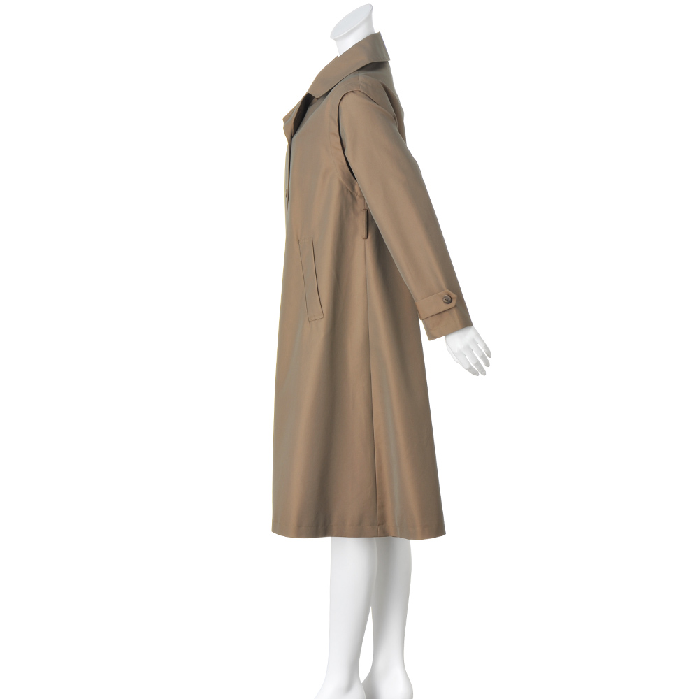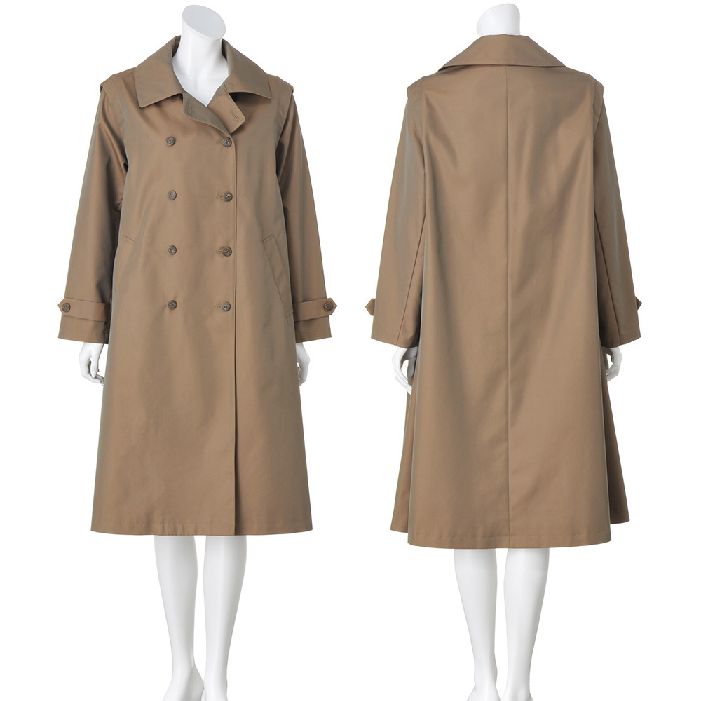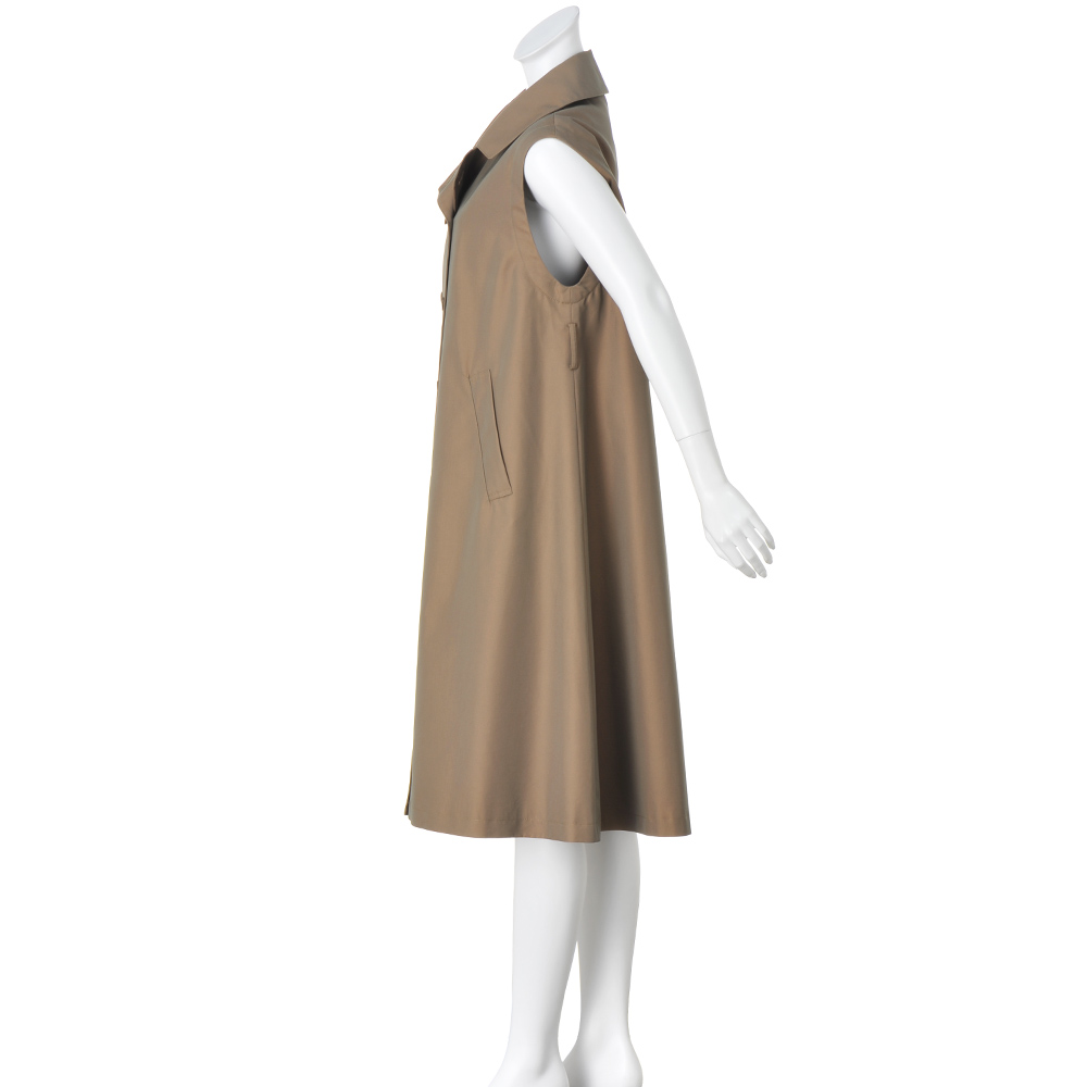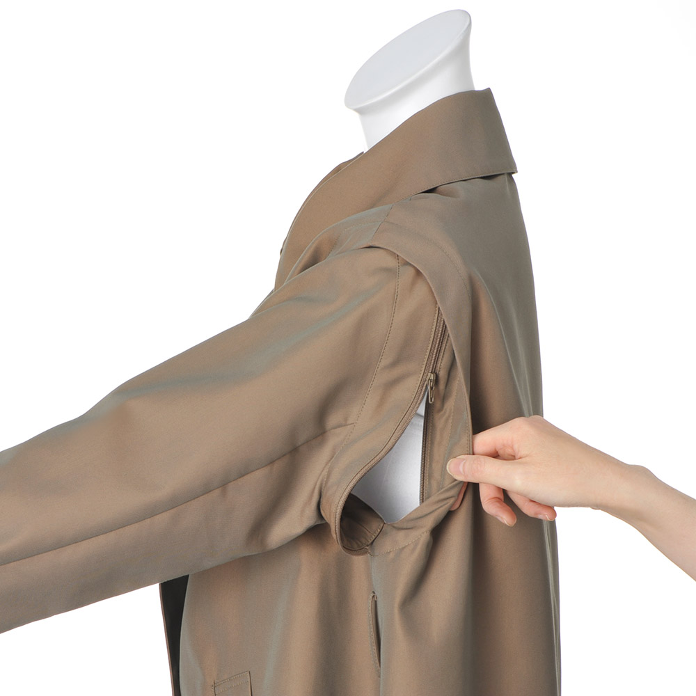 コートとして、ジレとして、ロングシーズン格好良く!端正なトレンチコートとして着られるだけでなく、袖を取り外してスリーブレスコートやロングジレ感覚で軽やかに羽織ることもできる優秀アウターの登場です。デザインはテーラードカラーのダブルブレストをベースに、マニッシュになりすぎないようディテールはシンプルに徹して。アレンジ力があるのは袖だけでなく、襟は首元のボタンを留めればステンカラーになり、ウエストベルトは長さがある分、多彩な結び方を楽しめます。生地はコットン糸とポリエステル糸を高密度で織り上げた、リッチな光沢感のシャンブレーツイル。サステナブルとはっ水機能を両立させた非フッ素系のはっ水加工も高ポイントです。≫ POINT袖ぐりにあしらわれたファスナーで袖を取り外せる仕様。身頃には同色の裏地付き。
