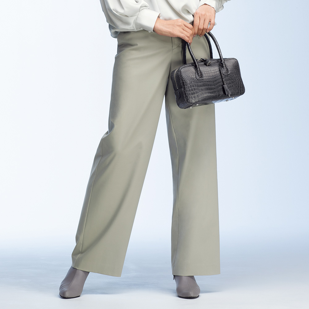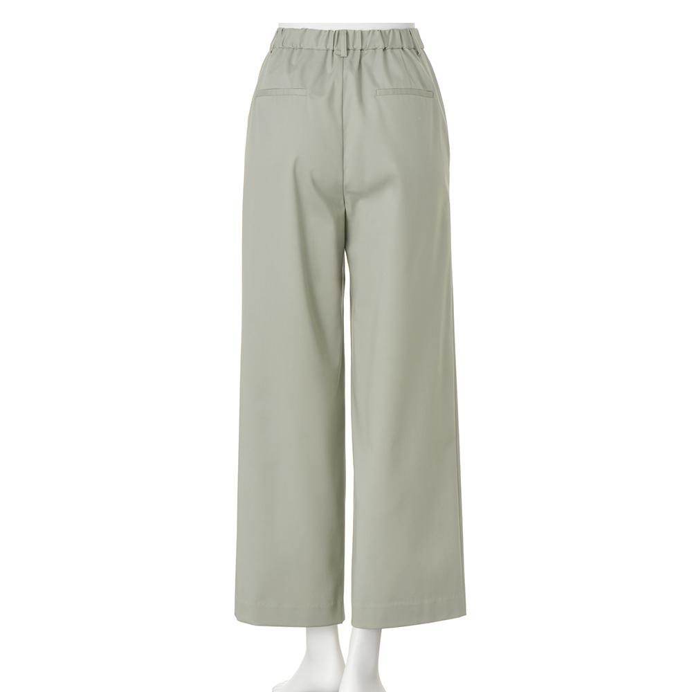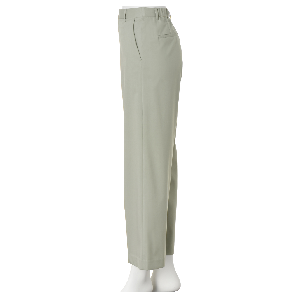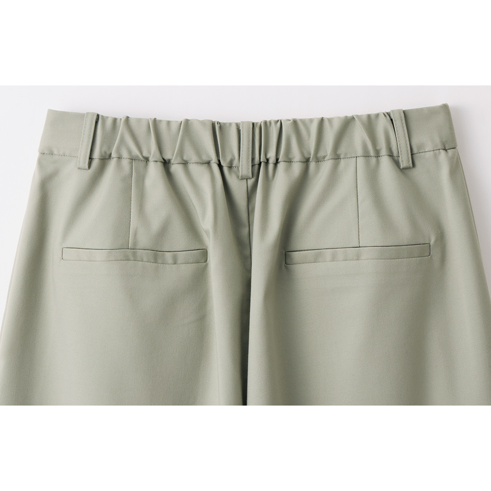 今っぽいライトカーキ色のセミワイドパンツは、毛羽立ちを抑えたサイロスパン糸を織り上げたクリアな表面感がきれいめな印象。膝から裾に向かってスッと落とした美脚ストレートラインも秀逸。やや深めの股上と後ろウエストのゴムで、ホールド感のあるはき心地です。≫ POINT後ろウエスト中央にゴムギャザー入り。飾りの片玉縁ポケットが後ろ姿に端正さを添えるポイント。