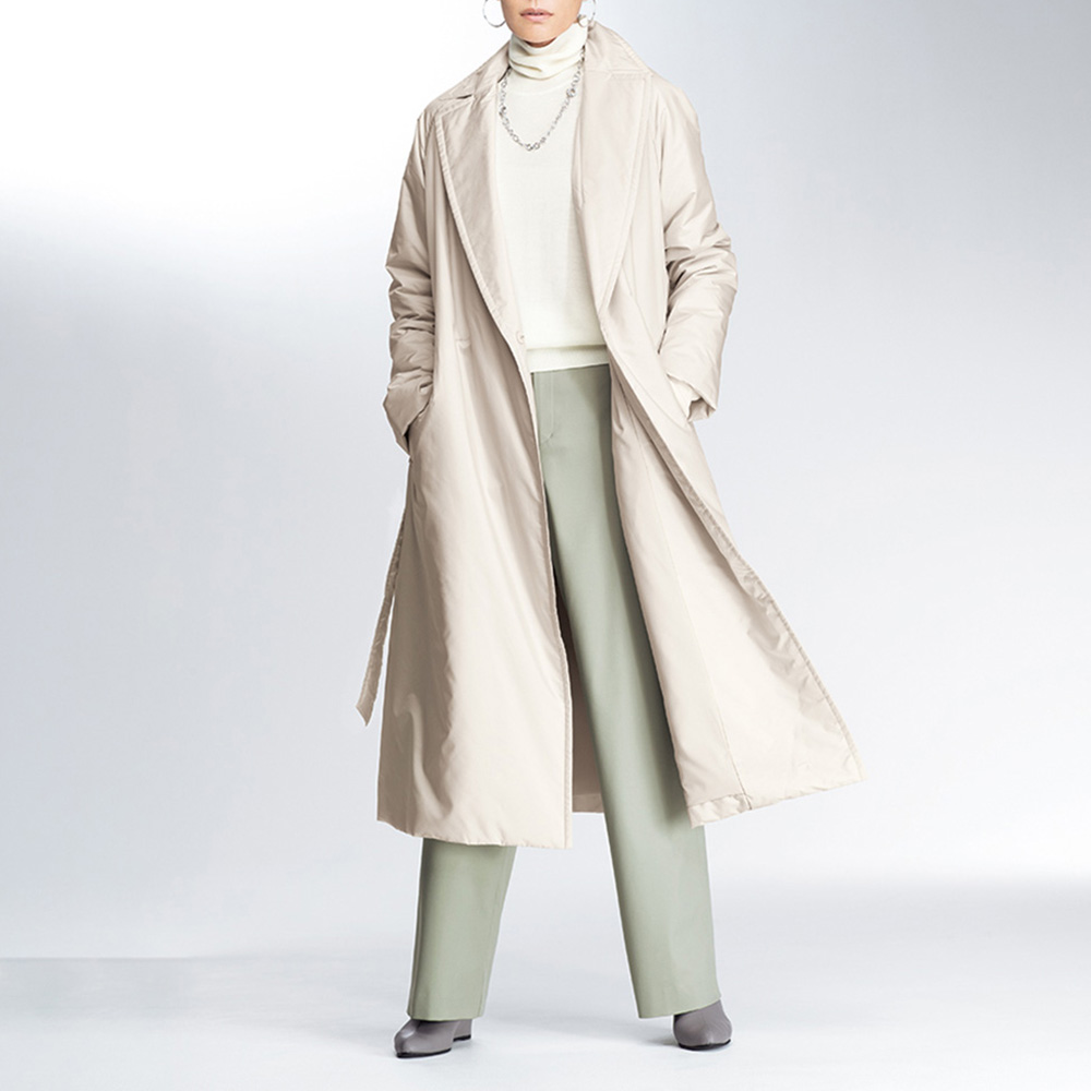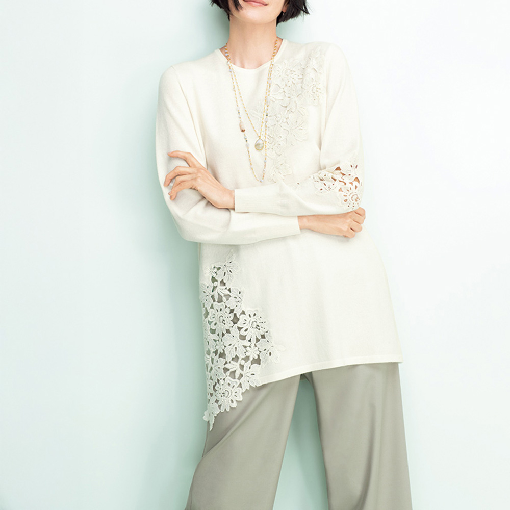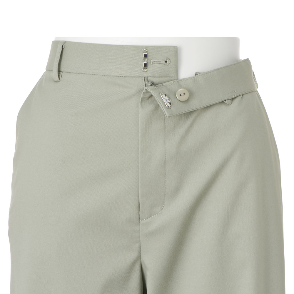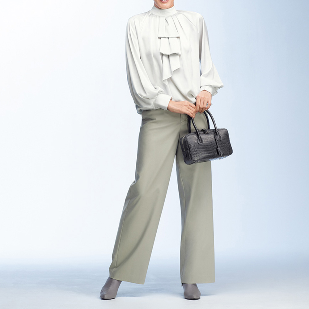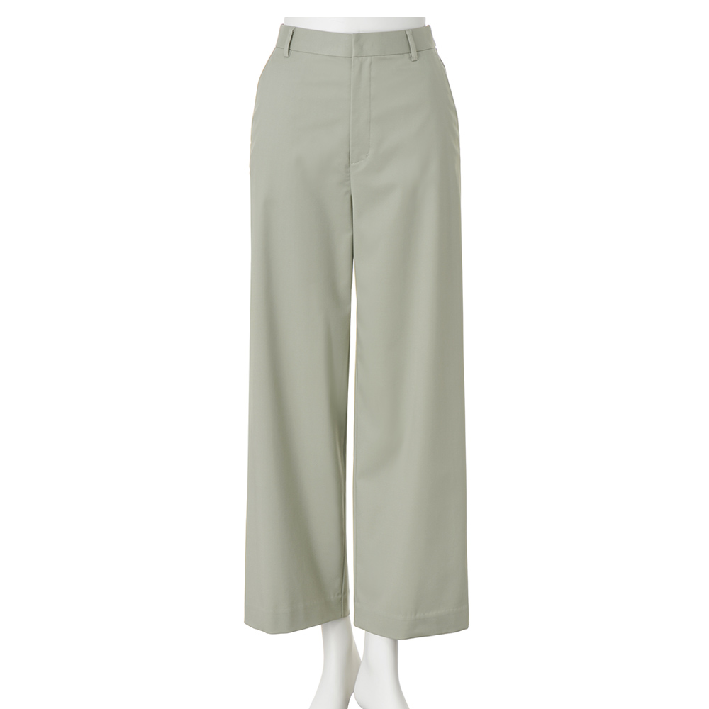 今っぽいライトカーキ色のセミワイドパンツは、毛羽立ちを抑えたサイロスパン糸を織り上げたクリアな表面感がきれいめな印象。膝から裾に向かってスッと落とした美脚ストレートラインも秀逸。やや深めの股上と後ろウエストのゴムで、ホールド感のあるはき心地です。≫ POINT後ろウエスト中央にゴムギャザー入り。飾りの片玉縁ポケットが後ろ姿に端正さを添えるポイント。