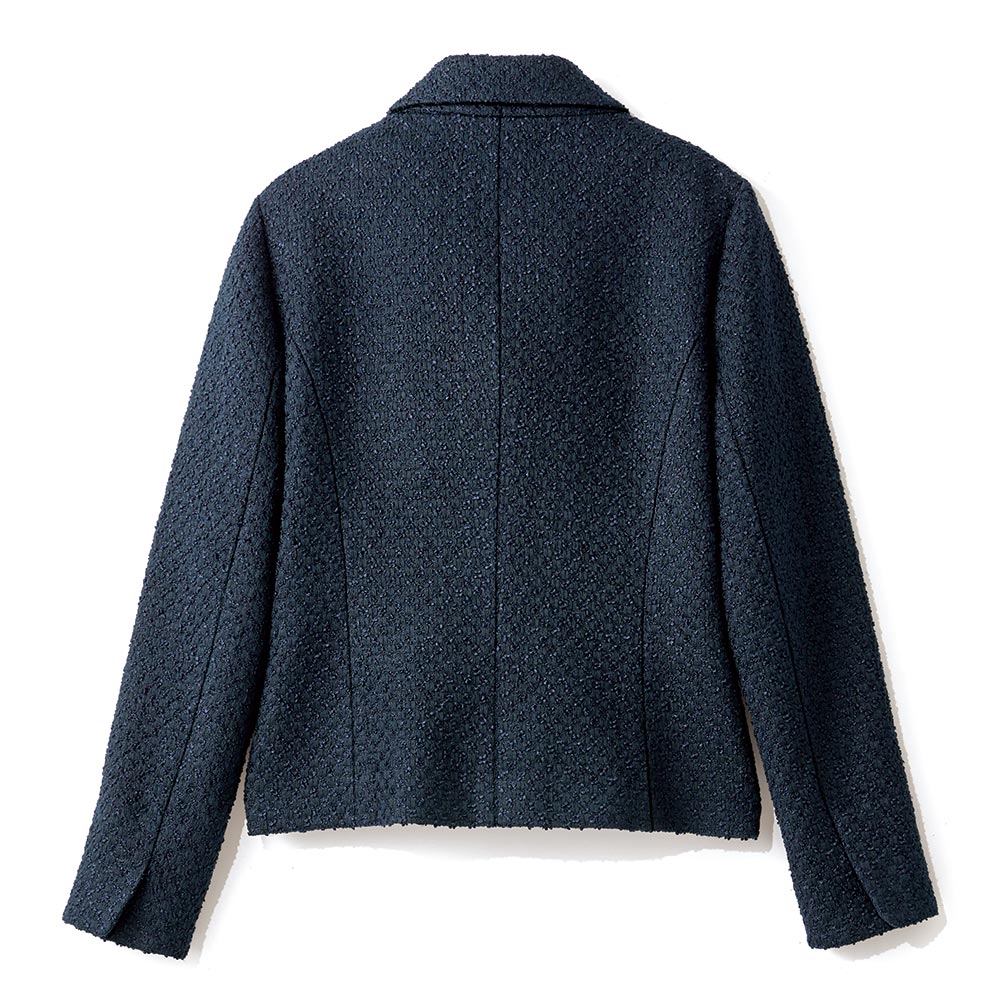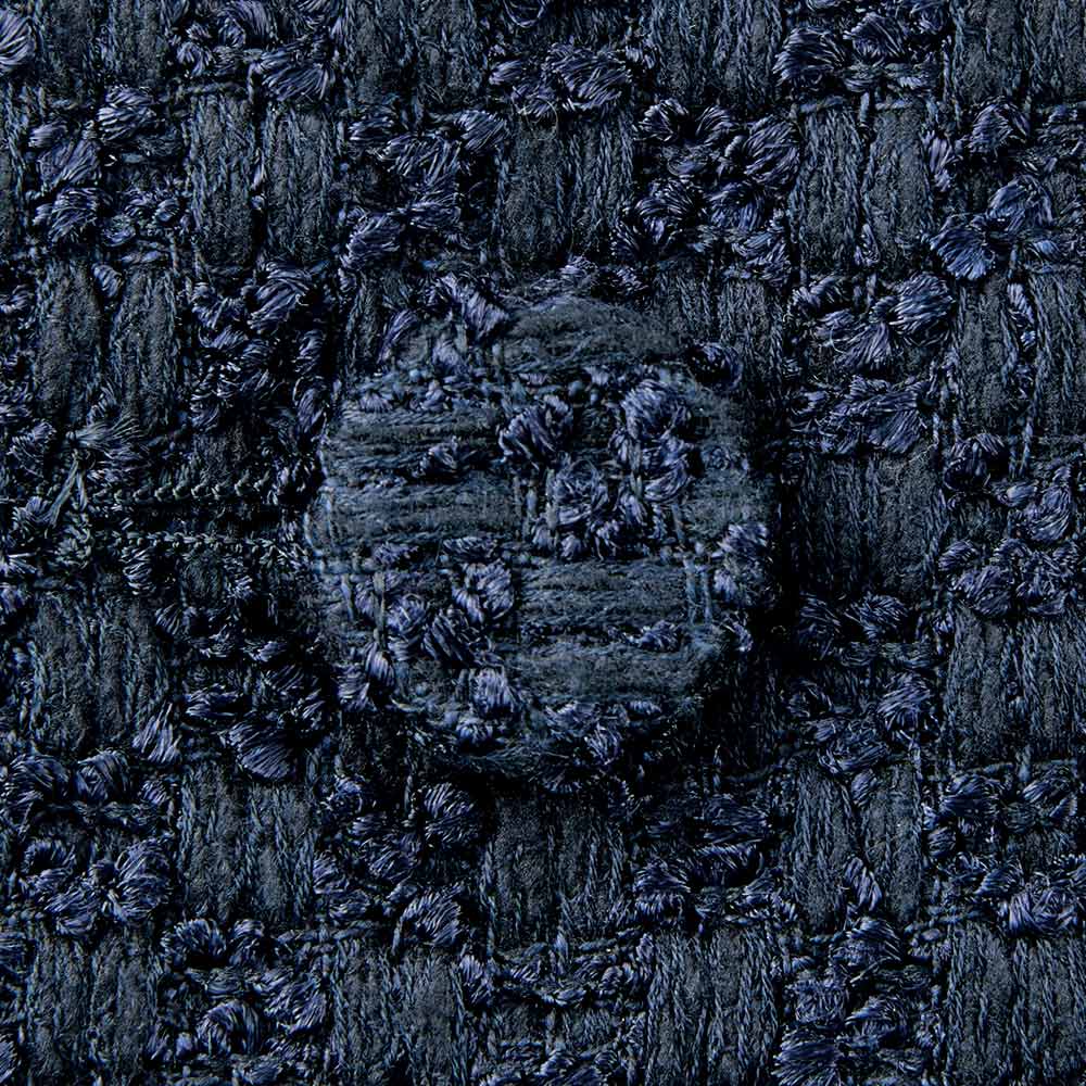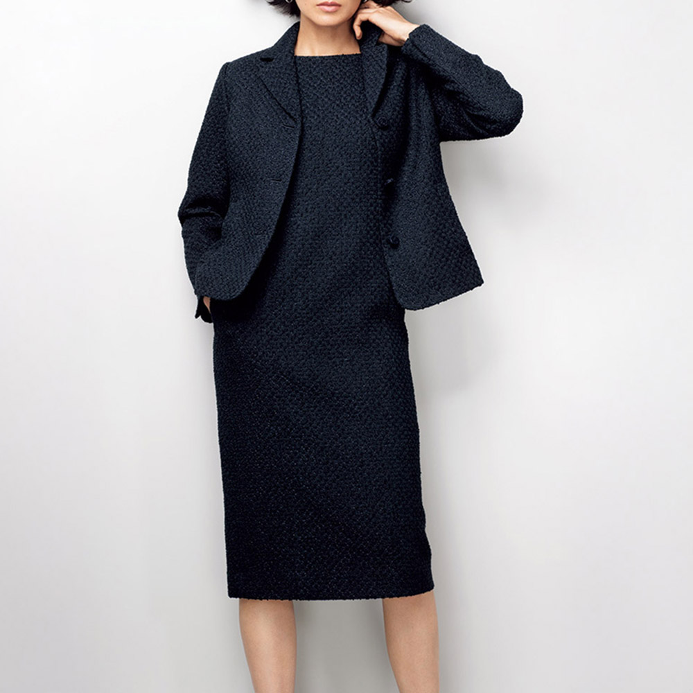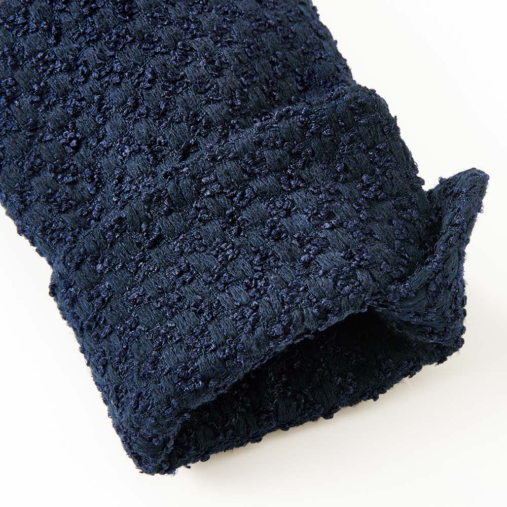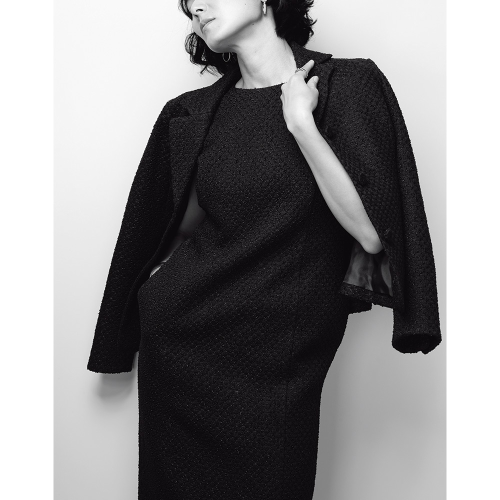 「FERLA」の美意識をセットアップで満喫!オーセンティックでありながら現代的なラグジュアリー感も表現したい…。選んだ素材は、イタリア「FERLA」社が手がけたダークネイビーの格子柄ツイード素材。レーヨン・麻・綿・シルク・ナイロンを洗練された感性でブレンドした2種類の意匠糸がリッチな風合いと柔らかな立体感、繊細な陰影を表現。装飾をそぎ落としたデザインを格上の洗練へと導きます。ジャケットは、高めの位置に配したテーラードカラーとソフトなシェイプシルエットが優雅なスタイルアップ効果を発揮。引き算の美学に徹したくるみボタンや機能性に配慮したポケットがクチュールライクな存在感を放ちます。POINTくるみボタンでクラシカルな気品を演出。合わせるジュエリーや小物を限定しないのも優秀ポイントです。スリット入りの袖口は幅広に折り返して着られる仕様。手首を華奢に見せる九分袖にアレンジできます。