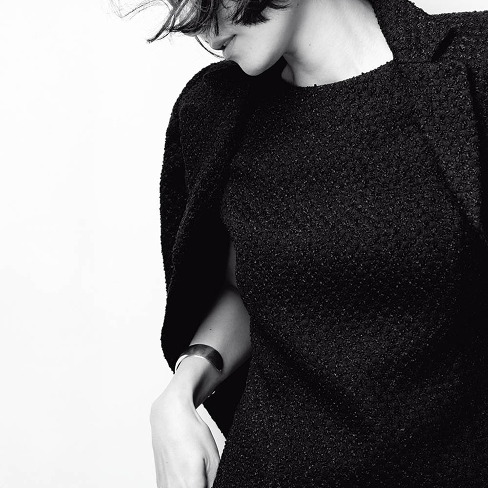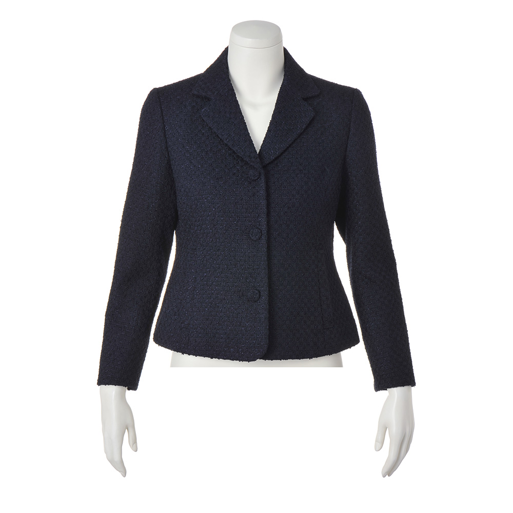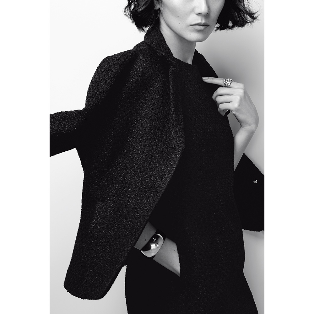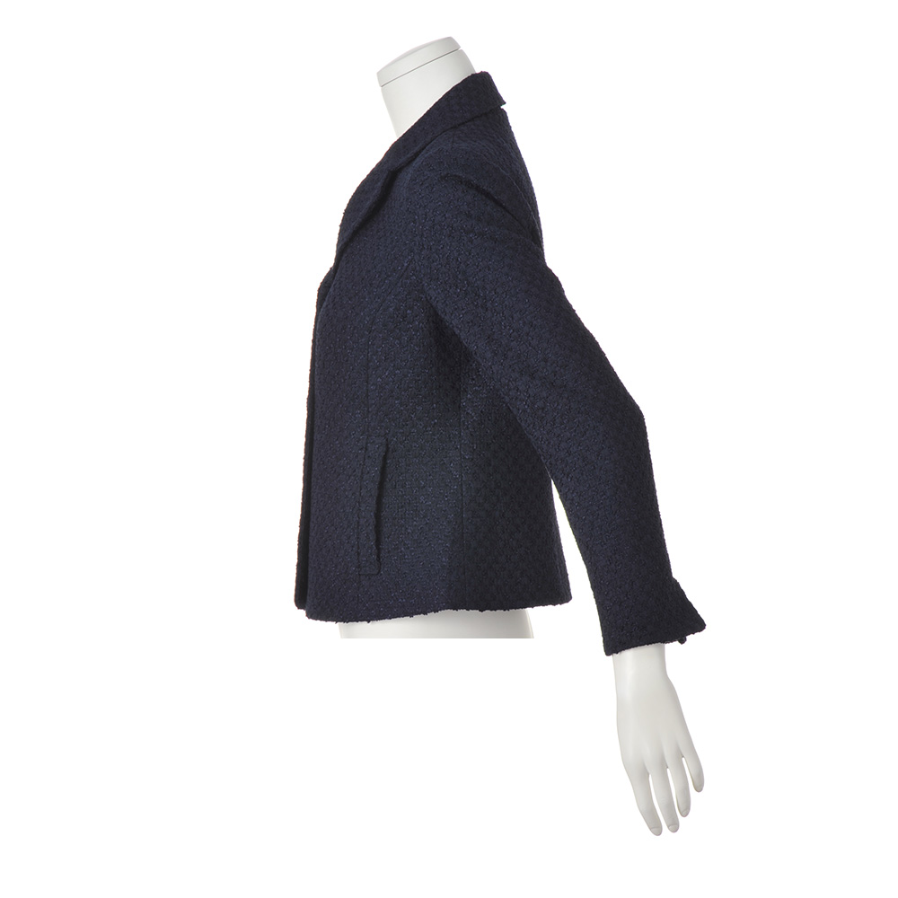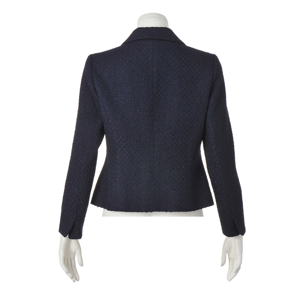 「FERLA」の美意識をセットアップで満喫!オーセンティックでありながら現代的なラグジュアリー感も表現したい…。選んだ素材は、イタリア「FERLA」社が手がけたダークネイビーの格子柄ツイード素材。レーヨン・麻・綿・シルク・ナイロンを洗練された感性でブレンドした2種類の意匠糸がリッチな風合いと柔らかな立体感、繊細な陰影を表現。装飾をそぎ落としたデザインを格上の洗練へと導きます。ジャケットは、高めの位置に配したテーラードカラーとソフトなシェイプシルエットが優雅なスタイルアップ効果を発揮。引き算の美学に徹したくるみボタンや機能性に配慮したポケットがクチュールライクな存在感を放ちます。POINTくるみボタンでクラシカルな気品を演出。合わせるジュエリーや小物を限定しないのも優秀ポイントです。スリット入りの袖口は幅広に折り返して着られる仕様。手首を華奢に見せる九分袖にアレンジできます。