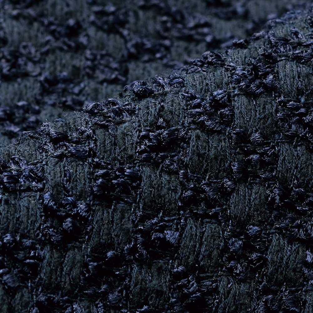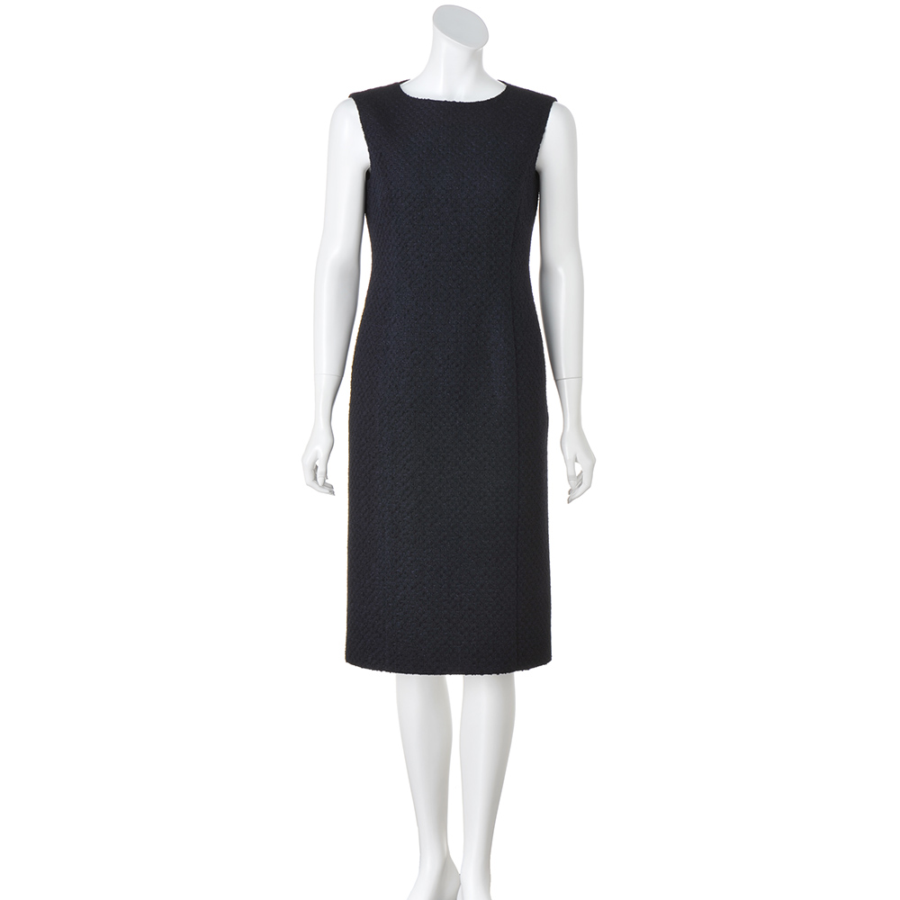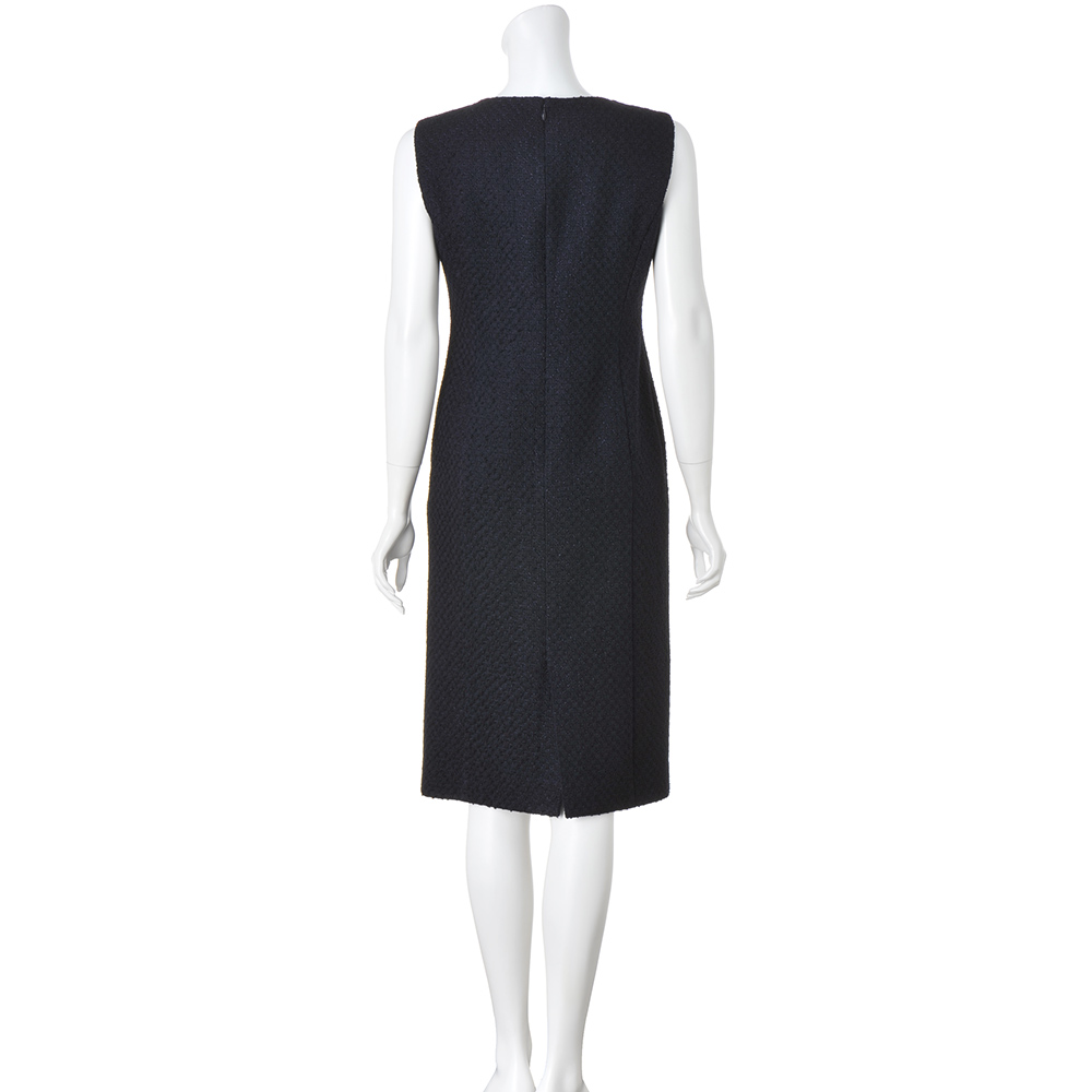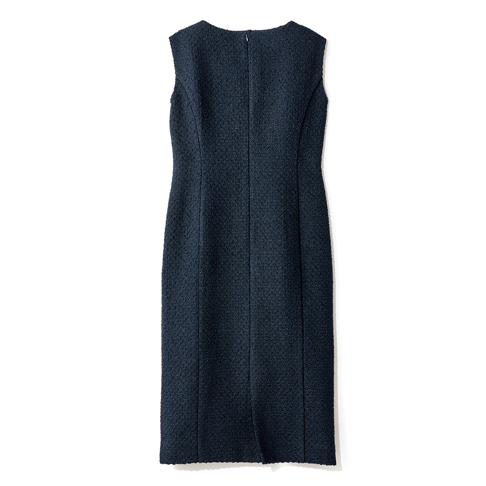 「FERLA」の美意識をセットアップで満喫!オーセンティックでありながら現代的なラグジュアリー感も表現したい…。選んだ素材は、イタリア「FERLA」社が手がけたダークネイビーの格子柄ツイード素材。レーヨン・麻・綿・シルク・ナイロンを洗練された感性でブレンドした2種類の意匠糸がリッチな風合いと柔らかな立体感、繊細な陰影を表現。装飾をそぎ落としたデザインを格上の洗練へと導きます。ワンピースは、すっきりとしたタイトラインでレディライクな品格を表現。大人をきれいに見せるバランスを計算したボートネックとフレンチスリーブだから、ジャケットインでも一枚でも絵になる出来栄えです。POINTマットなテープヤーンと光沢のあるリングヤーンを使ったダークネイビーの格子柄ツイード。クールな陰影が装いの印象を高めます。