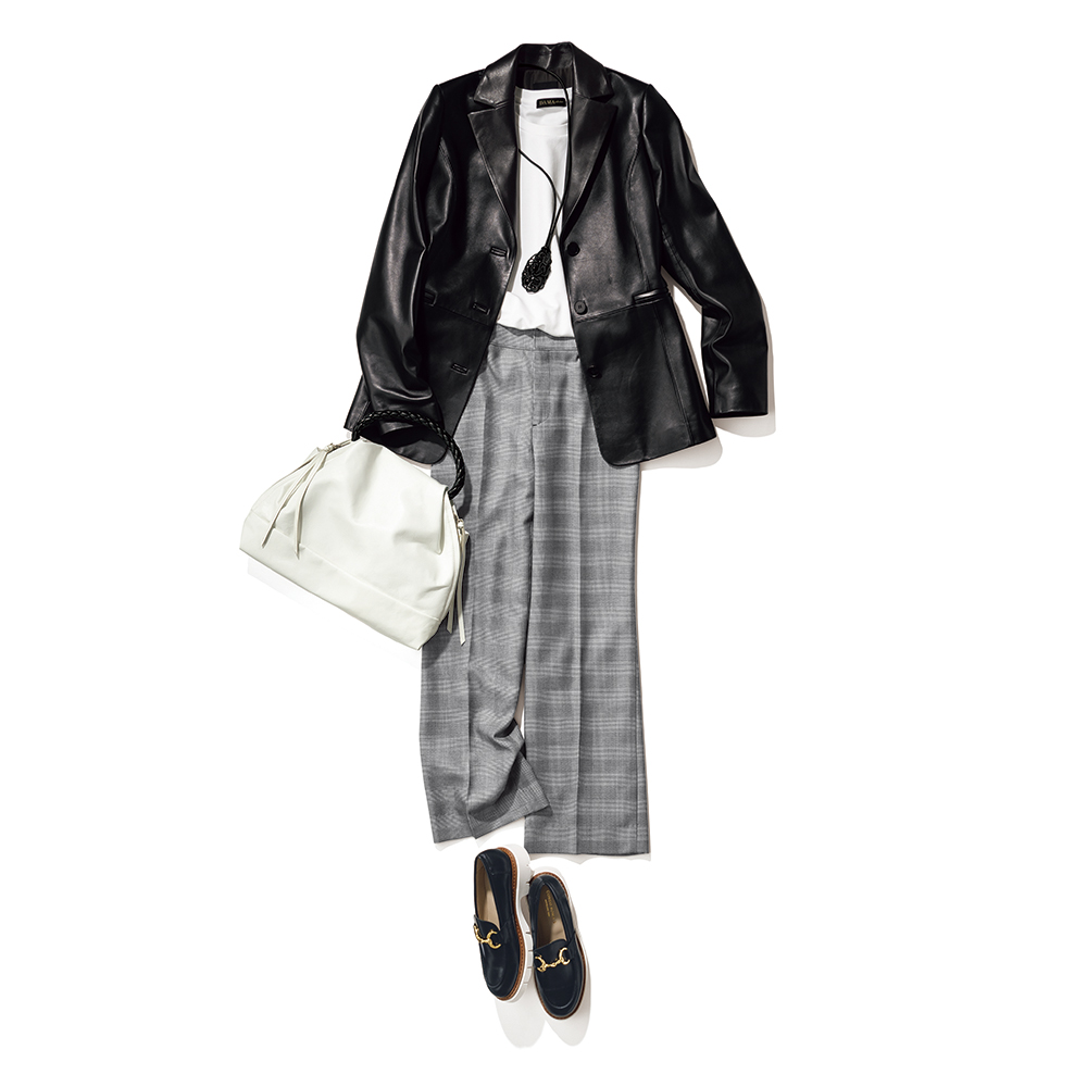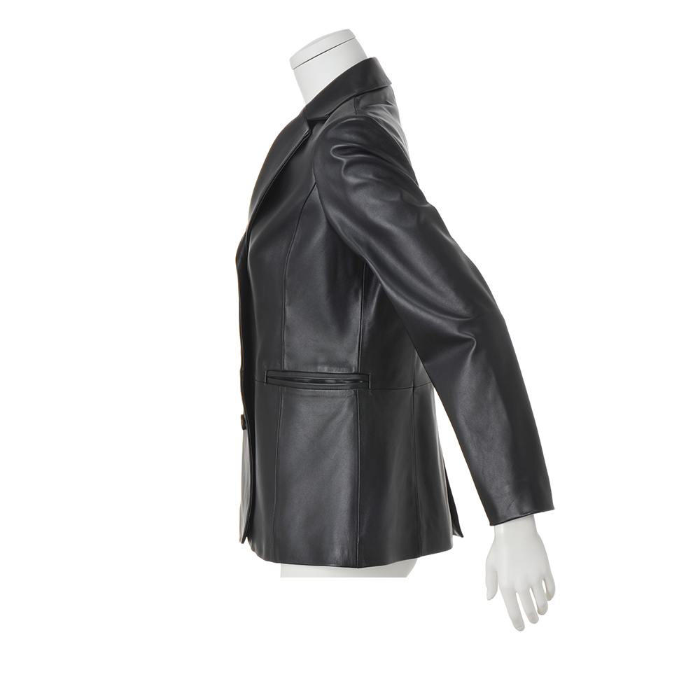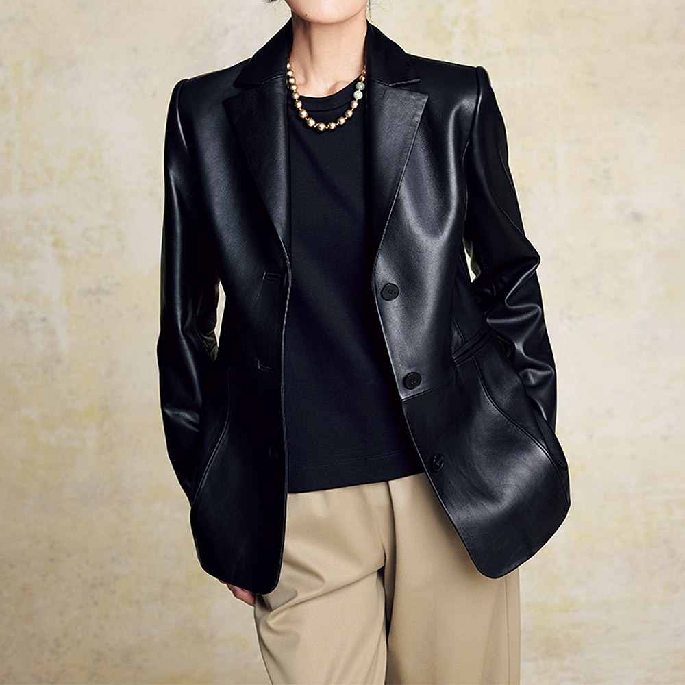 レザージャケットで格好いい大人の女性を自負したい。一着あると心強いレザージャケットを、正統派のテーラードに仕立てました。優しい表情のレザーは老舗タンナリー「コロメル」社による染料仕上げのラムレザー。ナチュラルなスキンの風合いを活かした繊細な染めによる、一点一点表情の異なる仕上がりに目を奪われます。着た瞬間から身体になじむしっとり柔らかな着心地は、上質レザーの真骨頂。ほんのりウエストシェイプして、パネルラインで切り替えた構築的なフォルムにも女性らしさが感じられて。≫ POINT染料でナチュラルに仕上げた“ネイキッド”ラムスキンの柔らかな風合いにうっとり。黒レザーのハードさが和らぎ、優しい表情に。