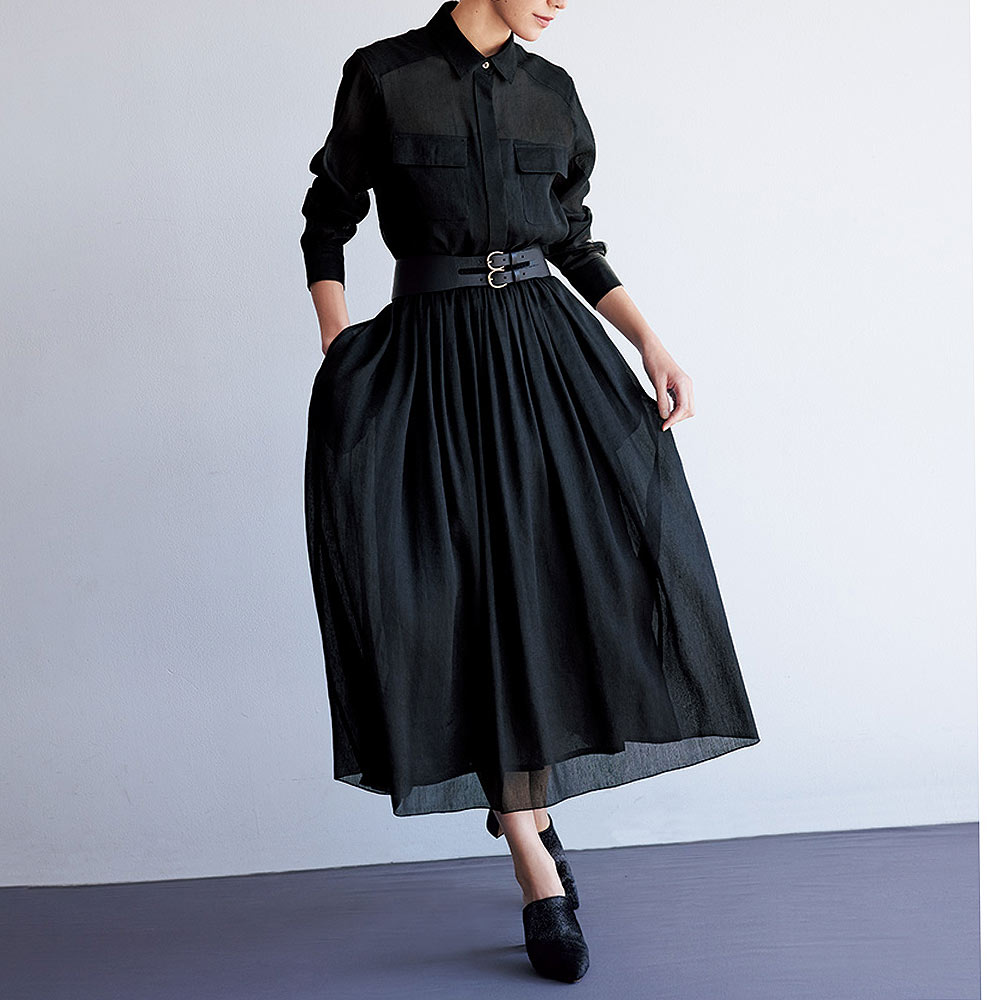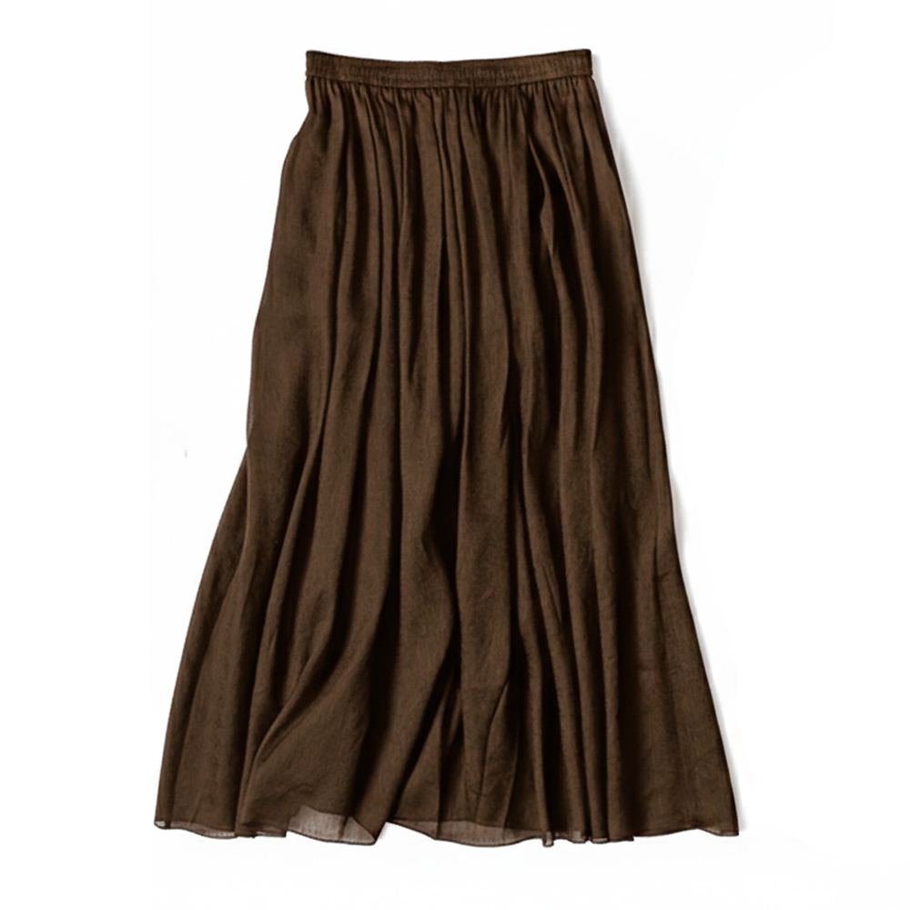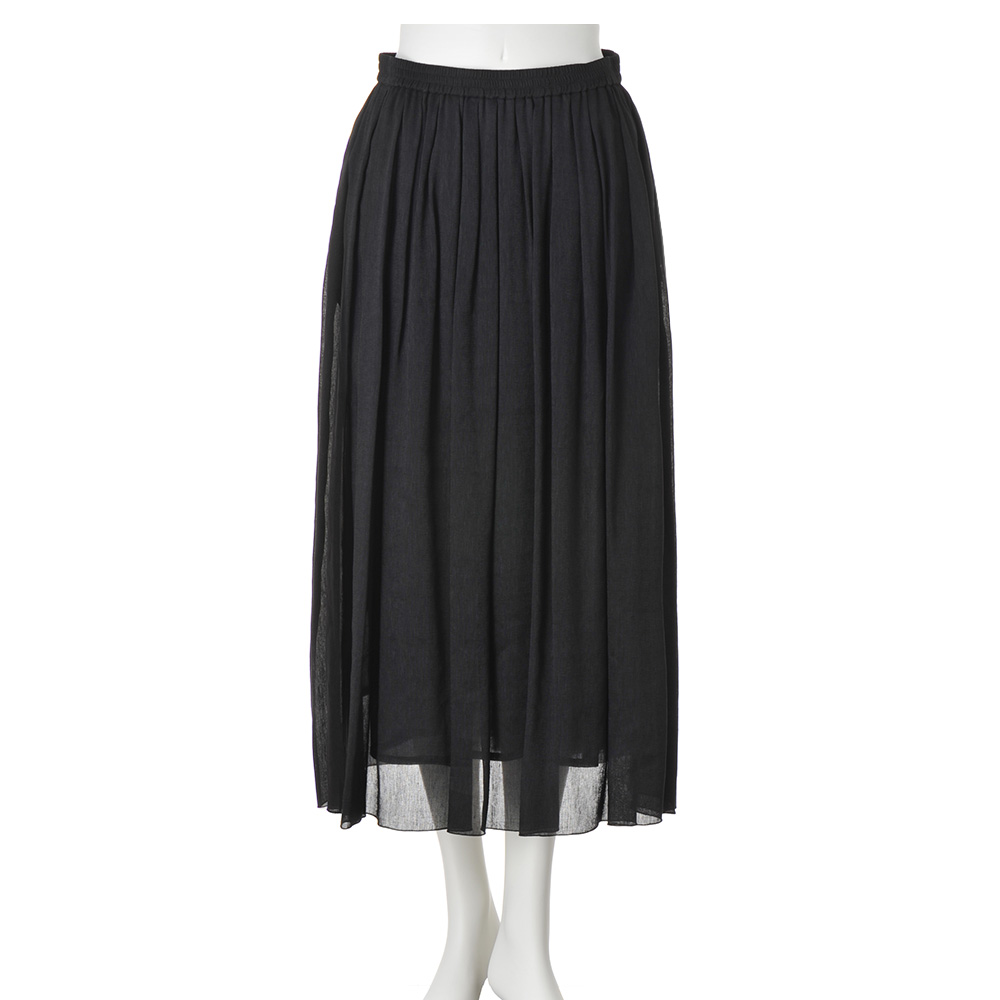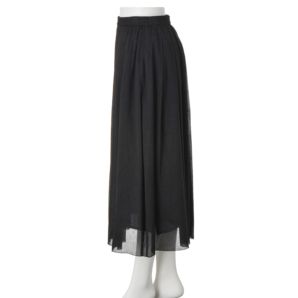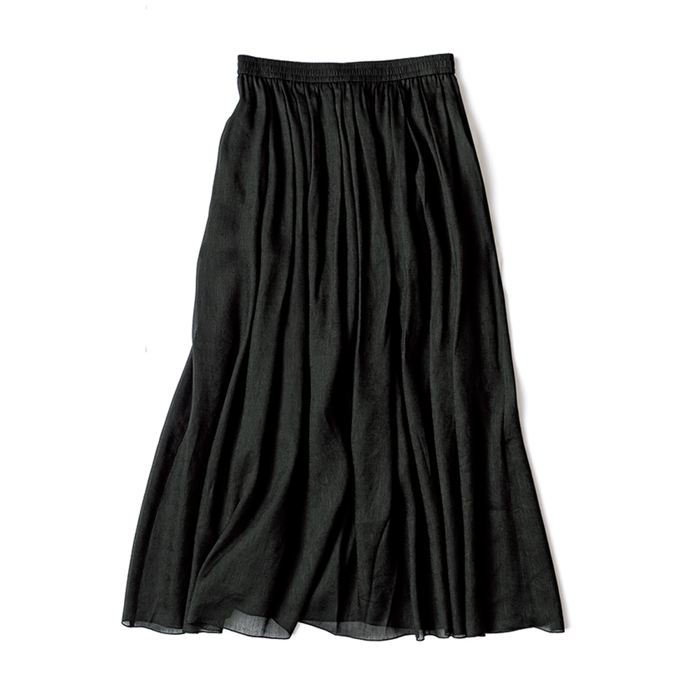 光と風と戯れながら涼やかに過ごすリネンシルクスタイル。程良い光沢とハリ感、透け感で快適に過ごせる人気素材。ウエストは前後にタックを使い、膨らみをカバーしながら美しい落ち感を表現するギャザーシルエット。裾はメローミシン始末で揺れ感がきれいです。総ゴム仕様のプルオンタイプ。≫ POINT経糸にシルク、緯糸にリネン。繊細な糸を時間をかけて高密度に織り上げたドビー織り。繊細な生地で、たっぷりのギャザーフレアーが膨らみすぎず軽やか。メロー始末にした裾が優雅。
