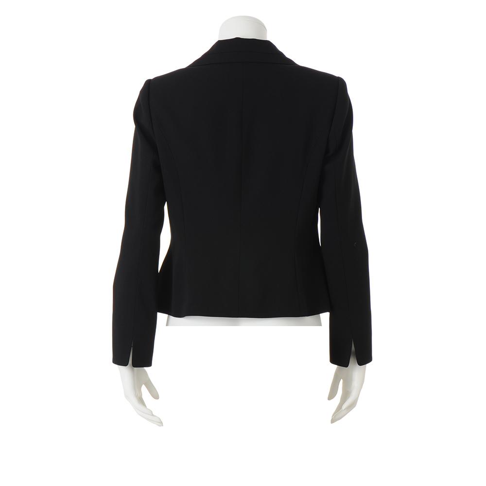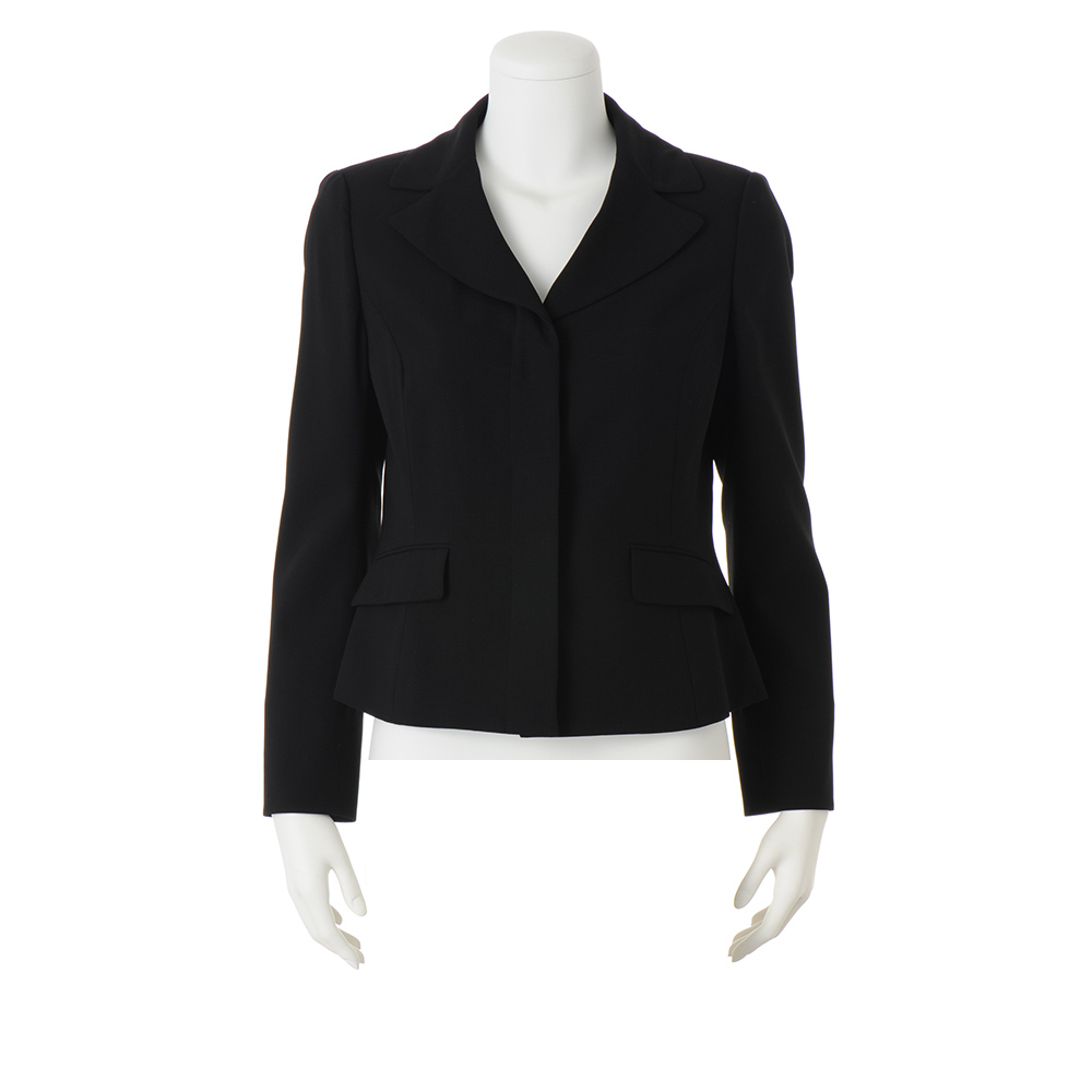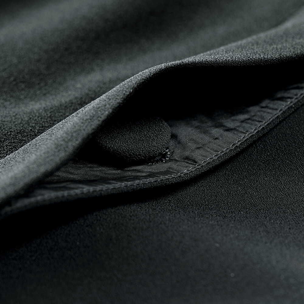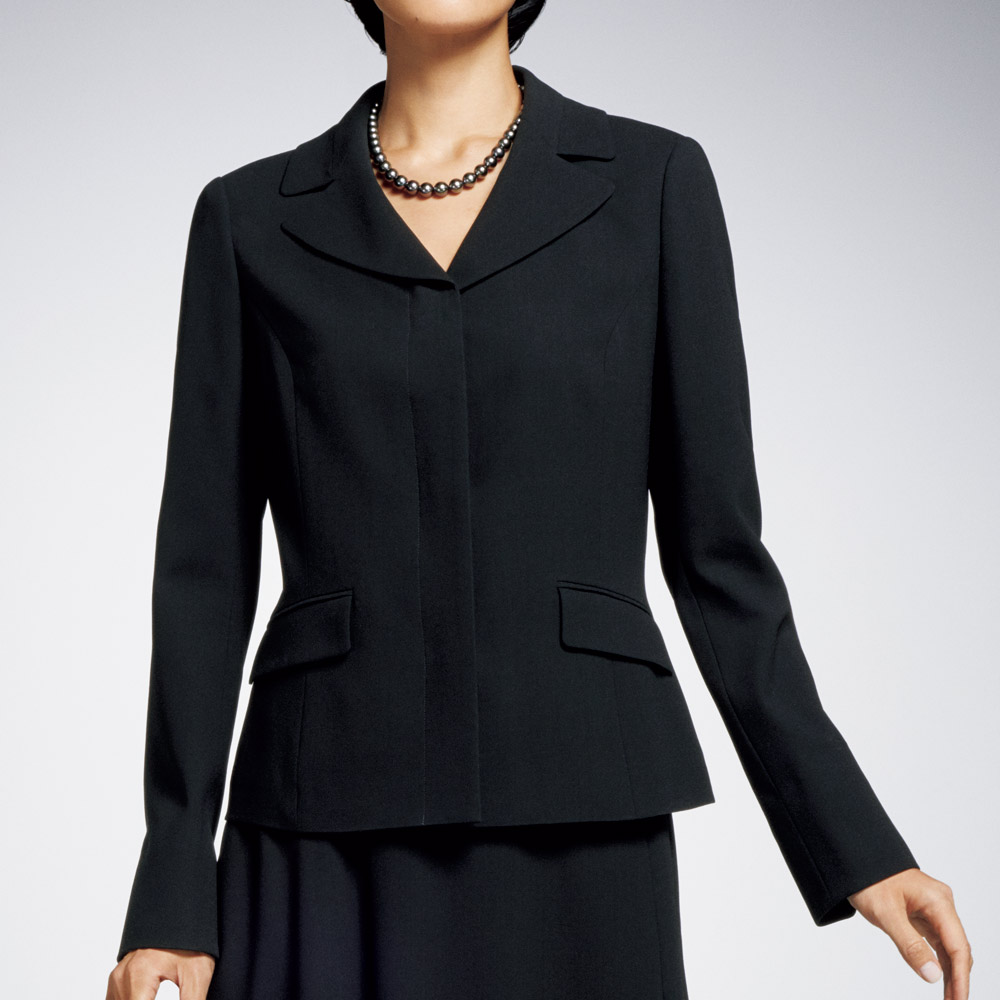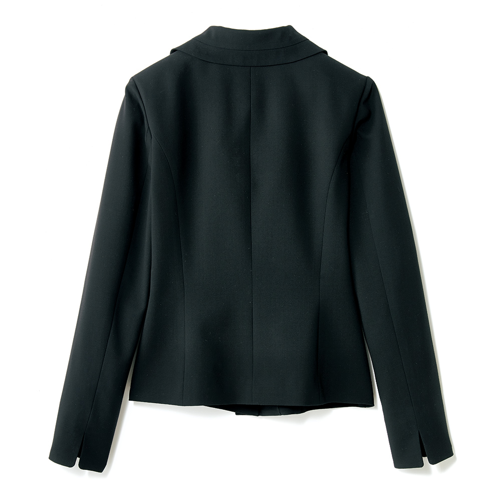 大人ブラック──美しさに目覚める服ブラック──。纏う人の内面の輝きを引き立てる色。繊細さと強さを併せ持つ色。比類のない優美さに満ちた色。そうした独特の存在感を余すところなく表現したのが、今回のブラックコレクション。素材は、日本毛織(株)の希少な「MAF(マフ)」を使ったクレープジョーゼット。着こなせば、自分の美しさに目覚めます。洗練のシルエットで纏うブラックスタイルブラックスタイルだからこそ際立つ美しいシルエットに注目。ジャケットの襟は優しいカーブを描き、丸みを持たせたクラシカルな表情。両脇にパネルを配して立体的に絞ったウエストは、ボトムを選ばずバランスよく着こなす決め手です。素材は、ニュージーランドの希少なメリノウール“MAFクレープジョーゼット”。シボ感があり、柔らかくしなやかで、ドレープ性にも優れ、しわになりにくいのも魅力。二度染めしたスーパーブラックの深みのある黒が、洗練されたデザインをシックに引き立てます。≫ POINT前立てはくるみボタンの比翼仕立てで、すっきりとした印象に。さりげなくモード感を醸し出す、技ありデザイン。
