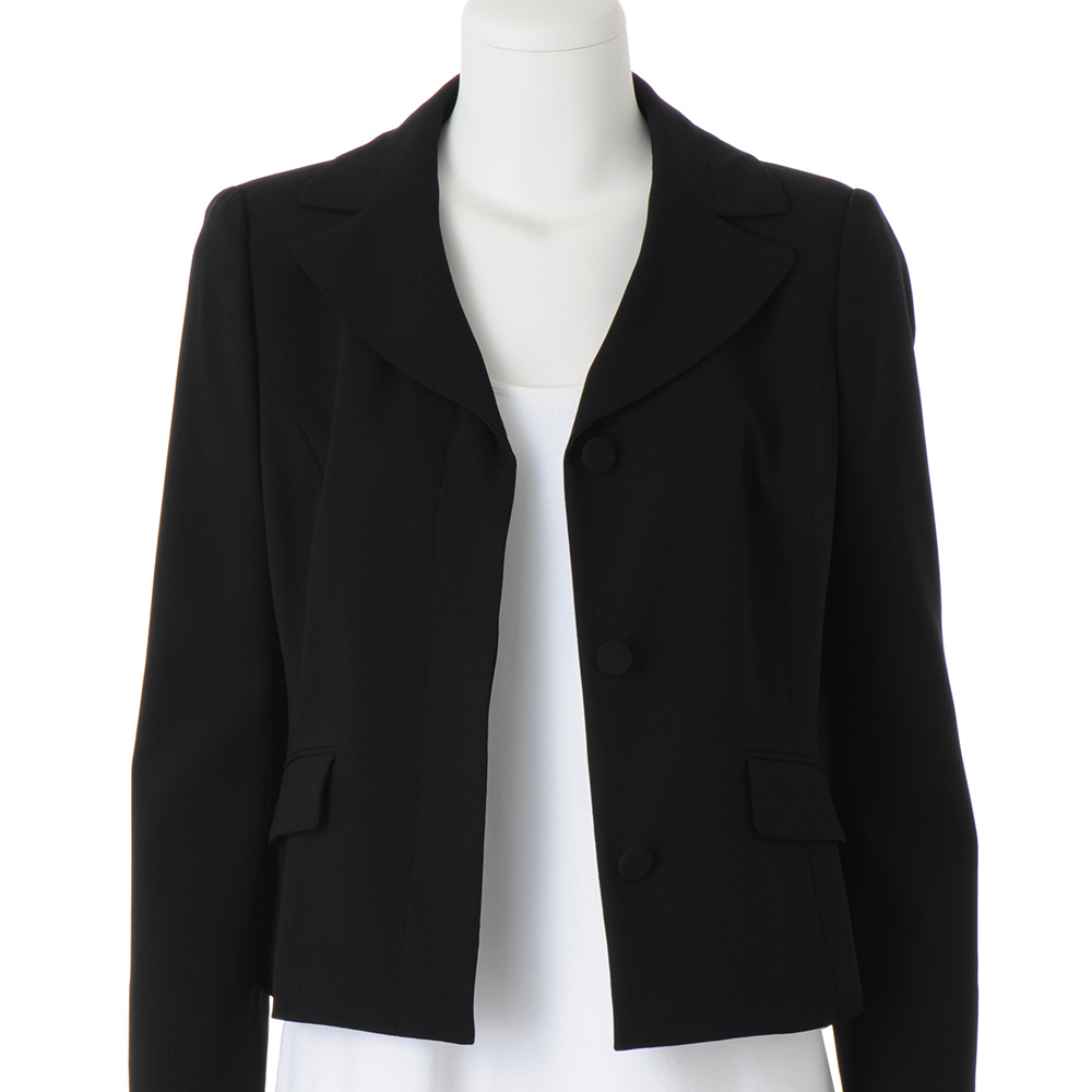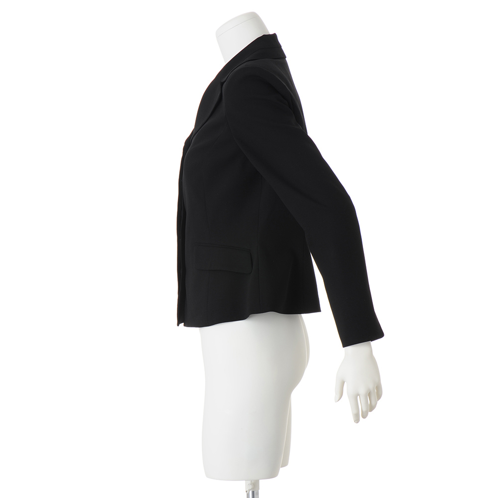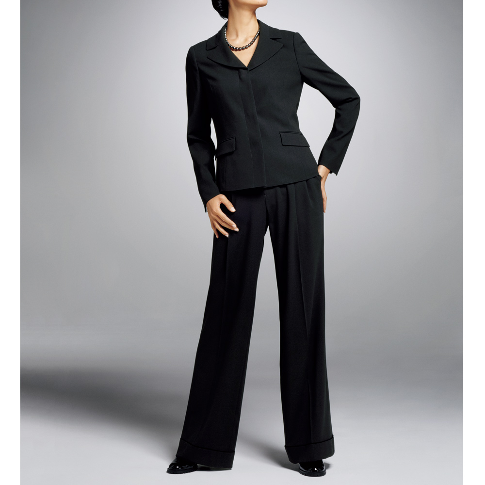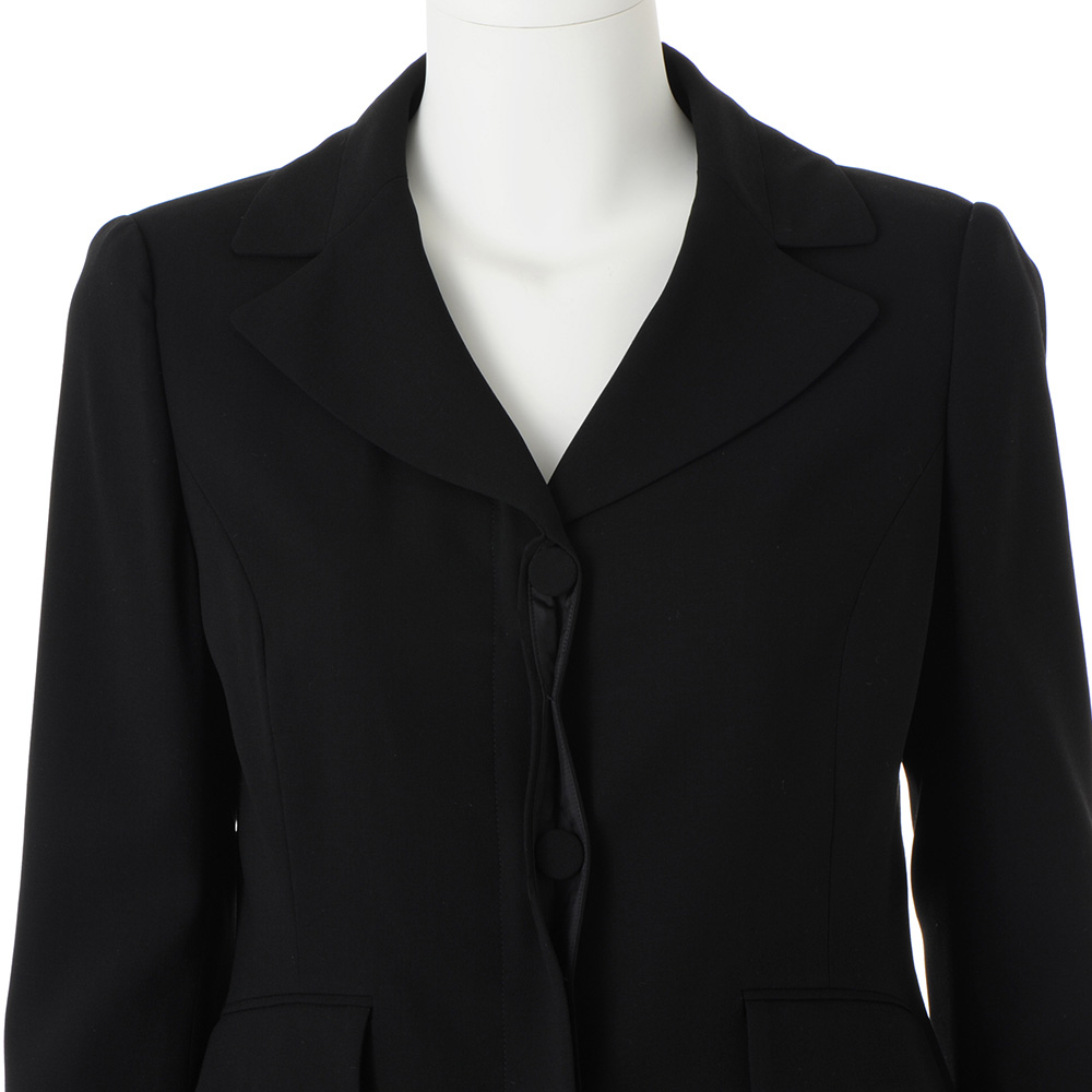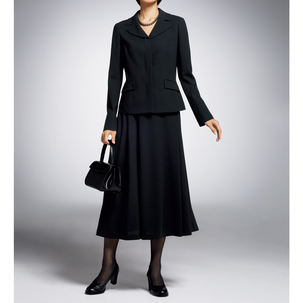 大人ブラック──美しさに目覚める服ブラック──。纏う人の内面の輝きを引き立てる色。繊細さと強さを併せ持つ色。比類のない優美さに満ちた色。そうした独特の存在感を余すところなく表現したのが、今回のブラックコレクション。素材は、日本毛織(株)の希少な「MAF(マフ)」を使ったクレープジョーゼット。着こなせば、自分の美しさに目覚めます。洗練のシルエットで纏うブラックスタイルブラックスタイルだからこそ際立つ美しいシルエットに注目。ジャケットの襟は優しいカーブを描き、丸みを持たせたクラシカルな表情。両脇にパネルを配して立体的に絞ったウエストは、ボトムを選ばずバランスよく着こなす決め手です。素材は、ニュージーランドの希少なメリノウール“MAFクレープジョーゼット”。シボ感があり、柔らかくしなやかで、ドレープ性にも優れ、しわになりにくいのも魅力。二度染めしたスーパーブラックの深みのある黒が、洗練されたデザインをシックに引き立てます。≫ POINT前立てはくるみボタンの比翼仕立てで、すっきりとした印象に。さりげなくモード感を醸し出す、技ありデザイン。