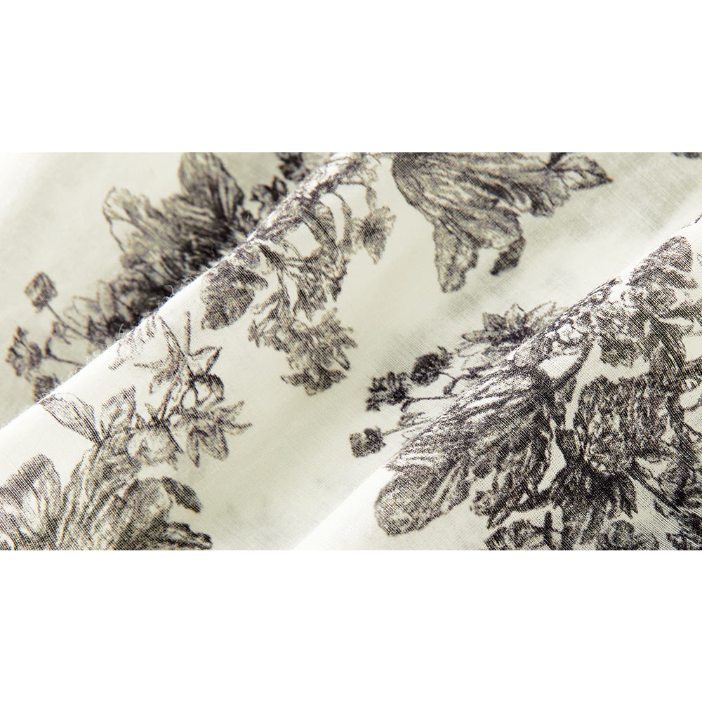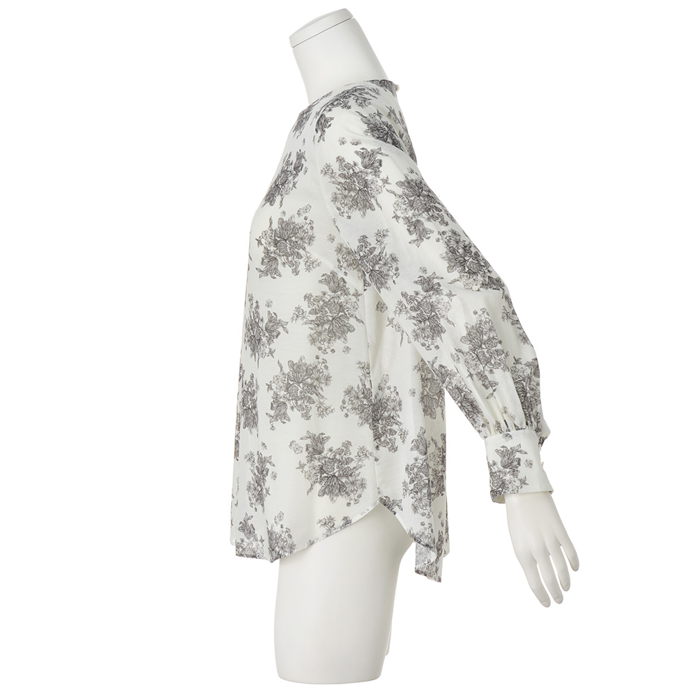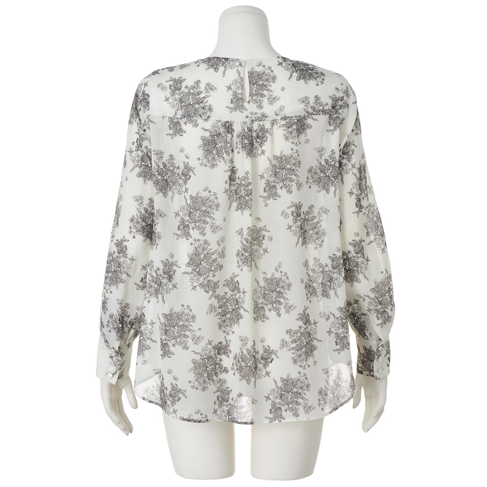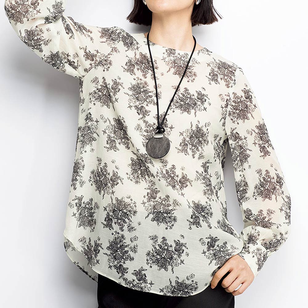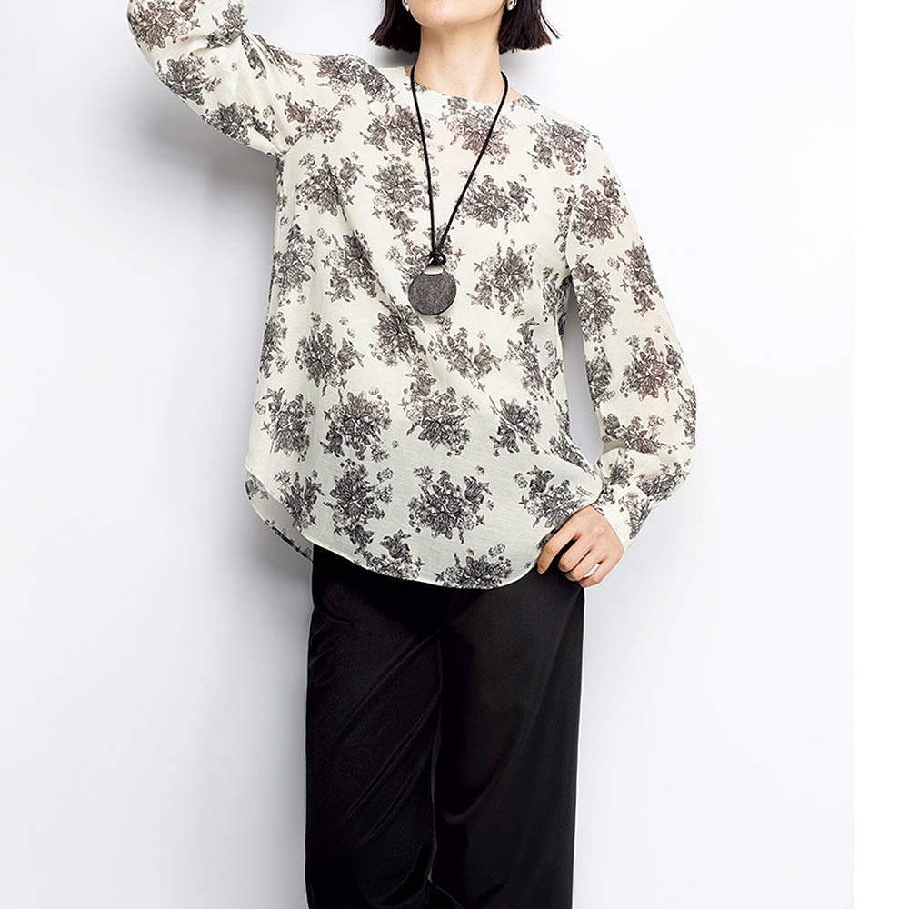 繊細なブーケ柄にノスタルジックなムードがあふれて。心地よい軽やかなシアー素材にオリジナルのブーケ柄をプリントしたブラウスは、繊細な描写がフランス伝統のテキスタイル「トワル・ド・ジュイ」のよう。きれいなネックラインとバストダーツの立体感ですっきりと見せつつ、パフ風スリーブや背ヨーク下のギャザーのふんわり感で女性らしく。さりげなく前後差をつけた絶妙な丈感は、インでもアウトでも。