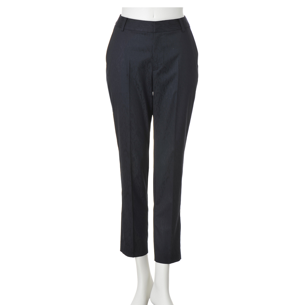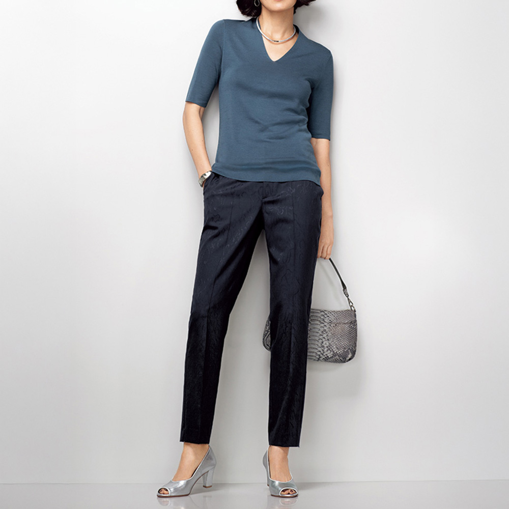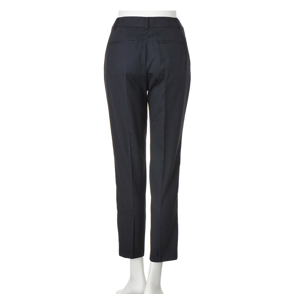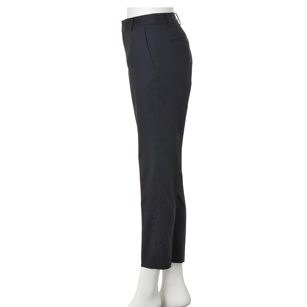 着こなしの完成度は、上質モードな美脚パンツが叶えてくれる。着回しの効くネイビーパンツもシンプル過ぎてはお洒落心が満たされない…。大人の価値観に応えるのが、「NIKKE(日本毛織(株))」が所蔵するアーカイブのアザミ柄をZQウールストレッチ糸を使用したジャカード織りで表現。陰影が美しく、ラグジュアリーな風合いを活かしてセンタープレスが効いたテーパードパンツに仕立てました。軽やかに心地よく洗練バランスを演出する秀逸ボトムとして自信をもっておすすめします。