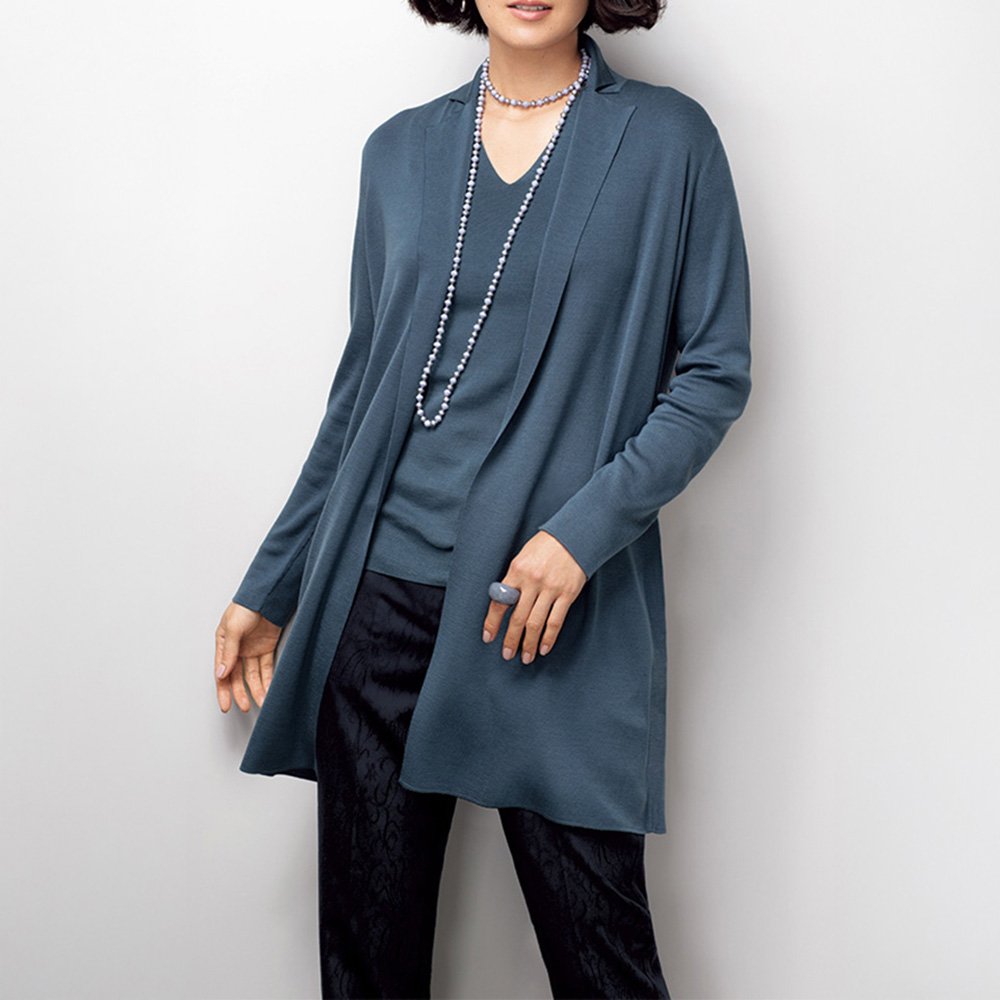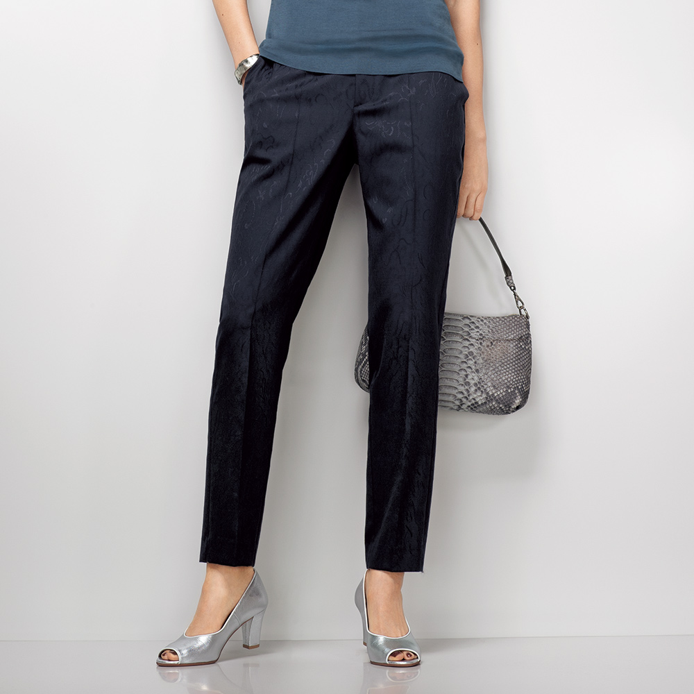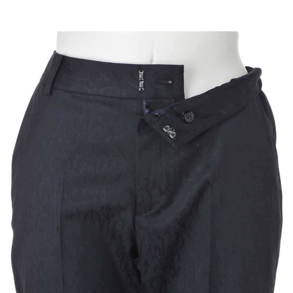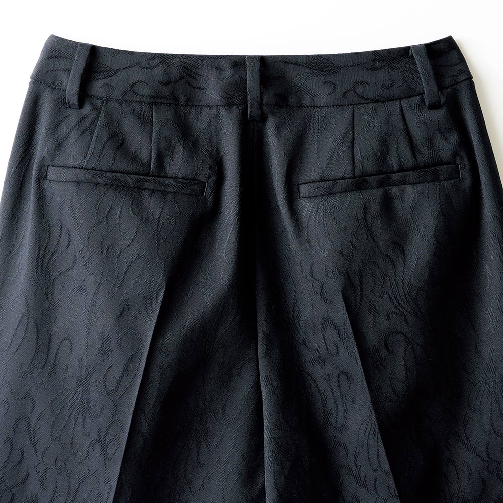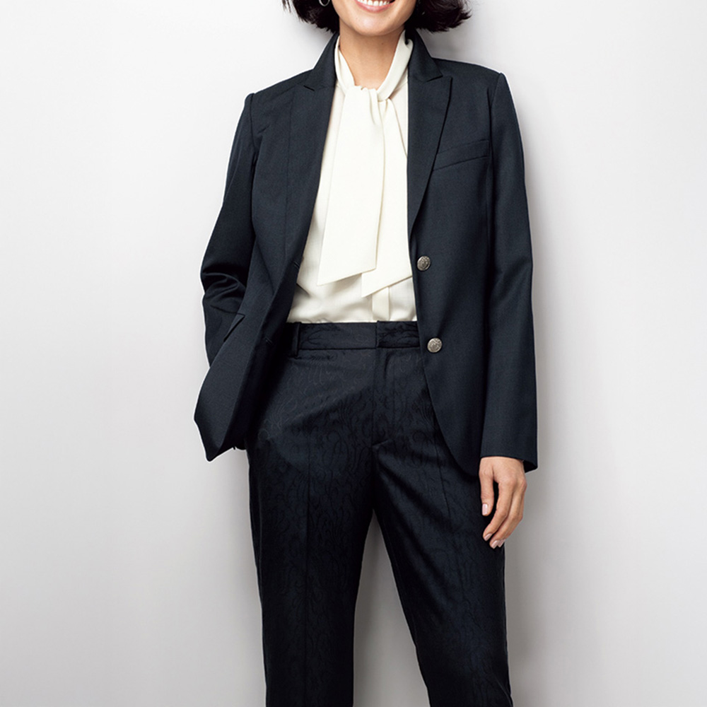 着こなしの完成度は、上質モードな美脚パンツが叶えてくれる。着回しの効くネイビーパンツもシンプル過ぎてはお洒落心が満たされない…。大人の価値観に応えるのが、「NIKKE(日本毛織(株))」が所蔵するアーカイブのアザミ柄をZQウールストレッチ糸を使用したジャカード織りで表現。陰影が美しく、ラグジュアリーな風合いを活かしてセンタープレスが効いたテーパードパンツに仕立てました。軽やかに心地よく洗練バランスを演出する秀逸ボトムとして自信をもっておすすめします。