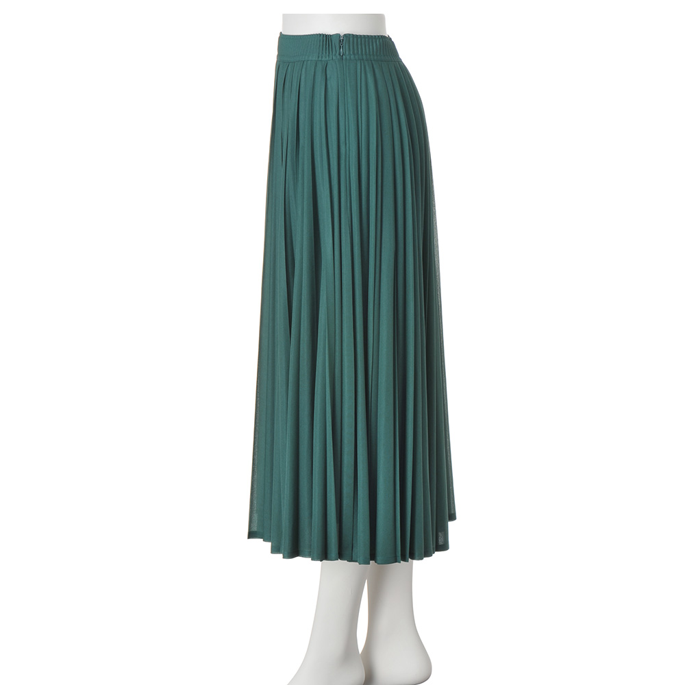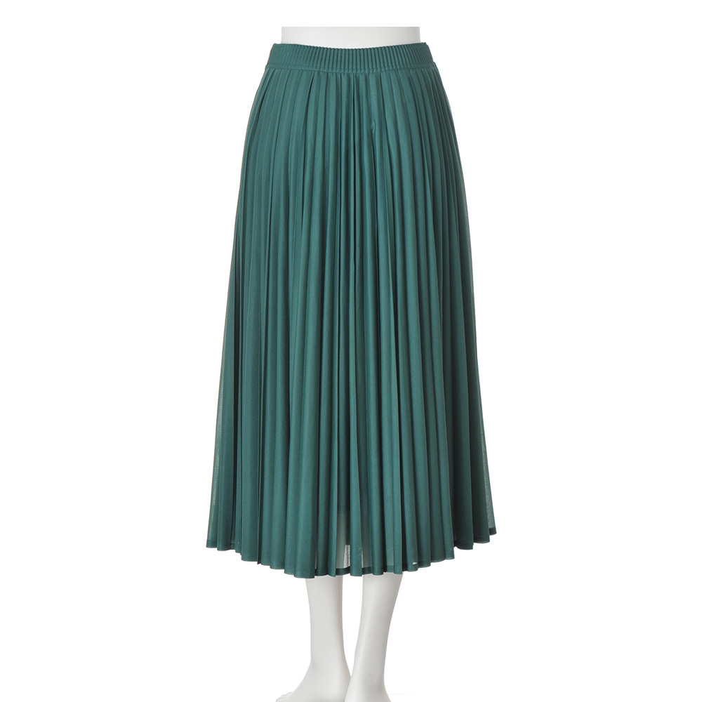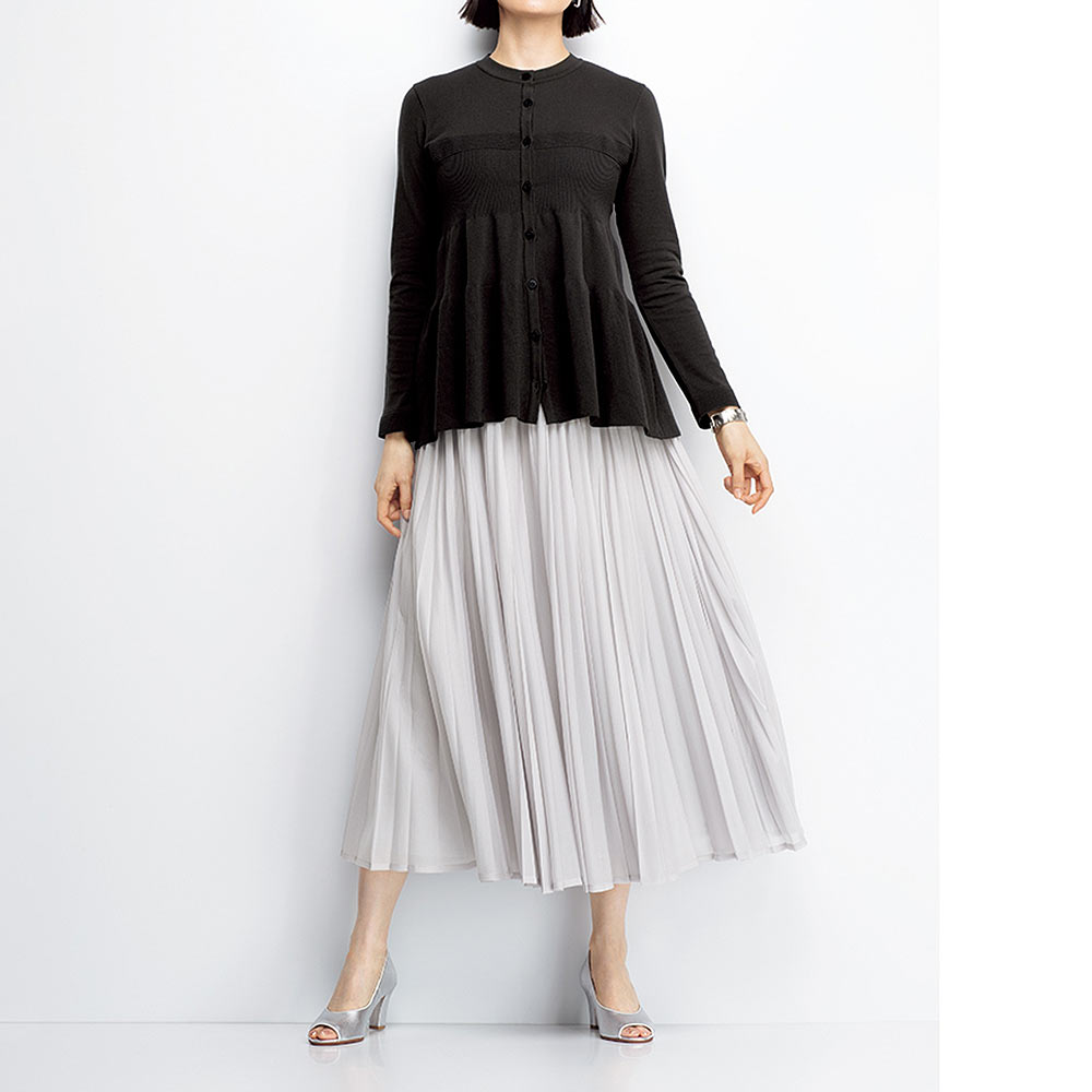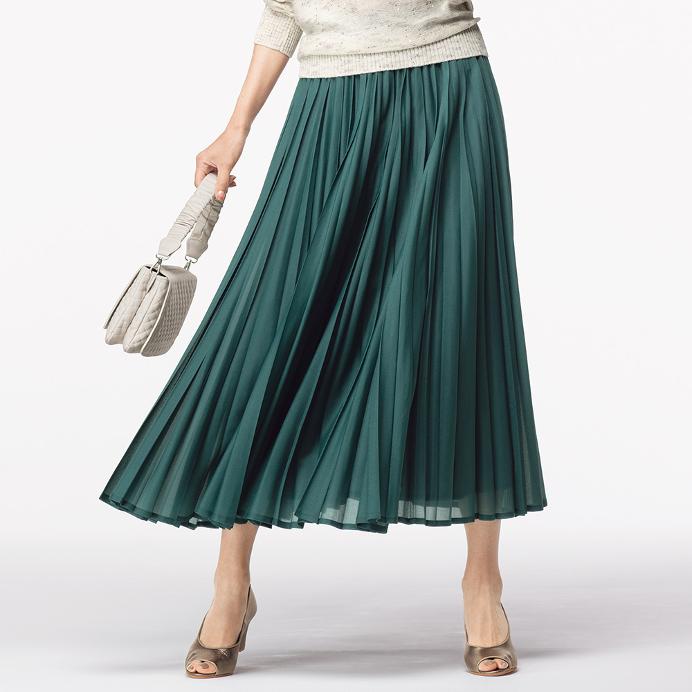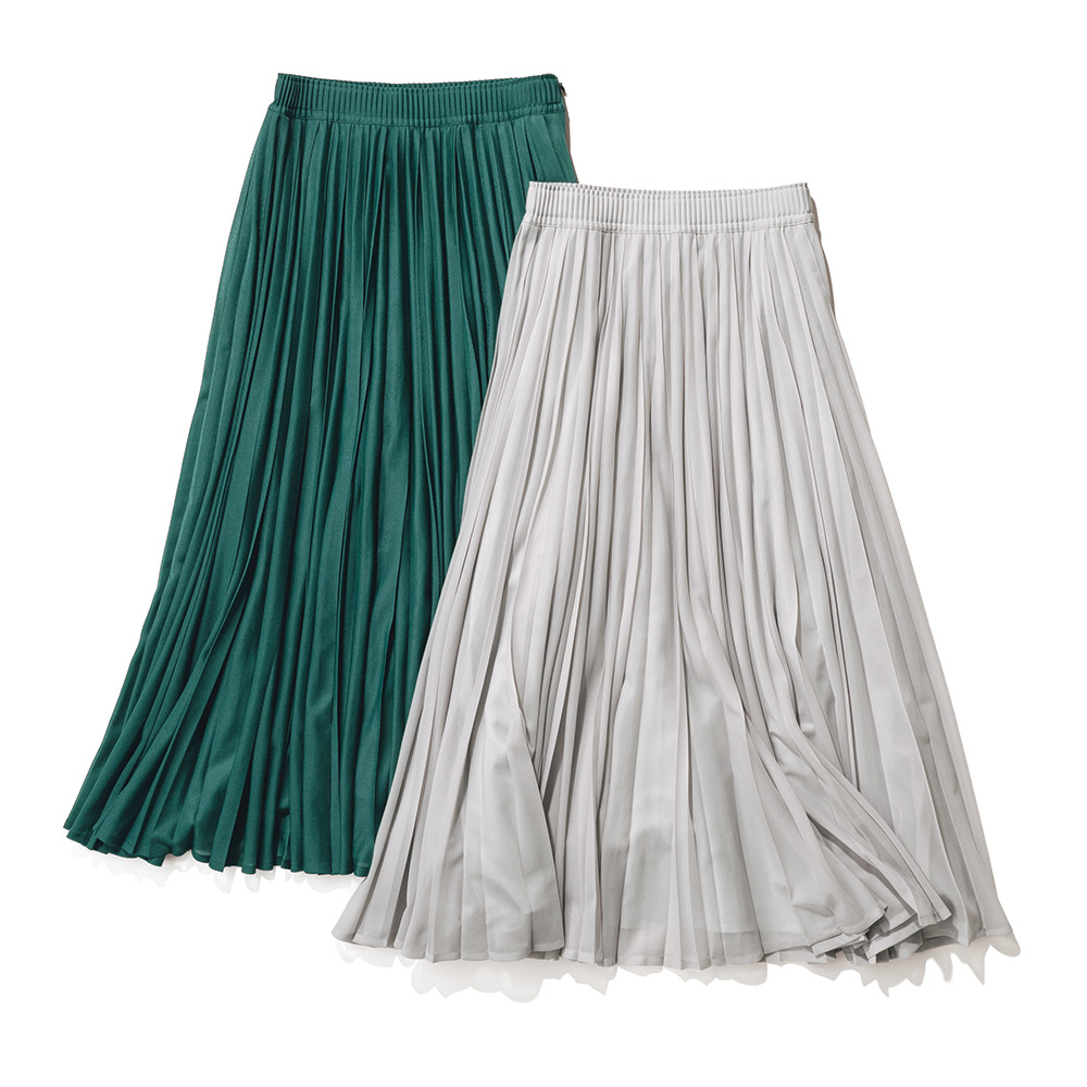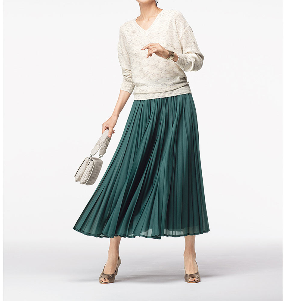 表情豊かに揺れるプリーツ。薄手で軽く透明感のあるオーガンジー風の素材に、技ありのハンドプリーツ加工で新鮮さを加味したスカート。生地はサラッとした風合いと柔らかさを兼ね備えたほのかに煌めくシアーニット。折り目がシャープな型と丸みのある型の2種類を使って二度がけすることで、プリーツをランダムで膨らみのある優しい表情に仕上げています。≫ POINT平ゴム仕様のウエスト部分にも細プリーツを畳み、見せてもきれいな表情に。すっきりとしたシルエットのために、脇ファスナー開きにしました。