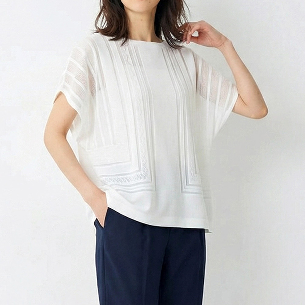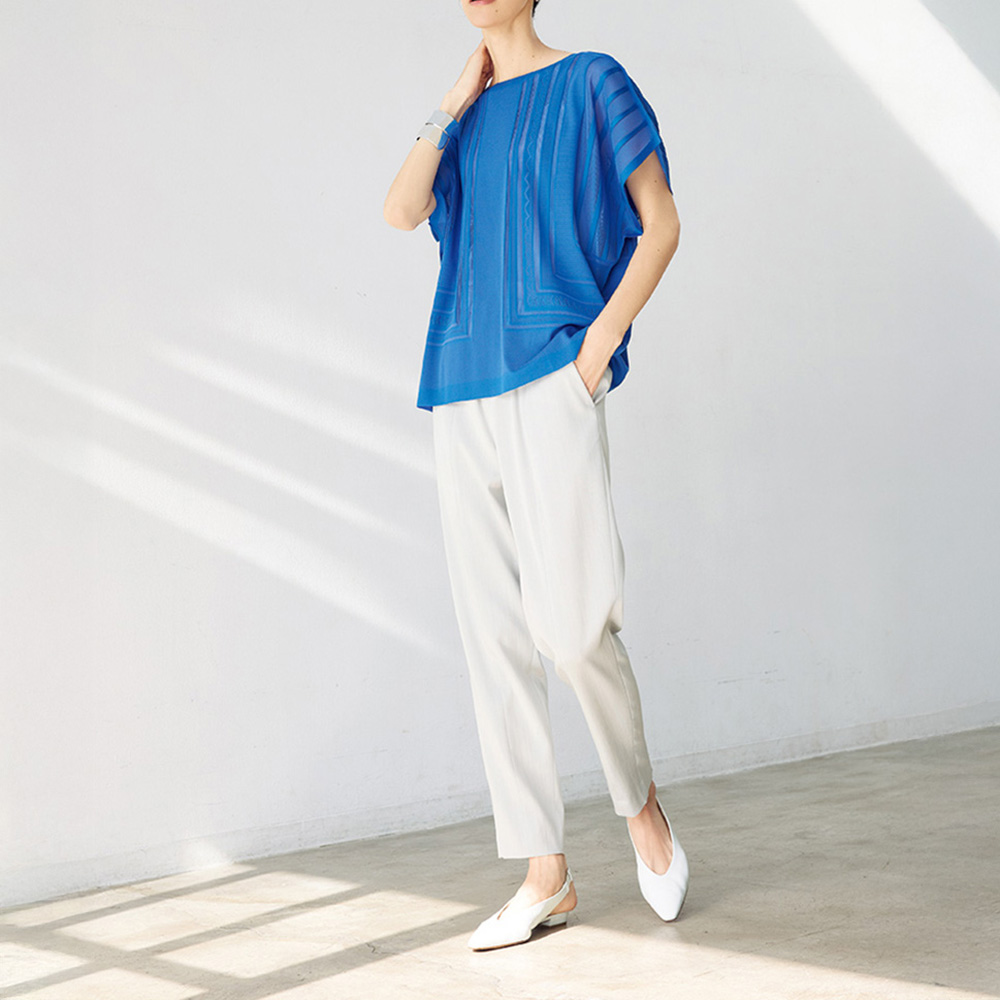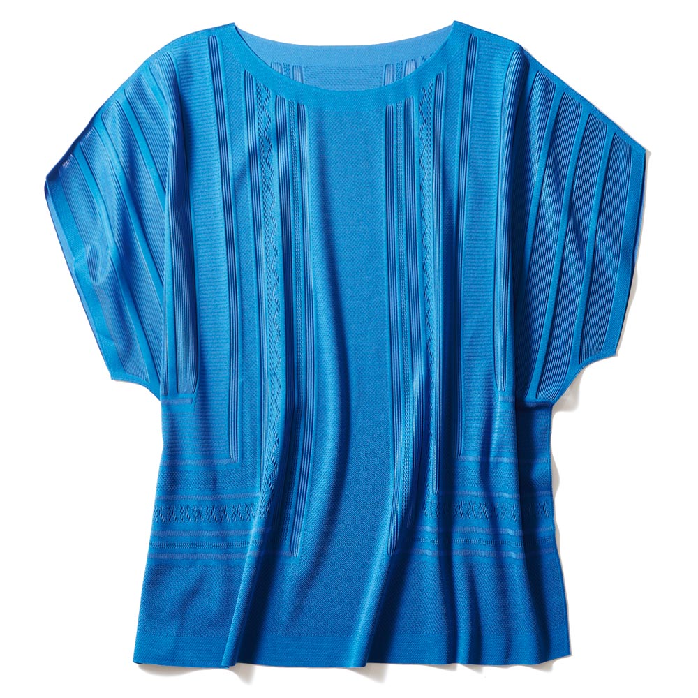 マテリアルの麗しさを心地よく纏うラグジュアリーの今鮮やかなブルーに心躍るプルオーバーは、プリモーディアル(R)ならでは。ノーシームデザインでストレスフリーな着用感。身頃や袖に大胆に配したグラフィカルな図柄は、ストライプ部分だけ上品な透け感を表現。センシュアルな華やぎを醸して、一枚でも絵になる存在感です。旬のラグジュアリーを描くマテリアルの麗しき個性グラフィカルな模様編みと透け感のバランスが、一着でも着映える主役級なデザインが決め手。個性を放つ鮮やかなブルーと、肌を明るく輝かせつつ清らかなモード感を醸すオフホワイトの2色展開です。