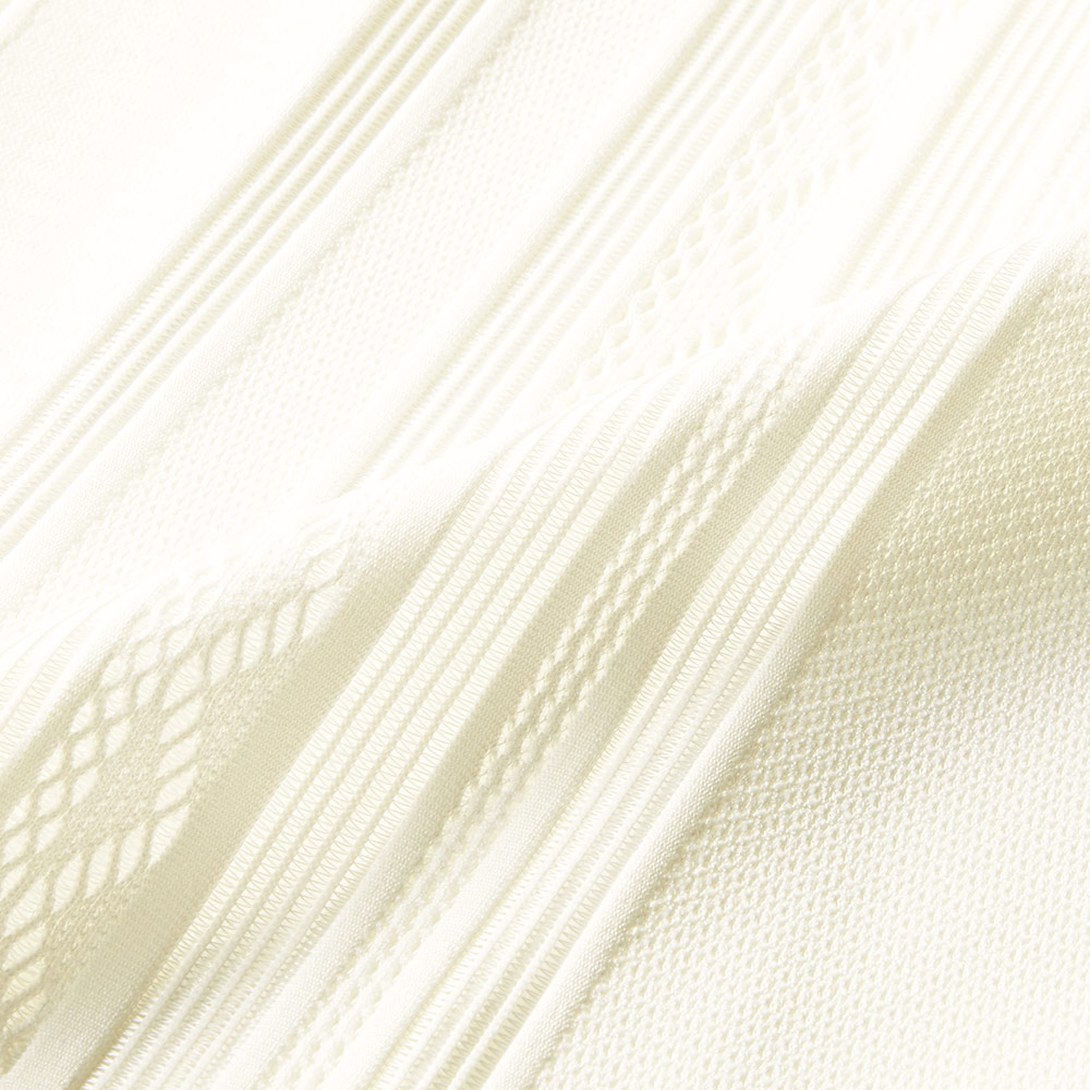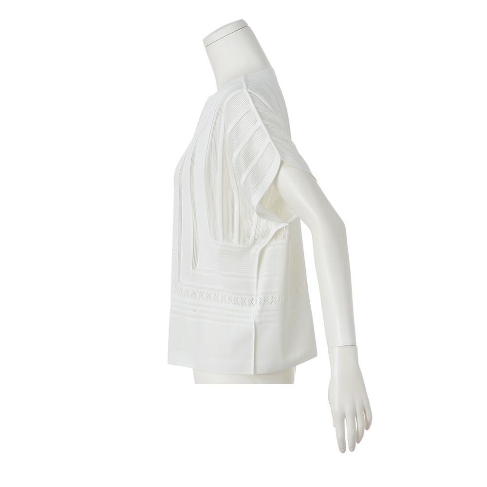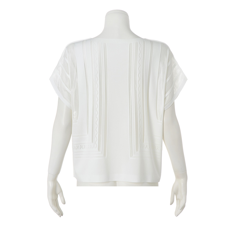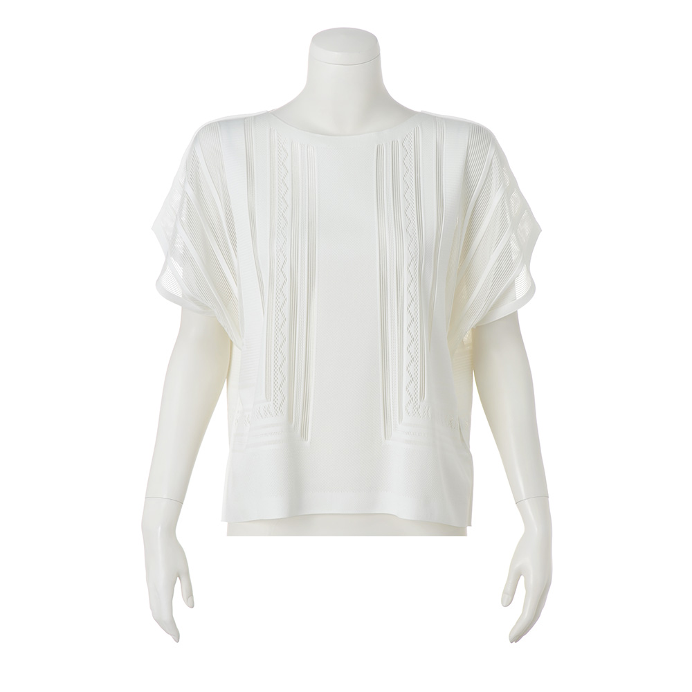 マテリアルの麗しさを心地よく纏うラグジュアリーの今鮮やかなブルーに心躍るプルオーバーは、プリモーディアル(R)ならでは。ノーシームデザインでストレスフリーな着用感。身頃や袖に大胆に配したグラフィカルな図柄は、ストライプ部分だけ上品な透け感を表現。センシュアルな華やぎを醸して、一枚でも絵になる存在感です。旬のラグジュアリーを描くマテリアルの麗しき個性グラフィカルな模様編みと透け感のバランスが、一着でも着映える主役級なデザインが決め手。個性を放つ鮮やかなブルーと、肌を明るく輝かせつつ清らかなモード感を醸すオフホワイトの2色展開です。