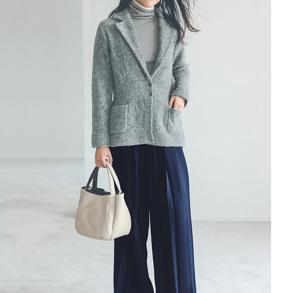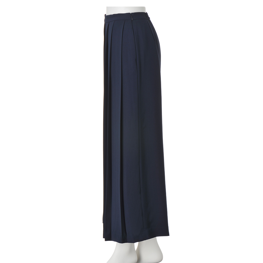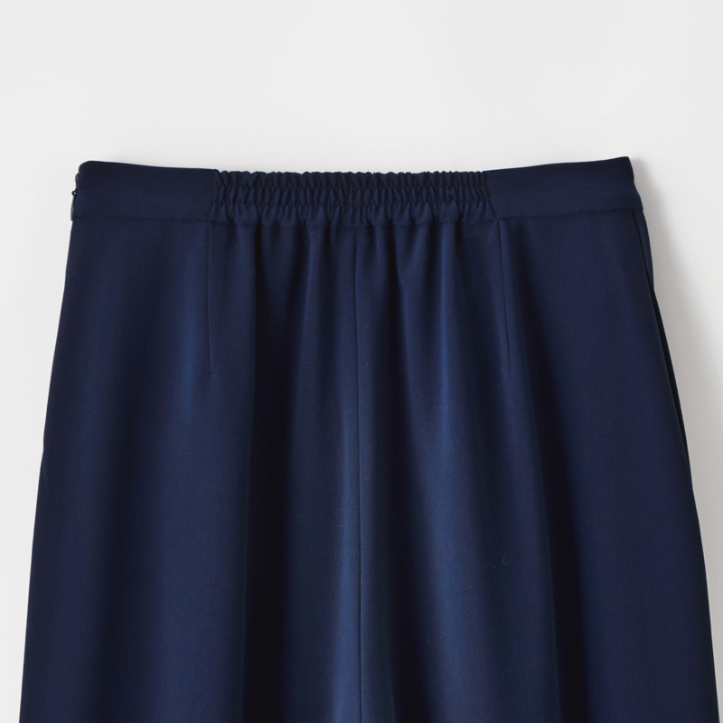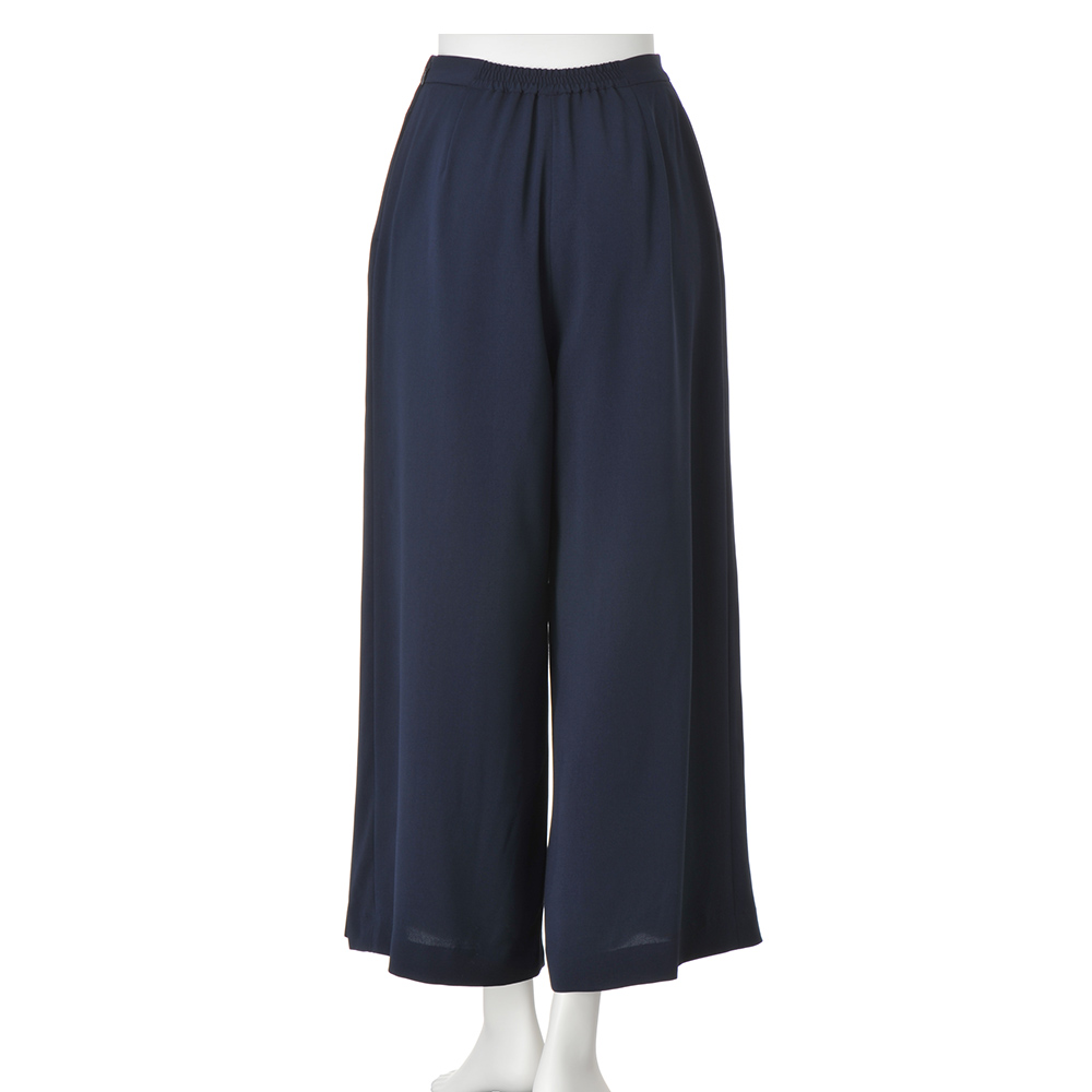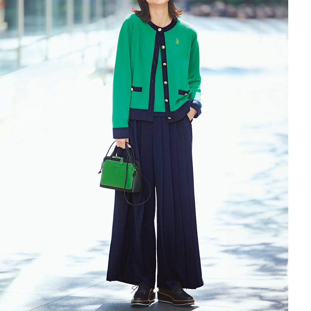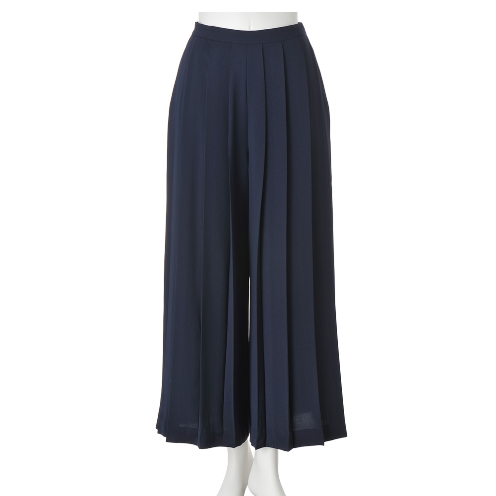 軸になるのは、きちんと感と華やかさ。フロントにほどこしたプリーツがスカート見えするワイドパンツ。後ろはプリーツなしですっきりと仕上げ、縦のラインを強調する美しいシルエットと落ち感のある素材が着やせ見えを叶えます。やさしげなムードがありながら、スタイリングに深みを増すネイビーカラーが上品。
