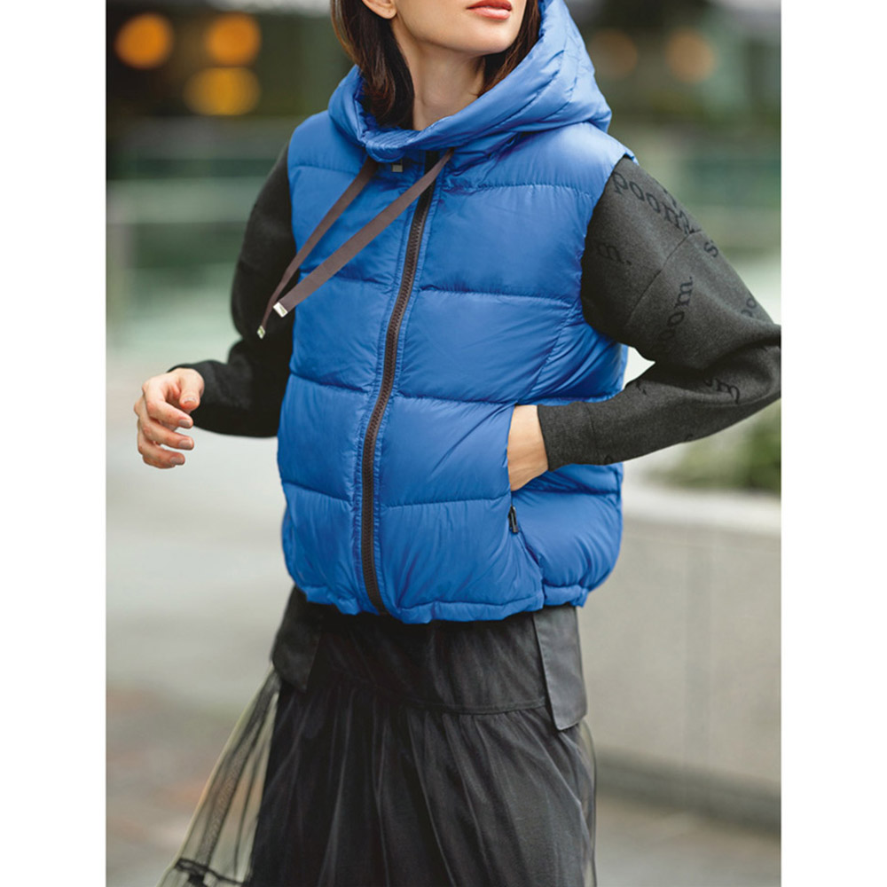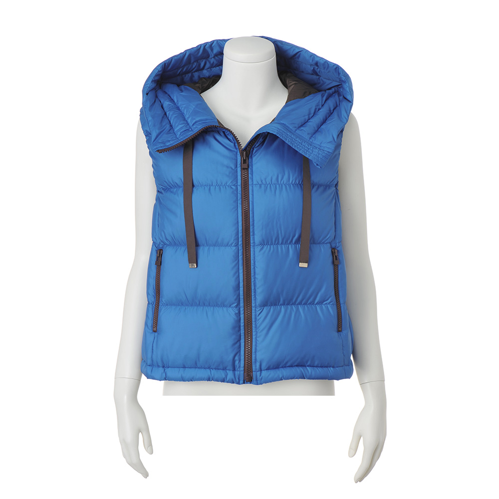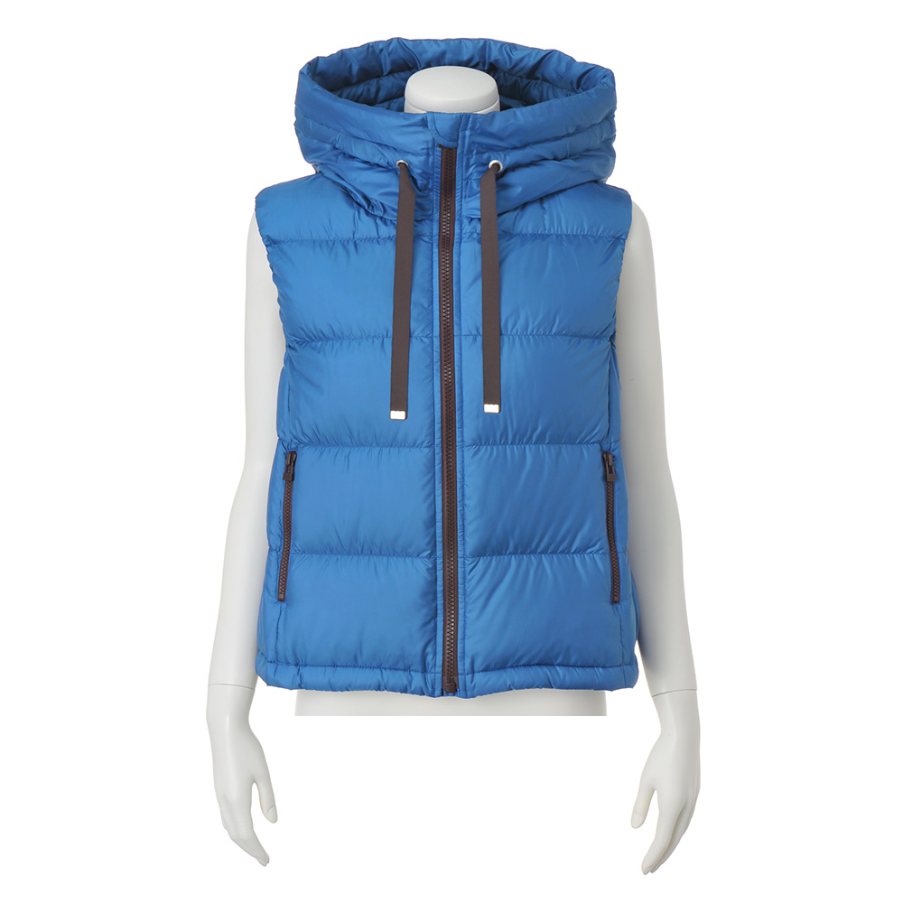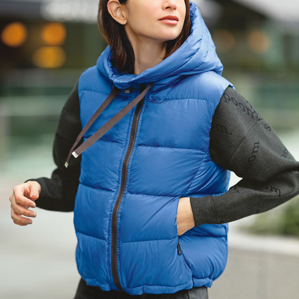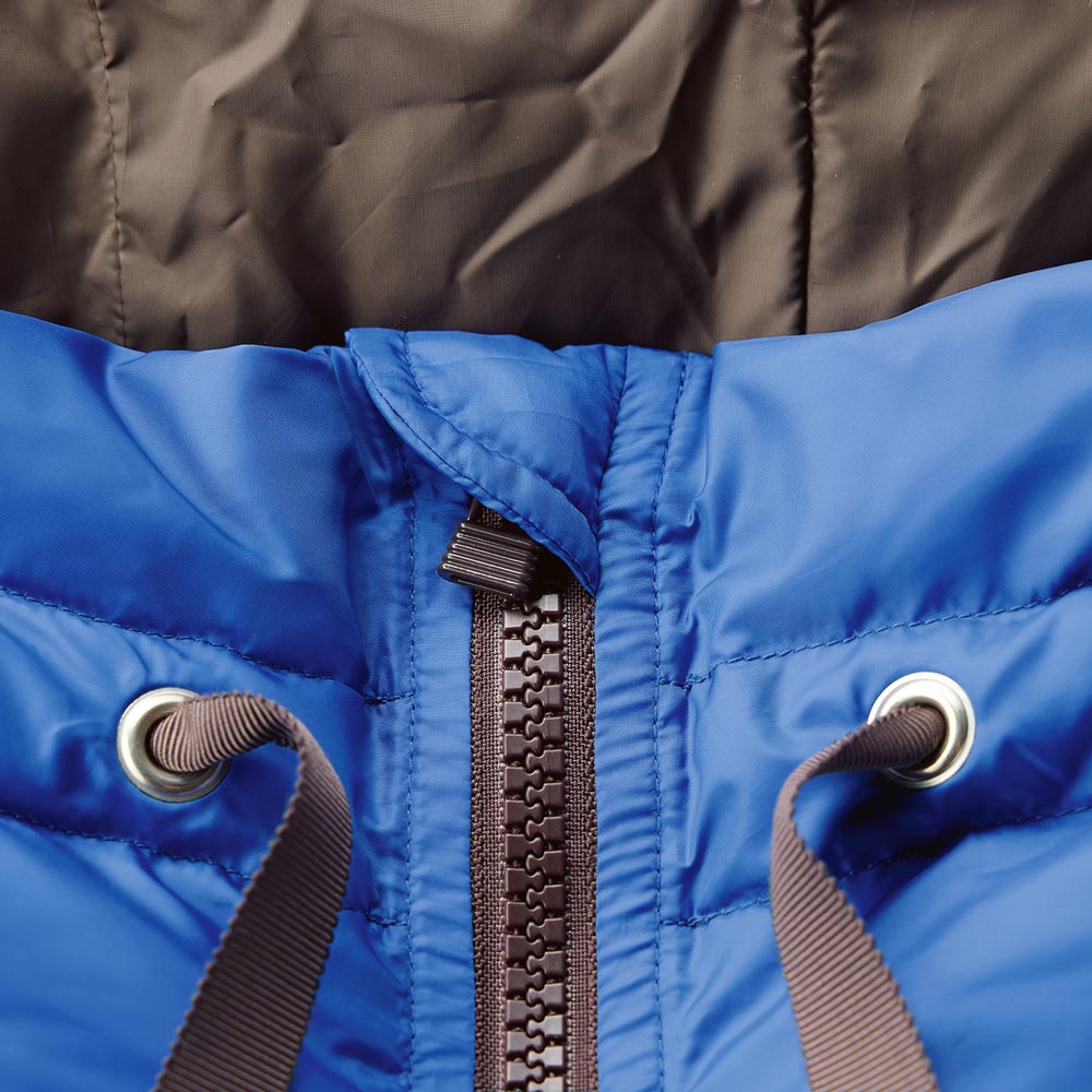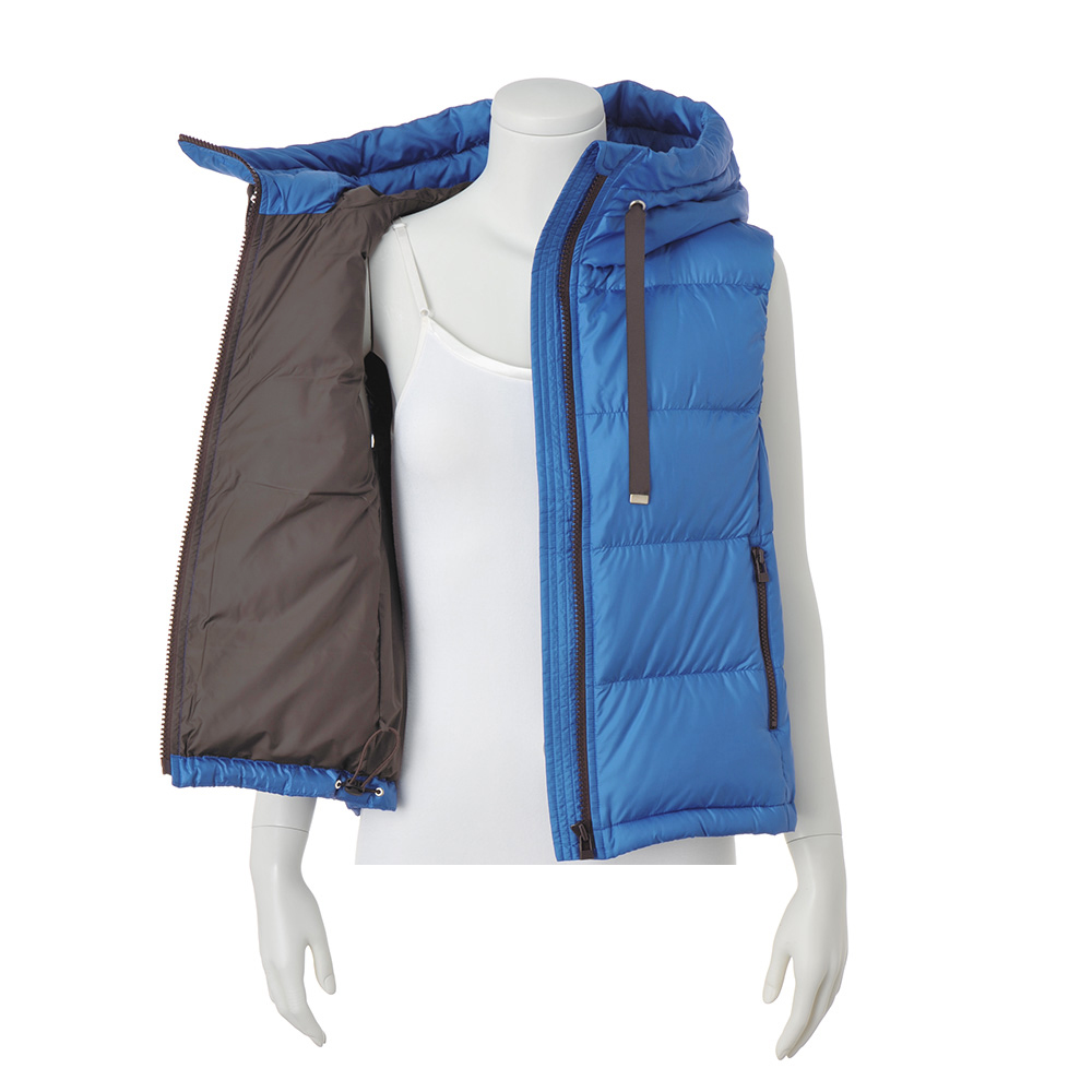 Beautiful LADY Look―アクティブで女性らしい…ミックス感が絶妙―装いに映えるロイヤルブルーに濃茶の配色が洗練度を高める[はっ水] [防風] [透湿]帝人フロンティア開発素材「ライトマジック(R)」を使用。極細糸を使った高密度の生地を、両面使用した軽くて快適なダウン。バランスの取りやすいコンパクトな丈感で、裾のドローストリングでシルエットに丸みも出せる、女性らしく着られるデザインです。