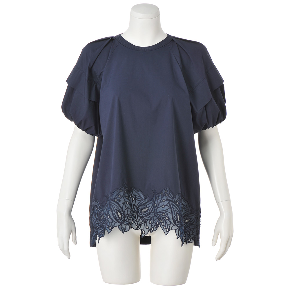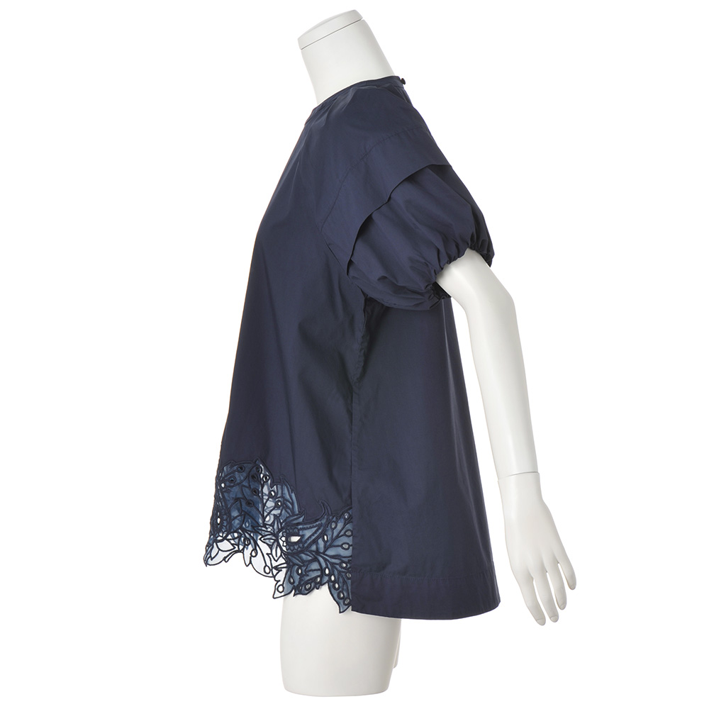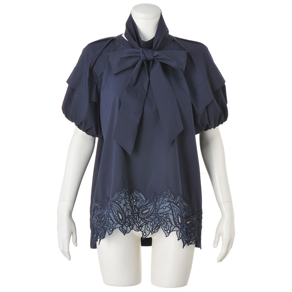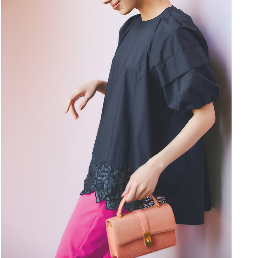 きれい見えする上品な光沢感の生地刺しゅうやボウタイなどでエレガントに上品な微光沢感のタイプライター生地で華やかなブラウスを作りました。ふんわりとしたパフスリーブや、前裾にほどこしたオーガンジー刺しゅうなどがエレガント。前後差のある丈感で刺しゅうが映え、ヒップをさりげなくカバー。付属の共布ボウタイは首や腰に巻いてアレンジが可能。≫ POINT裾のレースはオーガンジーに刺しゅうし、さりげない透け感がポイント。