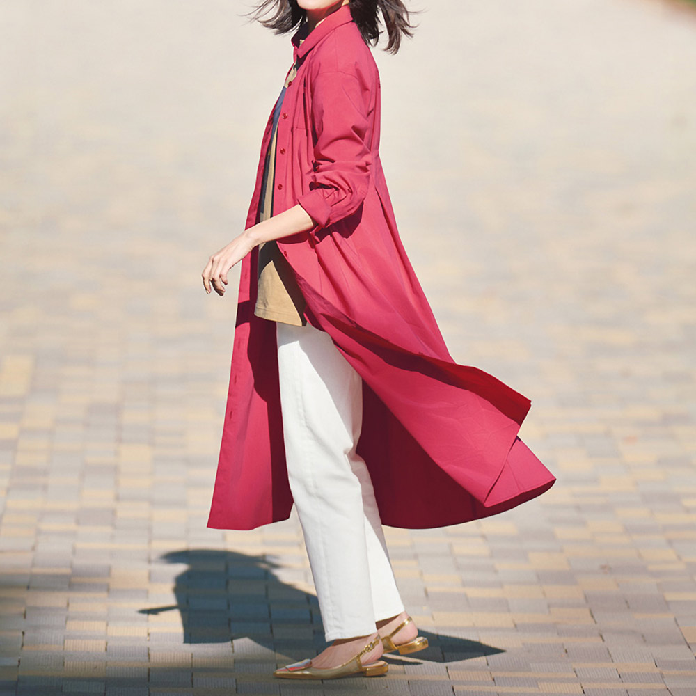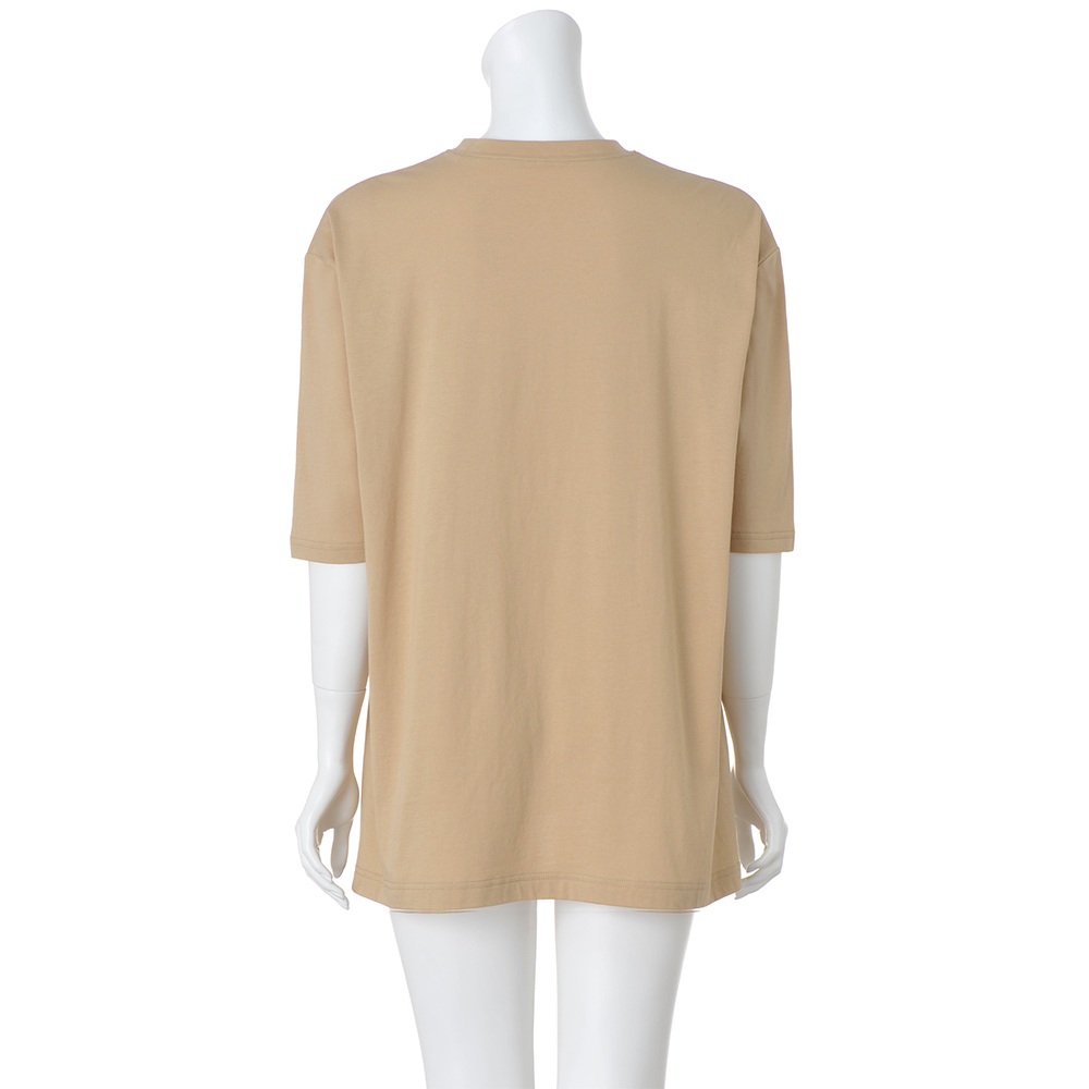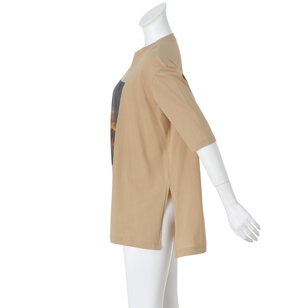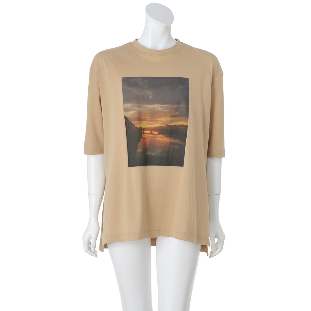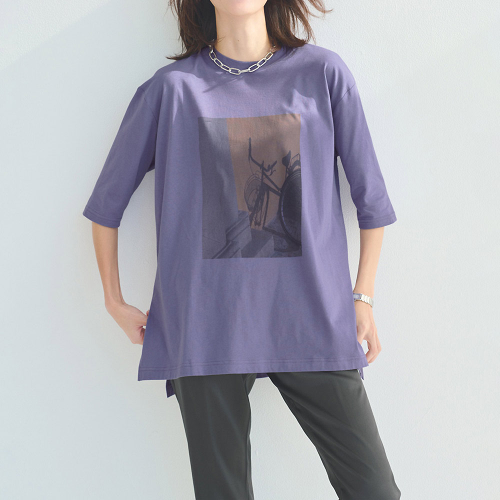 Sustainable サステナブルなフォトプリントTシャツ普段、口にする食品とその材料となる植物の使われない部分を染料として有効活用した「MottaiDye」プロジェクト。サステナブルな活動のひとつにもなる、アイテムをご紹介します。オーガニックコットンの柔らかな風合い、ドライタッチな肌ざわりや適度なゆるシルエットが、リラクシーに着られるチュニックTシャツ。お腹やヒップをしっかりカバーする長め丈と、すっきりとした5分袖でカジュアルになりすぎず着られます。サイドには深めのスリット入りでデザインアクセントに。食品や植物ののこり部分から抽出した染料を活用しているからこその、ナチュラルなカラーも魅力。What's MottaiDye Process協力工場から「のこり」を回収回収した「のこり」から色素を抽出抽出した色素を利用し生地を染色アパレルなどの製品に活用し消費者のみなさんにお届けする(ア)ライトブラウン(風景)フィレンツェの夕焼け 水面にかかる夕焼けの風景をプリント。ブラウンのカラーとなじみ、より深みが増した印象に。まるで絵画のようなニュアンスを生み出します。ブラウンともベージュとも言えるニュアンスのある色合いを叶えるのは、コーヒーで染めたからこそ。(イ)パープル(自転車)ミラノの街角 鮮やかなイエローの壁に映える自転車の影。そんな風景をパープルのTシャツにのせれば、さりげなく色合いがなじんで気負わず着られる一着に。鮮やかなのに、どこかシックさも感じられる絶妙なパープルの色合いは、天然の食物を使っているからこそ。