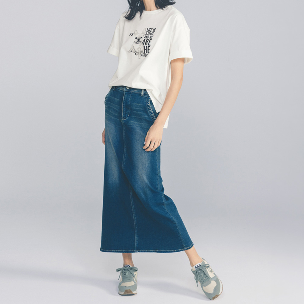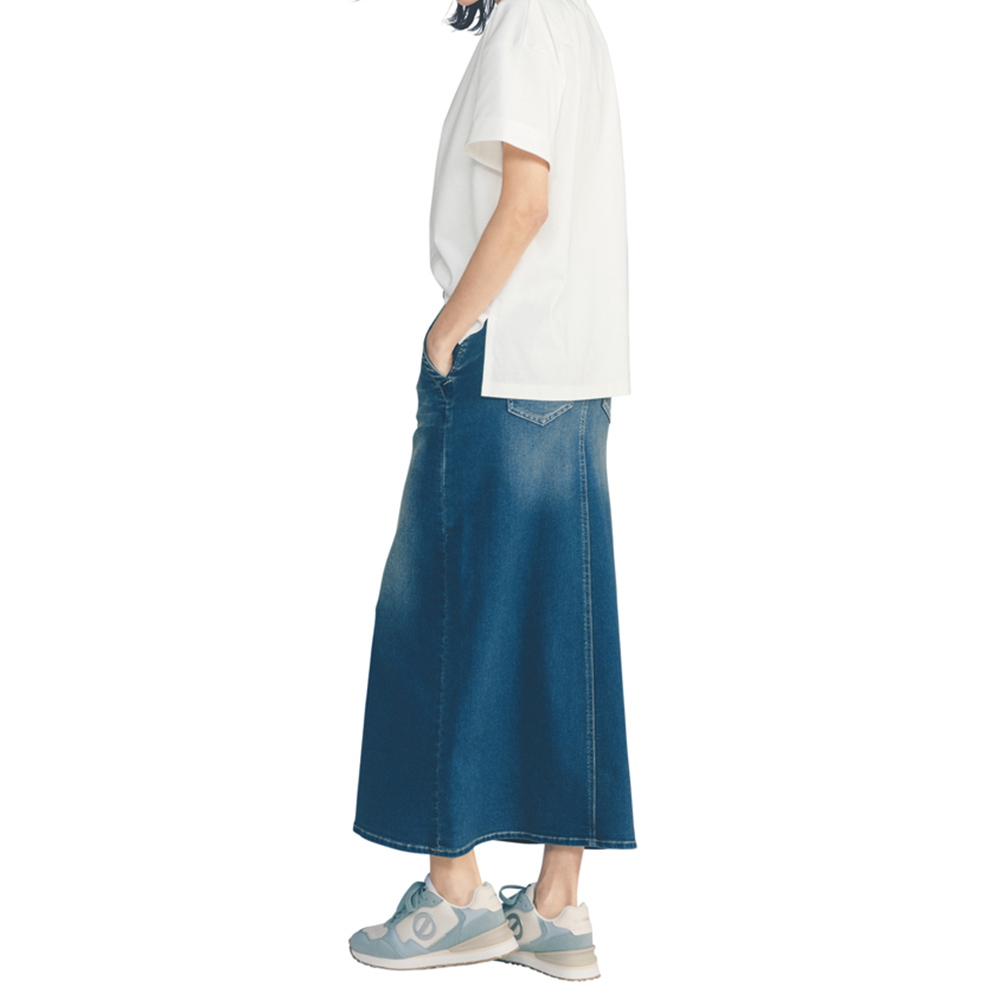 LOVE DENIM デニムで始める新しい季節ストレッチの効いた柔らかなデニム生地の、楽なはき心地が魅力のロングスカート。自然な色落ち感やシェービング、フロントのヒゲ加工で、デニムならではのディテールワークが光ります。程よいAラインシルエットが女性らしく、足さばきのよさも兼備。