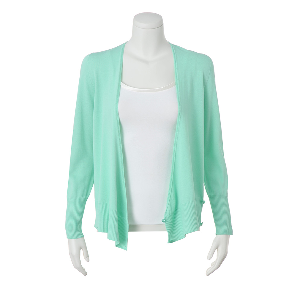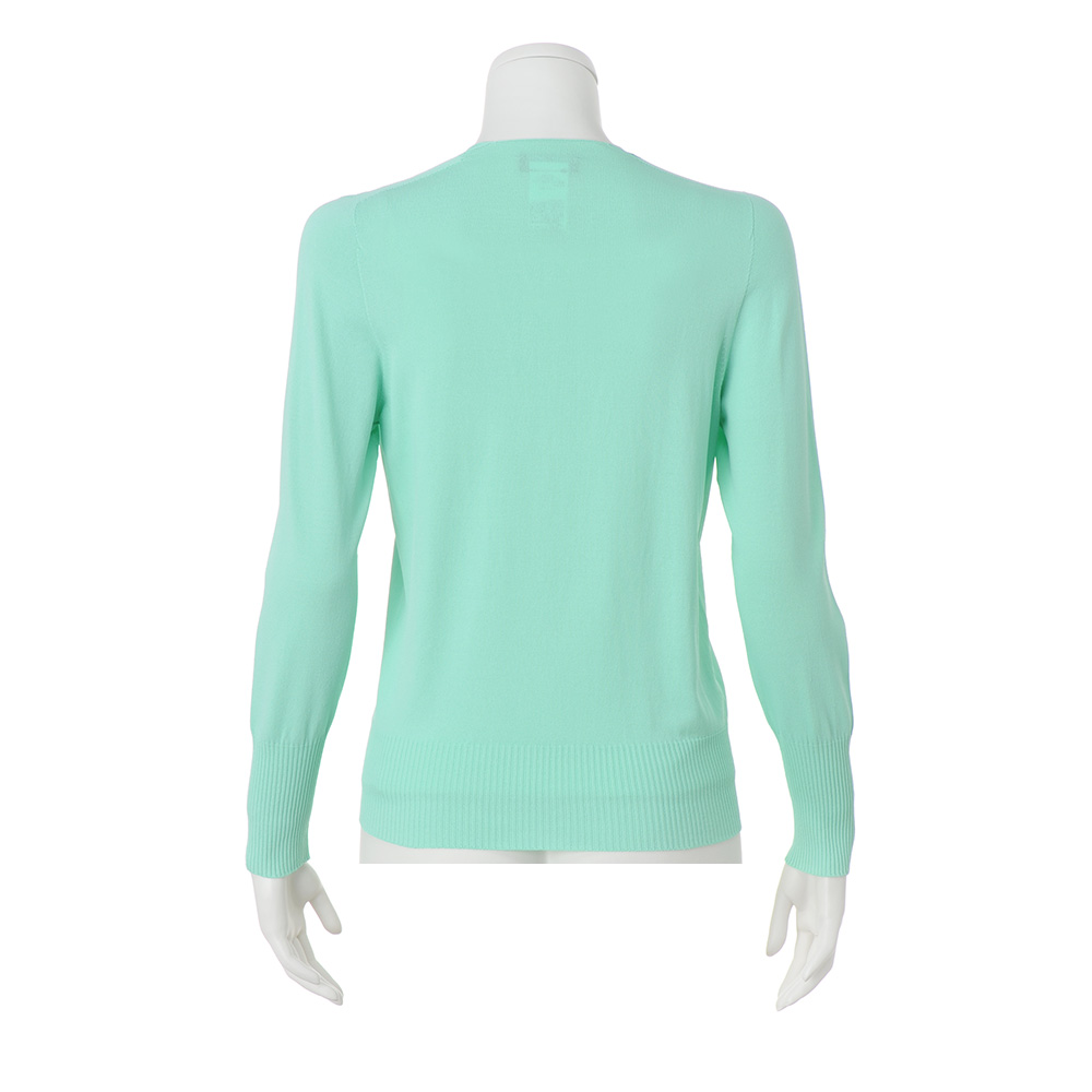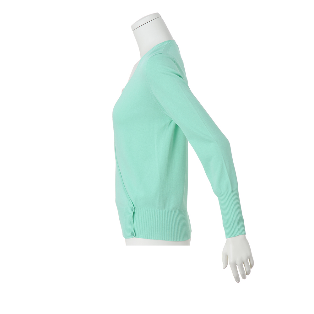袖付けや身頃に縫い目のない、着心地のいいプルオーバー。コンパクトなカシュクールデザインは、ボタンを外せばトッパーとしても楽しめます。爽やかなミントグリーンで旬の表情に。