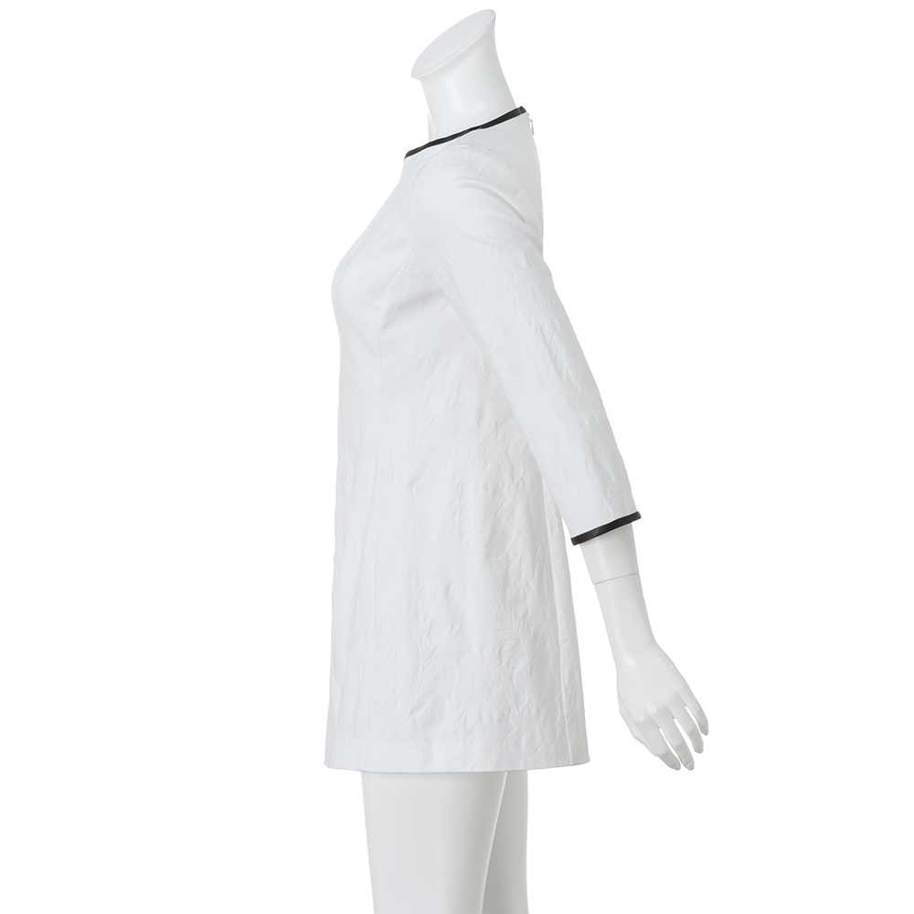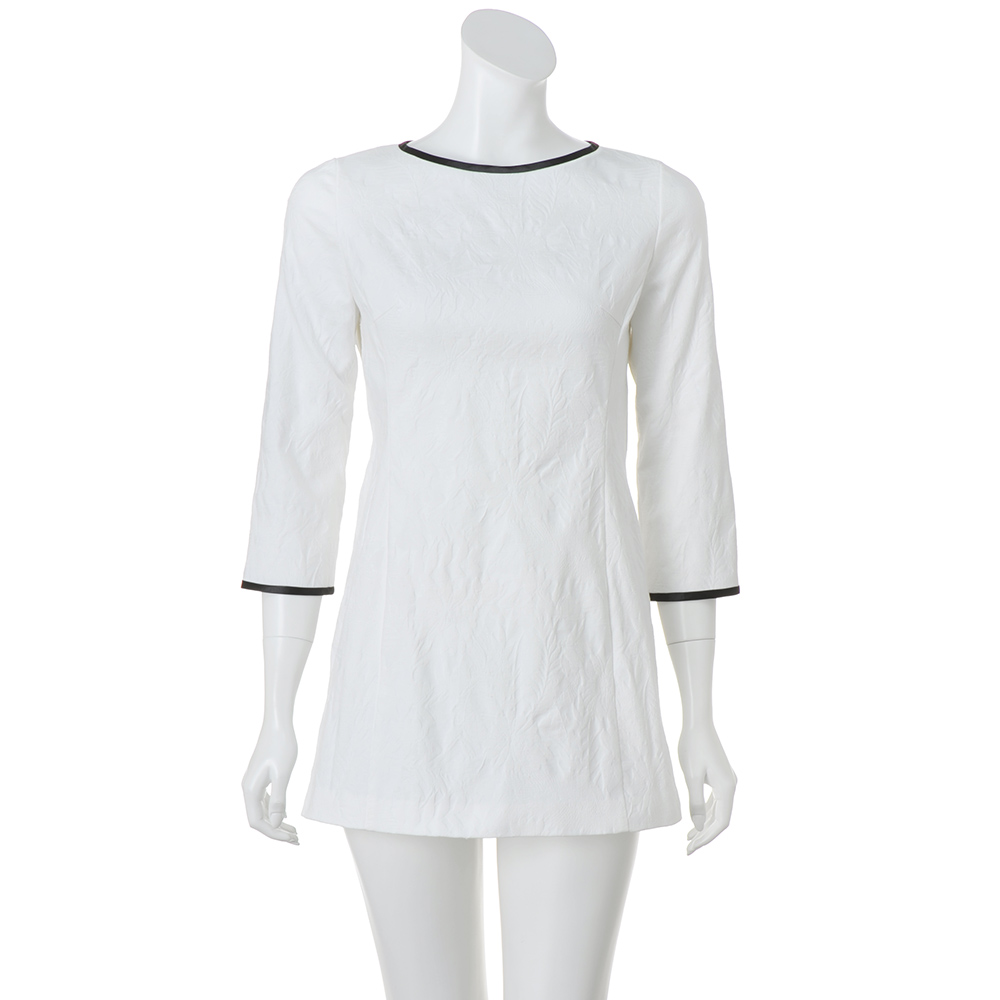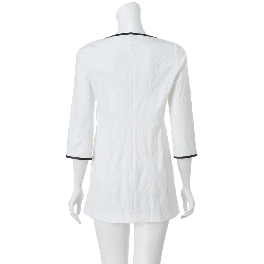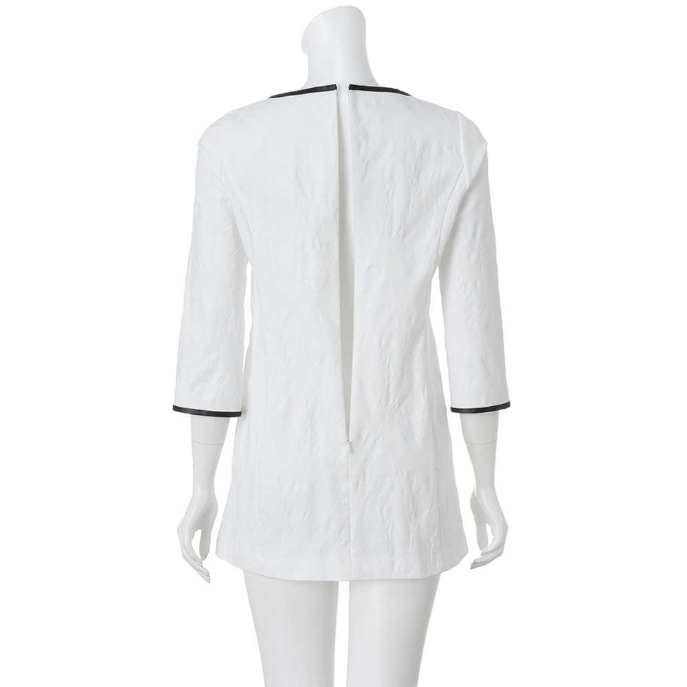颯爽と私らしく輝く Handsome Feminine凜とした佇まいに、堅くなりすぎないナチュラルな雰囲気を纏って。シンプルなのに存在感がある“ハンサム・フェミニン”が私たちに相応しい…。ジャカード織りの陰影が、白一色をエレガントな表情に。細身のチュニックはパネル切り替えでサイドにゆとりを持たせ、美フォルムながら着心地のよさにも自信あり。≫ POINT・横ストレッチ生地で着心地も快適。程よい厚みで透けも気になりません。・襟ぐりと袖口には配色でパイピングを入れてデザインのアクセントに。
