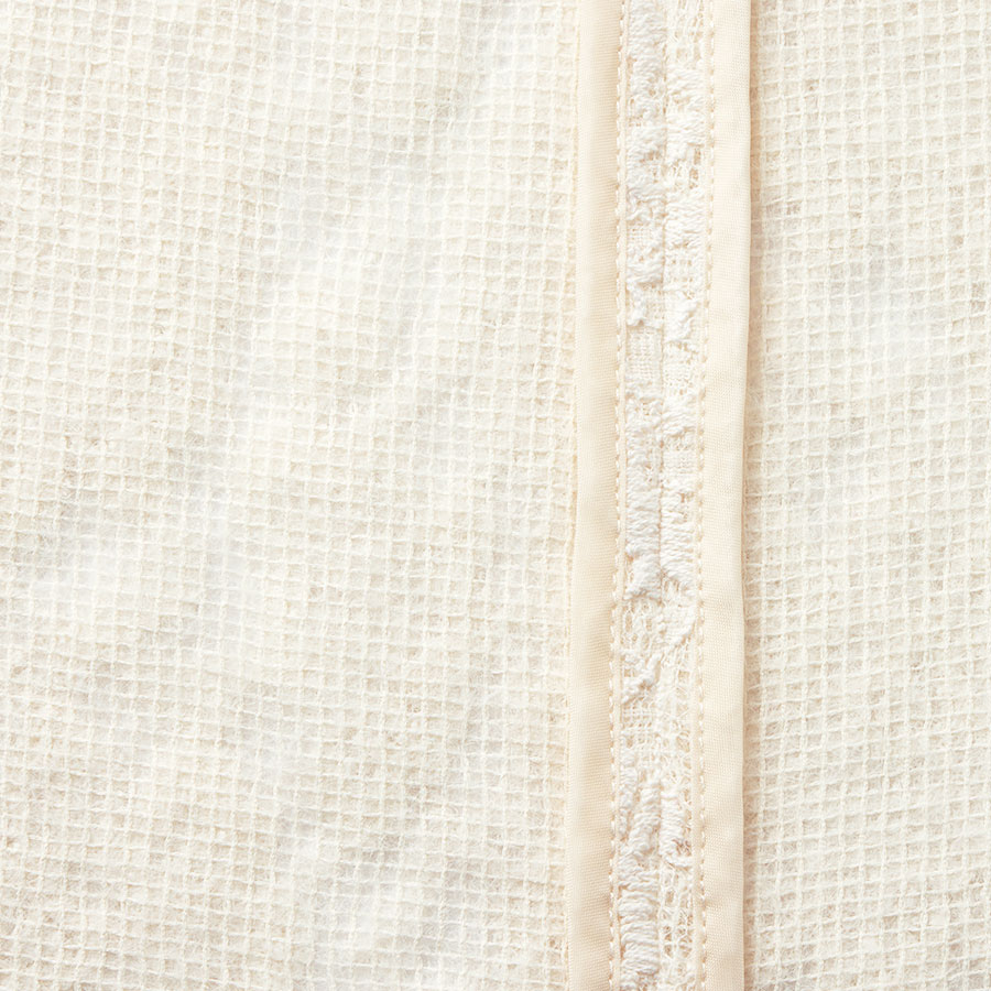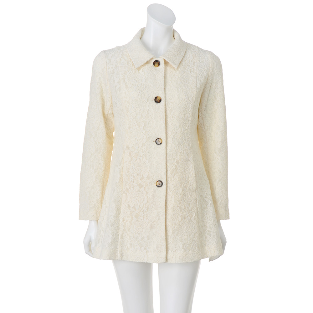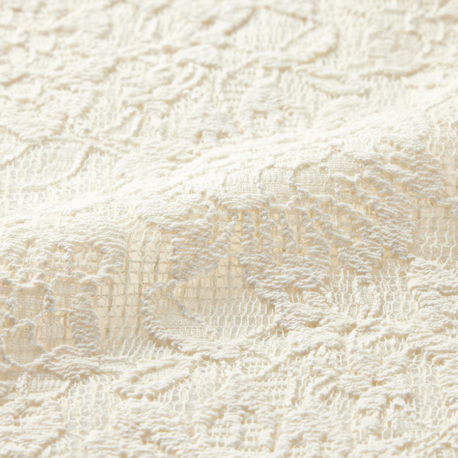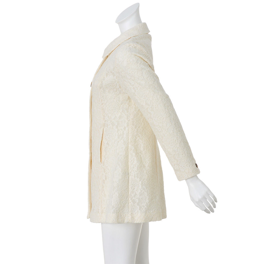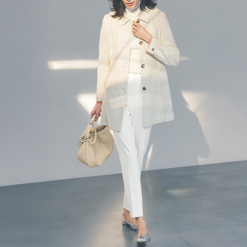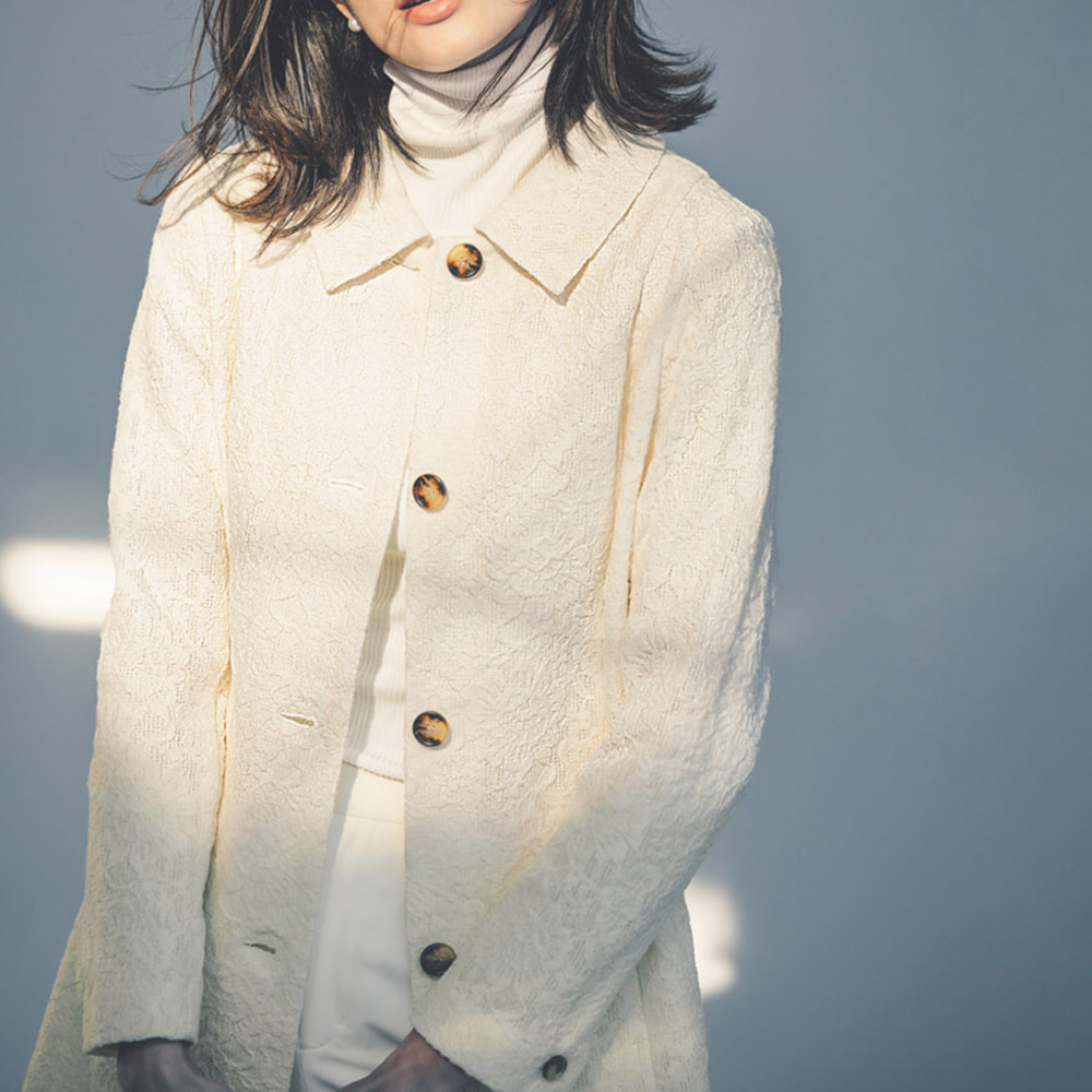 奥行きのあるレースに甘さが漂うコート。生地の存在感を活かした一枚仕立てのベーシックなステンカラーデザインです。ボディラインはパネル切り替えですっきり見せ、ヒップが隠れる丈感でバランスもよし。さらりと軽やかに着られます。POINT格子状になった生地にラッセルレースをボンディング。柄が重なり奥行きのある表情に。見返し端や後ろ中心の縫い代は、パイピング始末できれいに仕上げています。