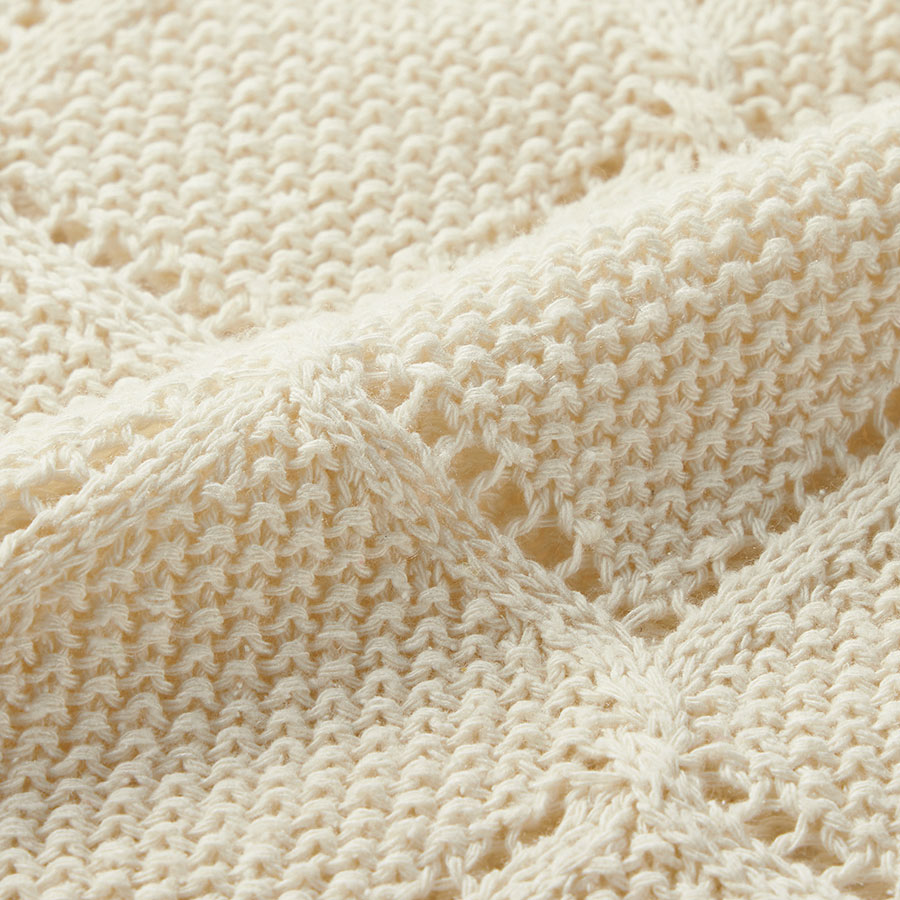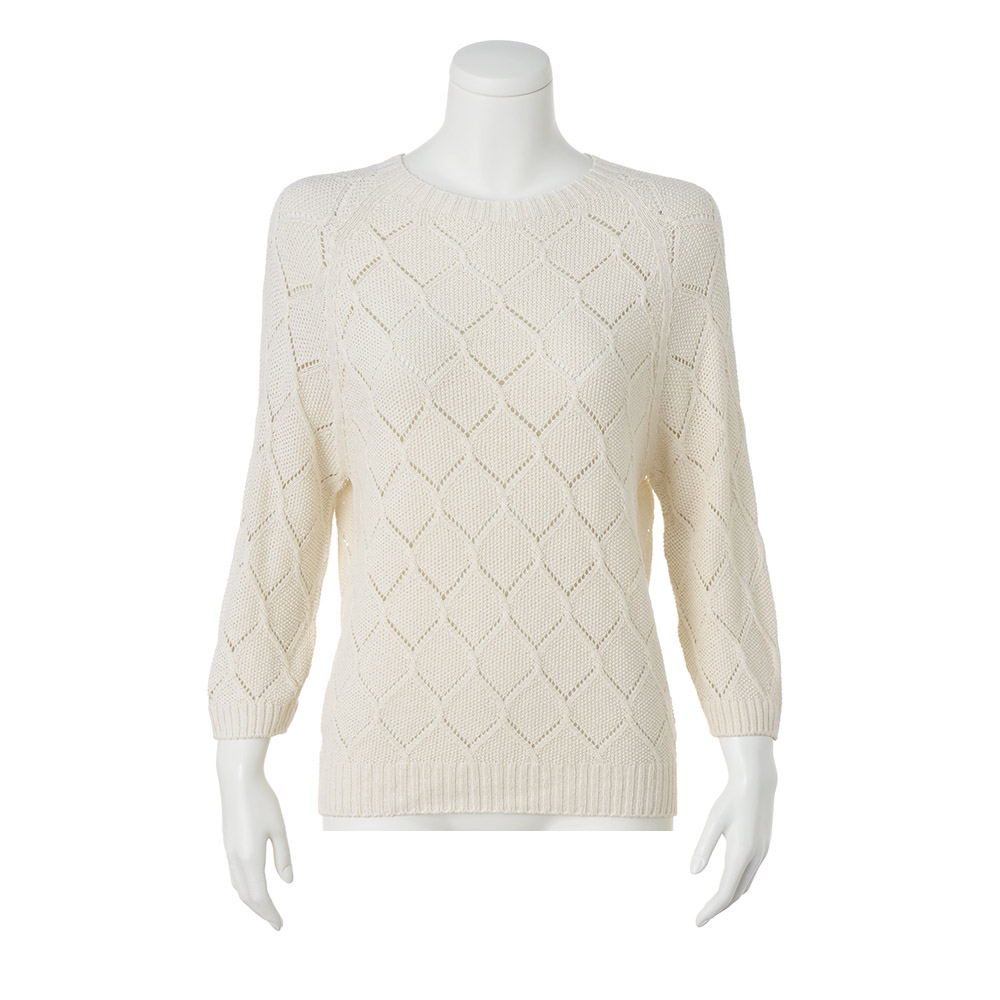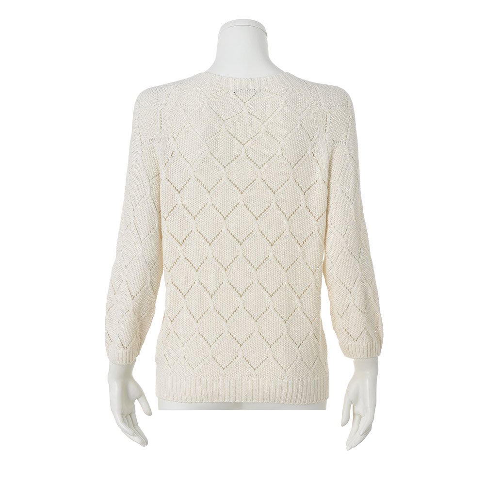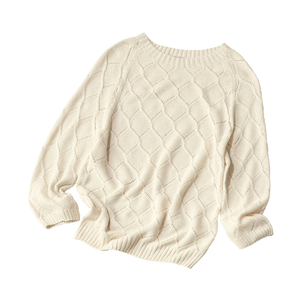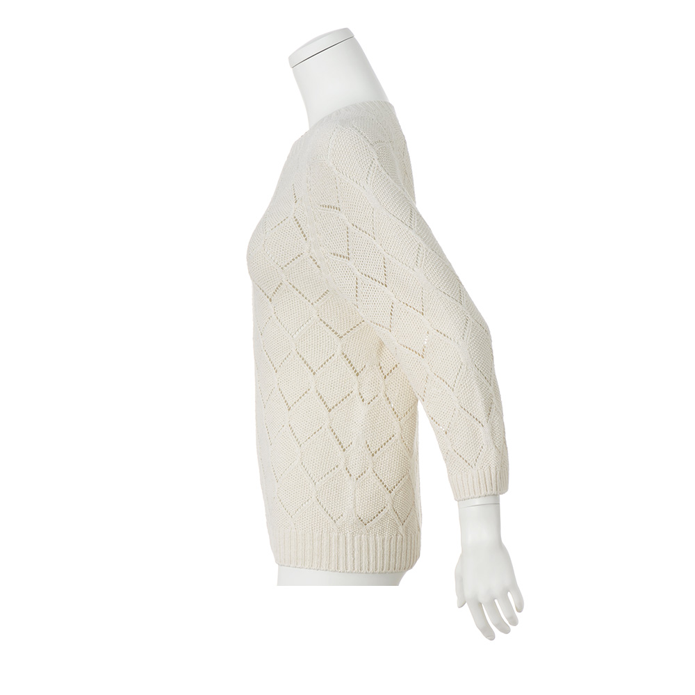 シルクの落ちわたを紡績してできたサステナブルな糸を使い、一本の糸で編み立てる「ホールガーメント(R)」で仕立てた、環境に優しいプルオーバー。凹凸のある鹿の子編みをベースに透かし編みを組み合わせ、手首がのぞく袖丈が抜け感をプラスします。POINT鹿の子編みをベースにした、ダイヤ状の透かし編み柄 袖口と裾はリブ編みにしてすっきりと見せます。生糸や絹紡糸にならないシルクを紡績してできた糸を使用。コットンライクなさらっとしたタッチが特徴です。