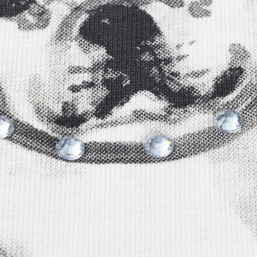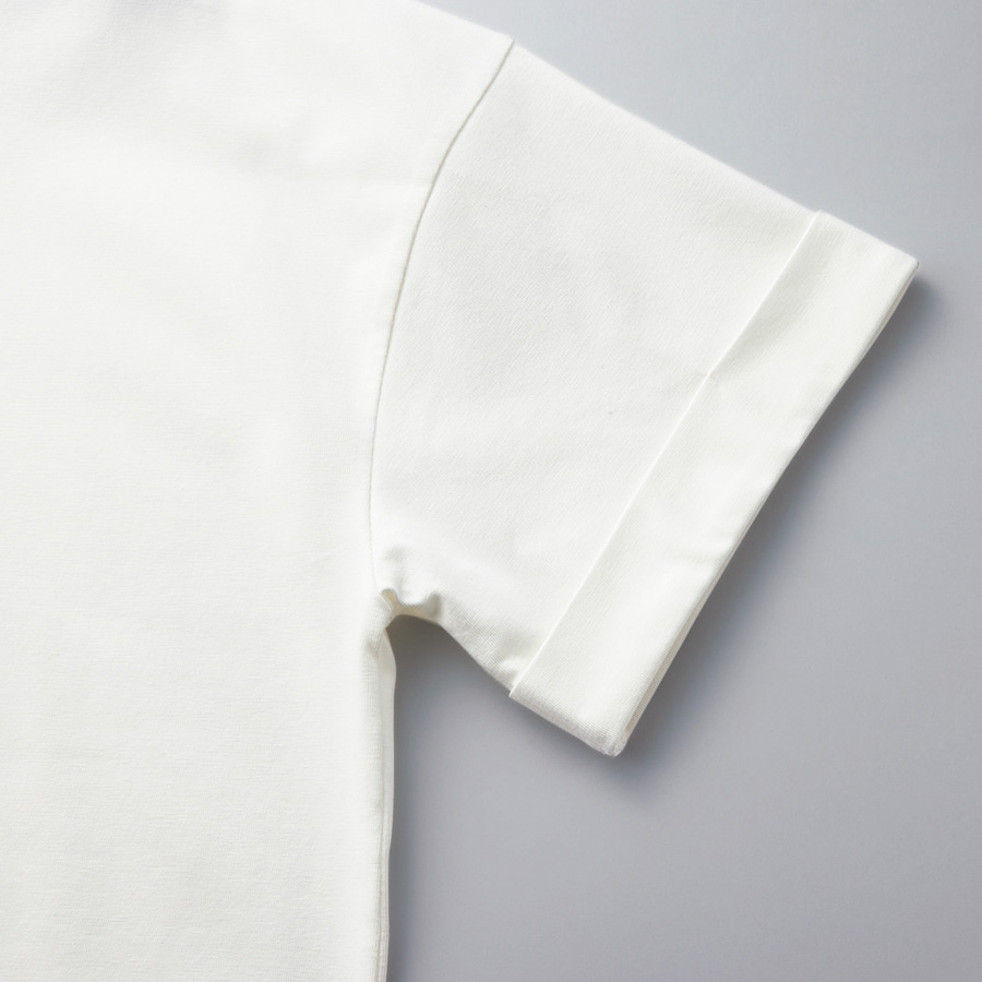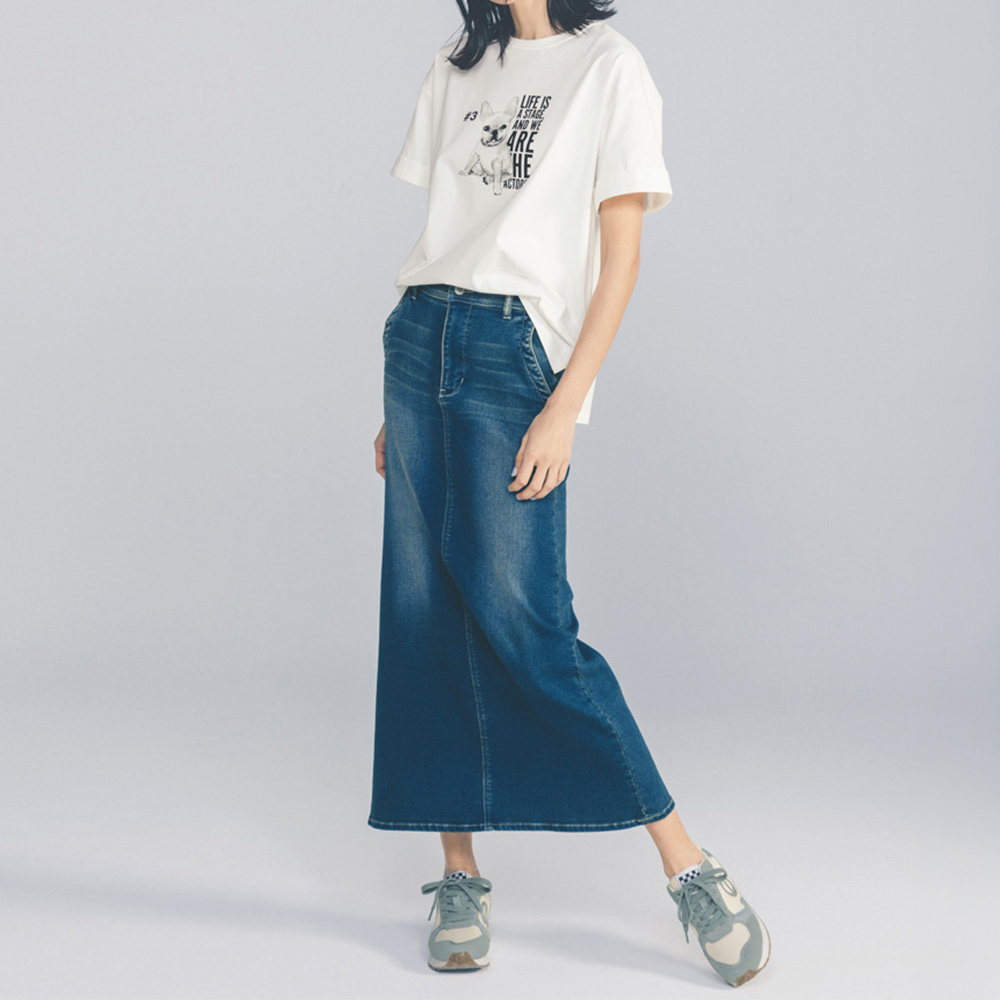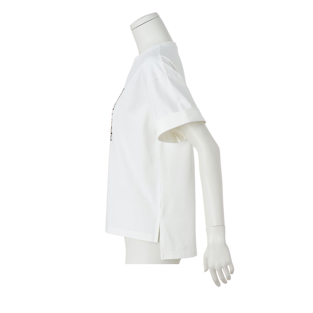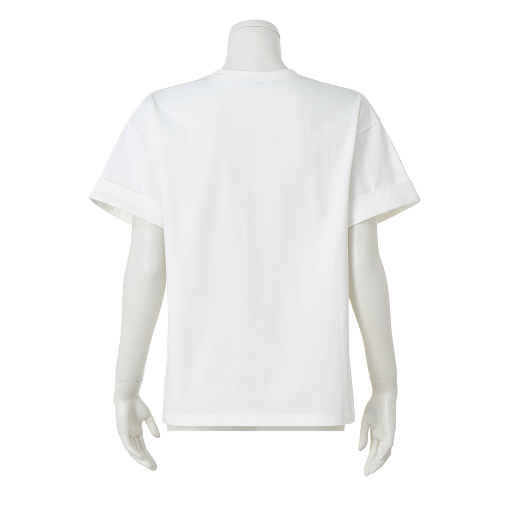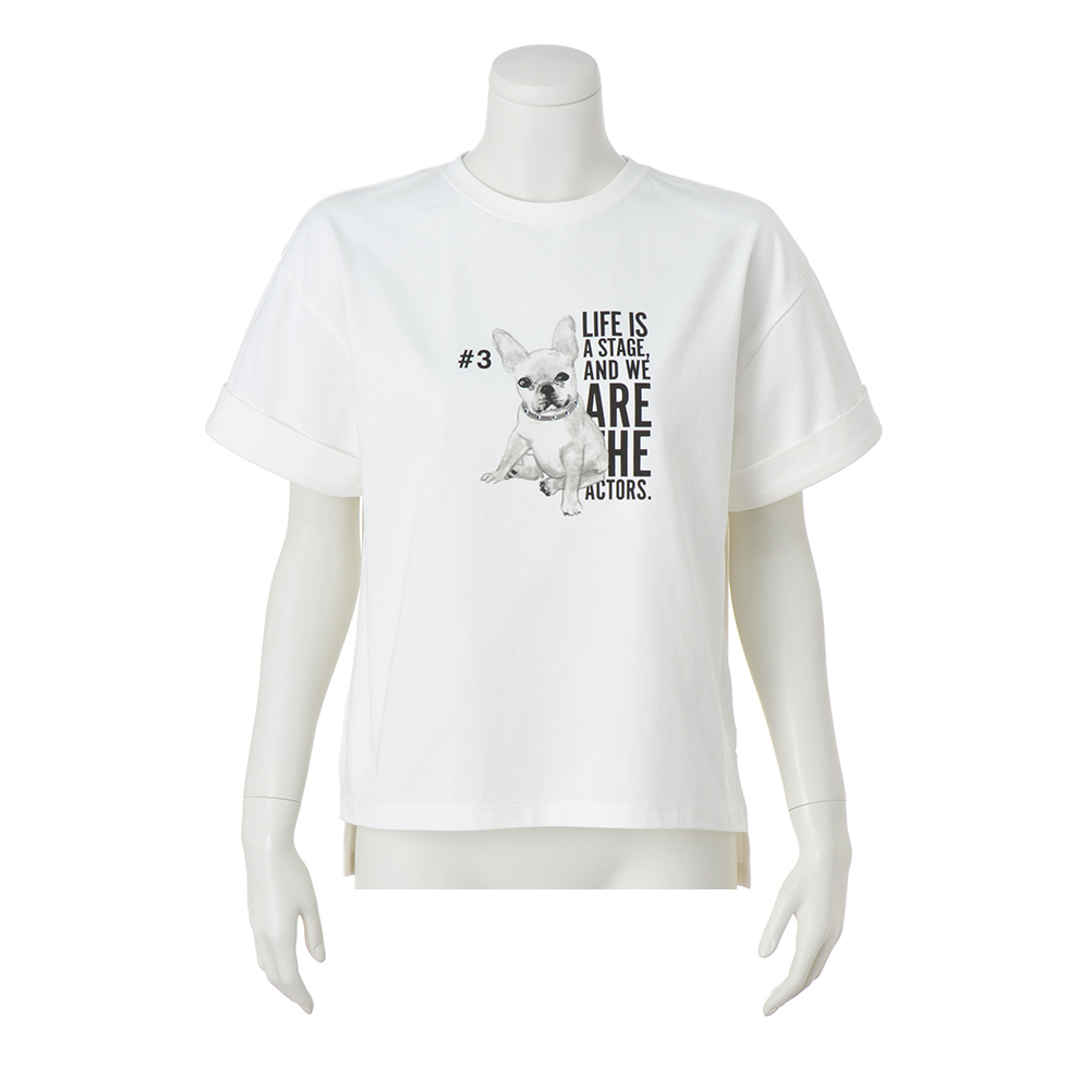 伸びがよく柔らかで適度にハリのあるジャージーで仕立てたTシャツ。キュートなフレンチブルドッグとロゴをモノトーンでプリントし、シックな印象に。両脇スリットや前後差のある丈感で、インでもアウトでも着映えするデザインです。POINT首輪にきらっと輝くラインストーンをつけてデザインポイントに。柔らかな天竺素材。袖はロールアップデザインに。