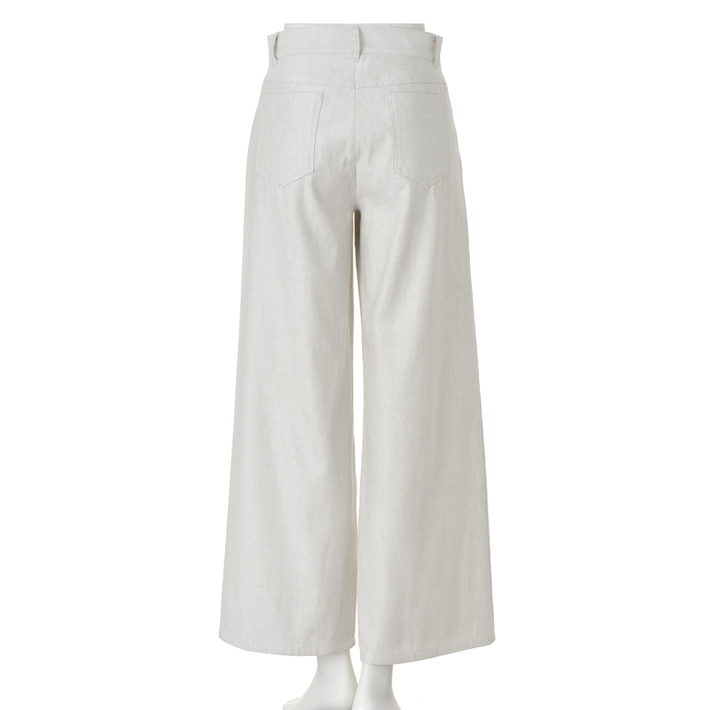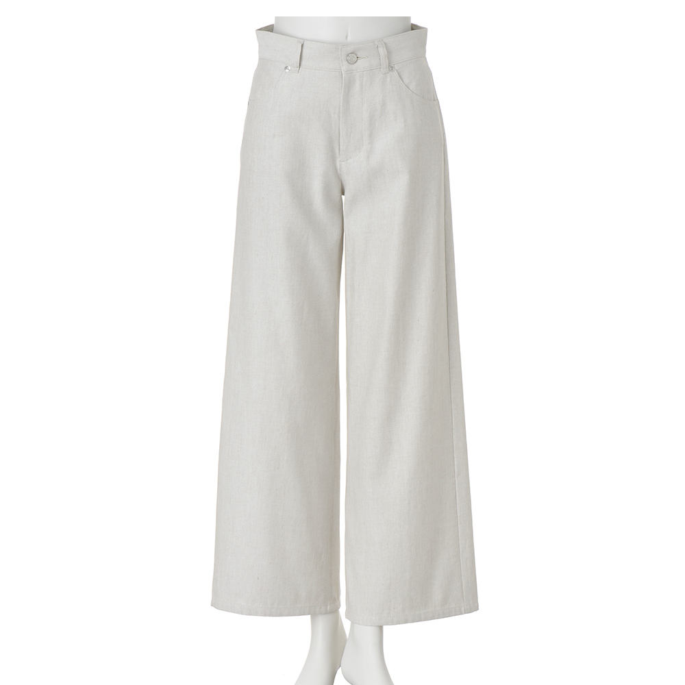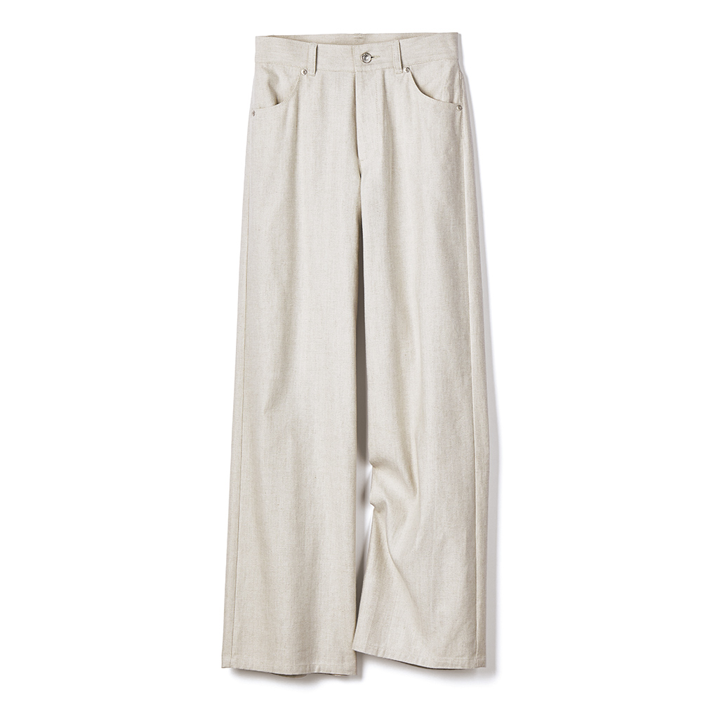 「さりげなく素敵!」が叶うナチュラルトーンコーデ色合いと風合いが絶妙なオフベージュの麻綿ツイル地のパンツは、あらゆるトップスと好バランスでスタイリッシュな佇まいを完成させるセミワイドで。シルバーのネオバボタンやリベット使いでデニムライクな雰囲気を演出し、トップスインでも小粋なカジュアルスタイルを楽しめます。≫ POINTすっきり着こなせるノータックのウエスト仕様に、クールなシルバーのリベットやボタンでデニムのような雰囲気に。