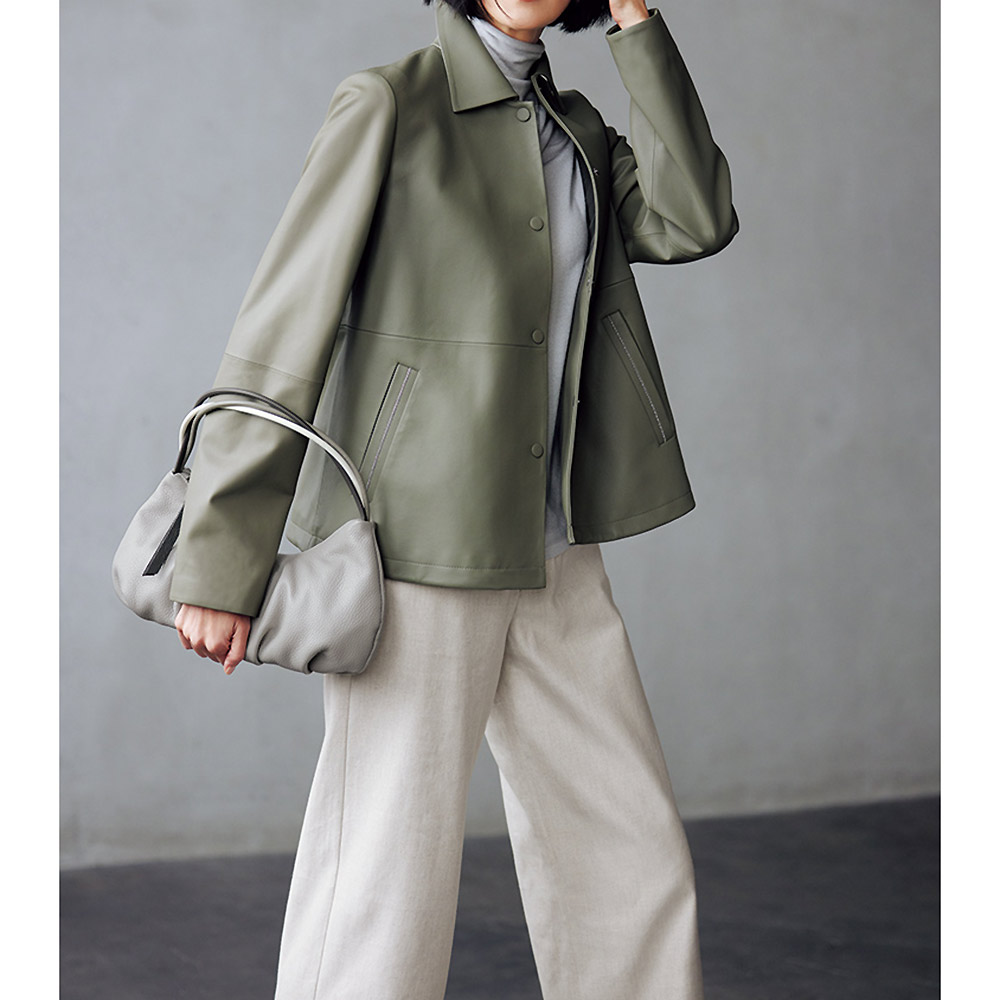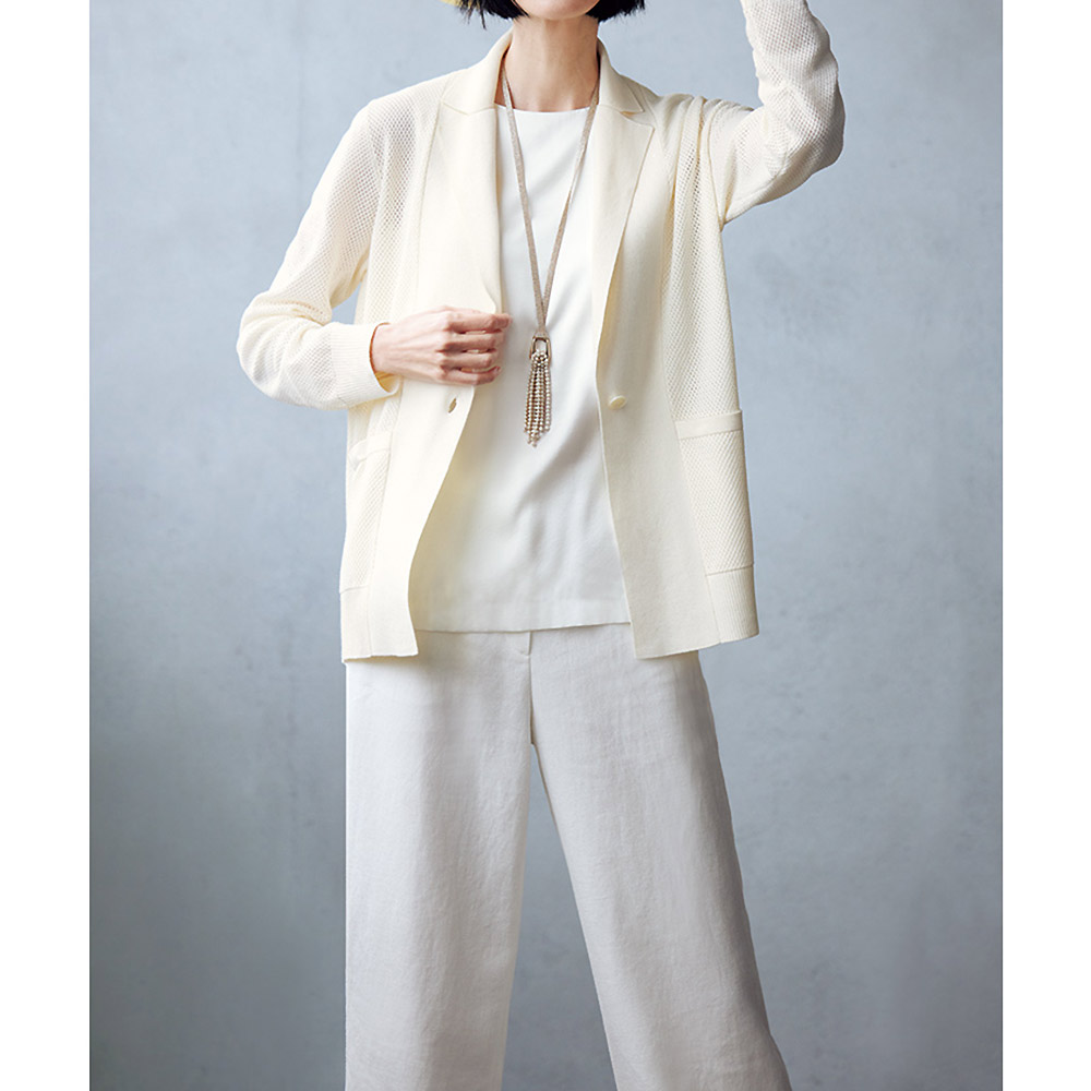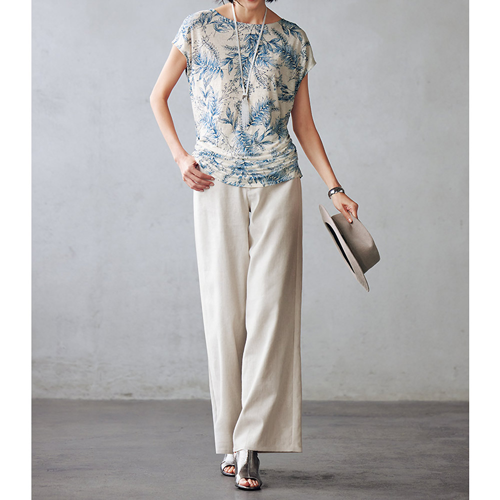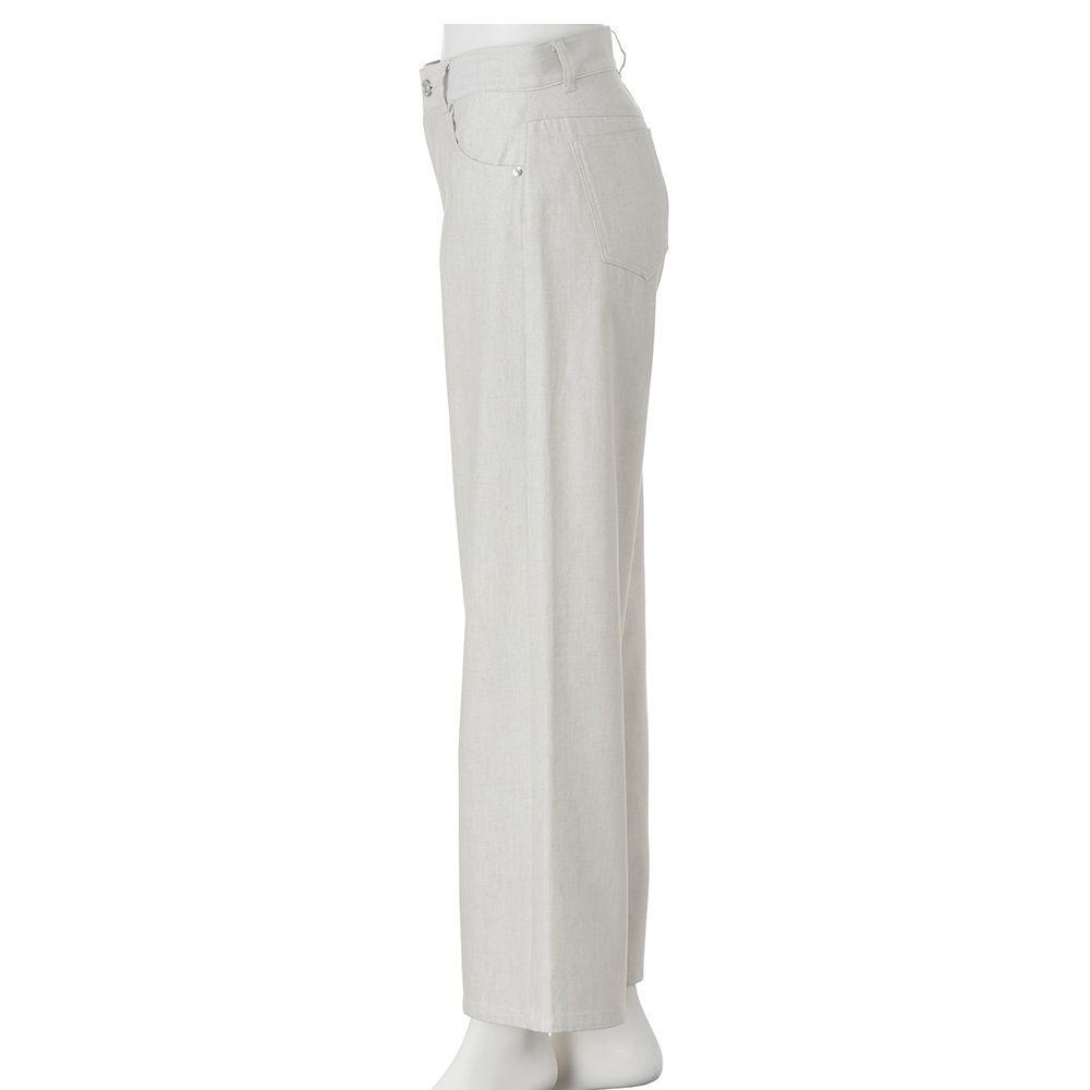 「さりげなく素敵!」が叶うナチュラルトーンコーデ色合いと風合いが絶妙なオフベージュの麻綿ツイル地のパンツは、あらゆるトップスと好バランスでスタイリッシュな佇まいを完成させるセミワイドで。シルバーのネオバボタンやリベット使いでデニムライクな雰囲気を演出し、トップスインでも小粋なカジュアルスタイルを楽しめます。≫ POINTすっきり着こなせるノータックのウエスト仕様に、クールなシルバーのリベットやボタンでデニムのような雰囲気に。