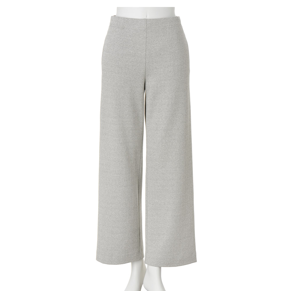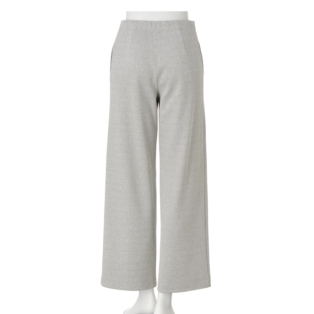 布帛のように見えるイタリア製ジャージー素材。きめ細かく編み込まれたヘリンボーン柄が、品良くシックな存在感を発揮します。レッグラインを拾いにくく美脚に導くセミワイド型は、ゴムベルト×内側ドローコードで安心のはき心地。