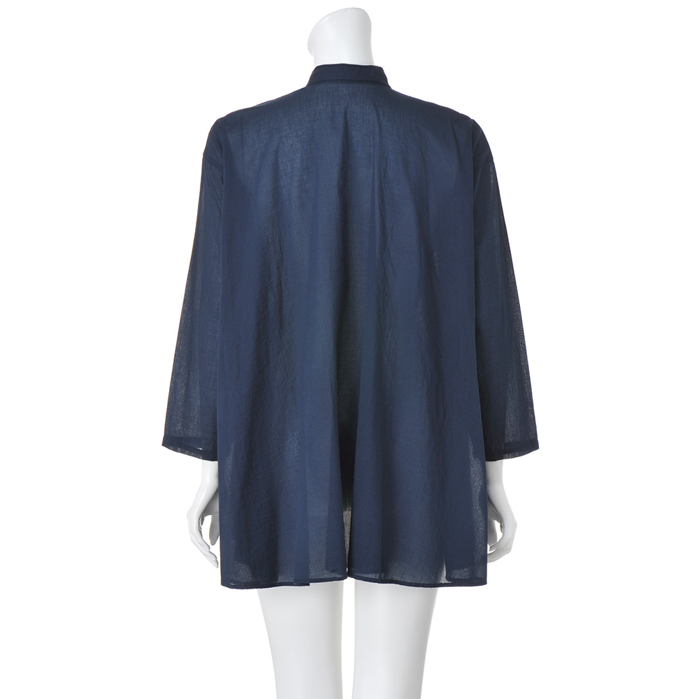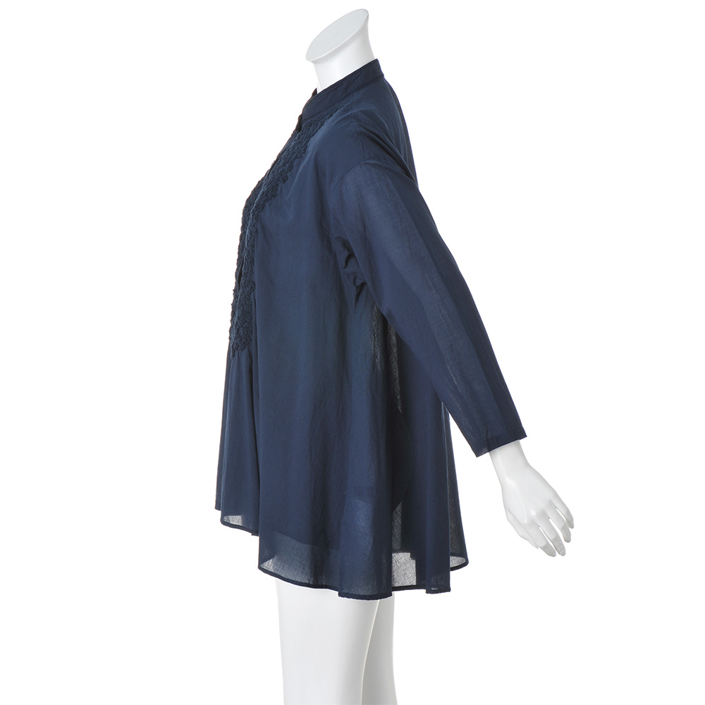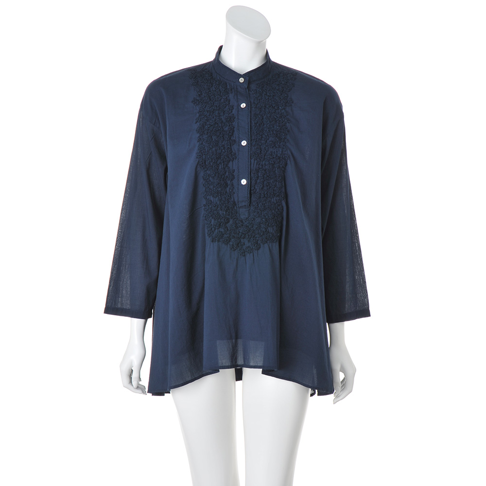 Natural Luxe自然のニュアンスを装いに載せて。心和むナチュラルカラーをリュクスに再解釈。優しさとモード感が調和したデイリーワードローブをお届けします。リュクスな甘さが心に響くネイビー柔らかく軽やかなコットン素材のチュニックは、インドの熟練した職人によるフラワー柄のハンド刺しゅうが象徴的。かぎ針編みで使用する太番手の糸で、時間も手間も存分にかけたぽってりとした立体感がリッチな刺しゅうモチーフは、各々の仕上がりが微妙に異なる味わい深い特別感もひとしおです。さらにバンドカラーの襟ぐりや前立てには、フィッシュボーン柄の手刺しゅうでトリミングし、絵になる存在感を一層加速させています。もちろん肌触りの良さにも拘り、刺しゅう部分の内側は表生地を重ねた2枚仕立てに。前後差を付けたラウンドヘムのきれいなAラインシルエットを堪能できます。