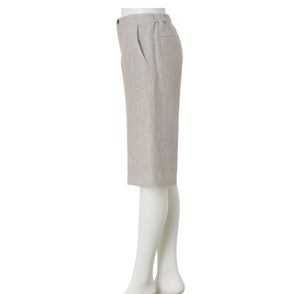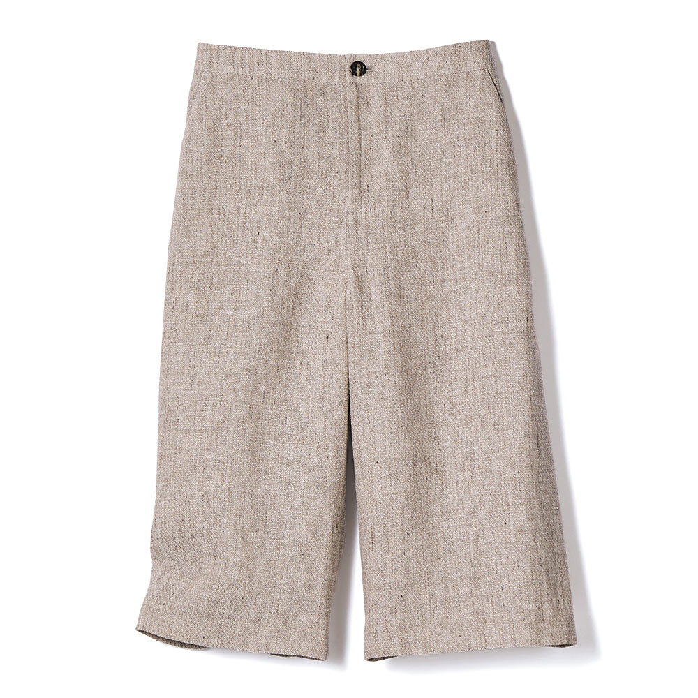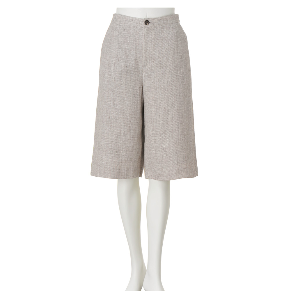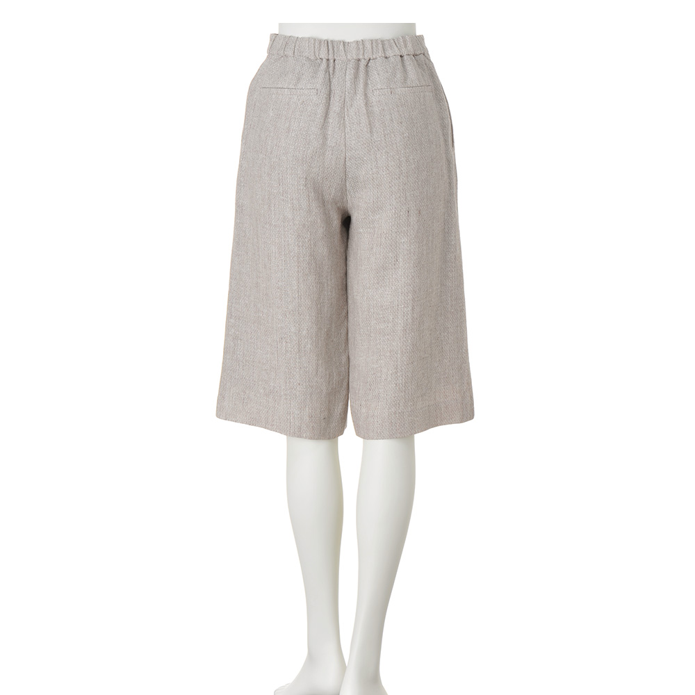 スマートにこなれる一歩先のベーシック人気上昇中のハーフパンツスーツ。使用したのは、麻の涼感にシルクの滑らかさをブレンドした日本製上質素材。ベージュのグラデーション糸をシャンブレーに織り、風合いのよさを際立たせています。軽く涼しげな生地感を活かし、パンツはすらりと縦の線を主張するストレートシルエットに。前面はタックを入れずにすっきりと仕上げ、後ろはゴムギャザーでヒップ位置を高く見せて。膝頭が隠れる絶妙な着丈が、レディーの品格を感じさせる所以です。≫ POINTざっくり織られた網目状の凹凸がサラリとした肌触りを実現。