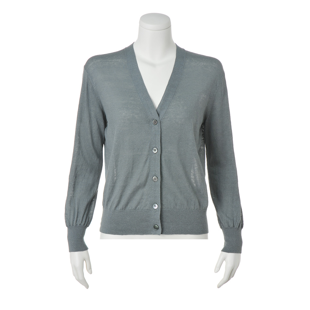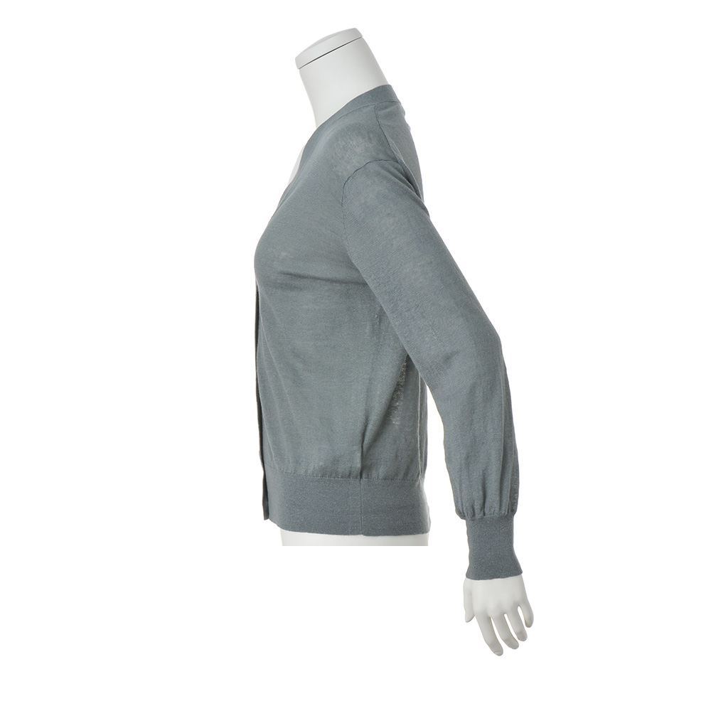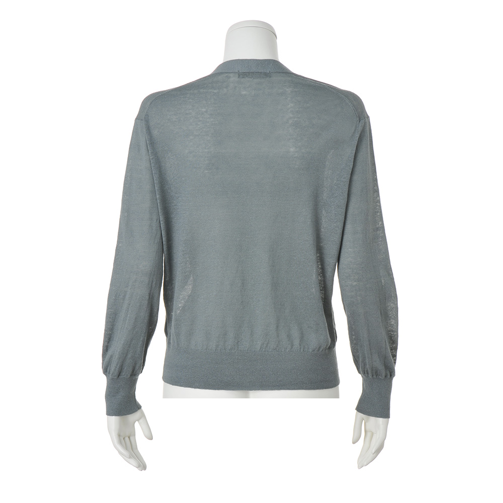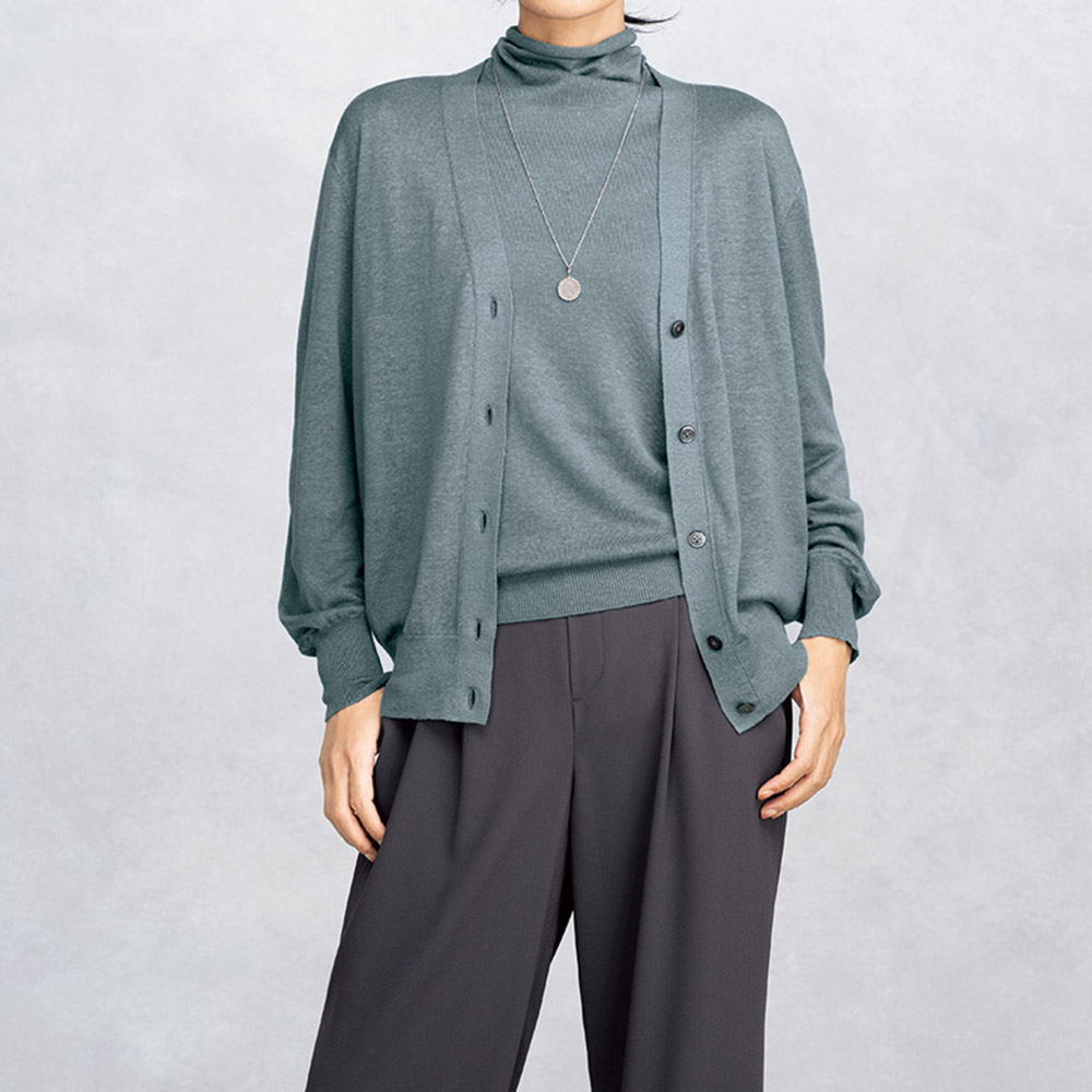 さりげない装いに繊細なトレンド感を添えるセージグリーンのニット上質な素材感と洗練された配色センスを満喫できるイタリア「CARIAGGI」社のニットシリーズは色違いを買い足すファンもいるアイテム。素材の秀逸さだけでなくアイテムごとに格上の洗練シンプルを追求しているのもポイントです。Vネックのカーディガンは、しなやかなハイゲージ編み。前端部分だけ総針編みテープでハリをもたせているので、前を留めても開けて羽織ってもすっきりとした印象です。プルオーバー(商品番号PC7094)とアンサンブルで着た時にはもちろん、単品でも主役になる…目が肥えた大人にふさわしいベーシック名品と言えるでしょう。素肌が喜ぶ名素材、リネンカシミヤシルク。さりげない着こなしでも揺るぎない品格と洗練、そして着る人の美意識が香り立つ…。洗練の本質とも言うべきクワイエット・ラグジュアリーを物語るのが、世界のトップメゾンも厚い信頼を寄せるイタリア「カリアッジ」社のトップクオリティヤーンで編み上げたカーディガンです。素朴なフシ感と清涼感を備えたフレンチリネンを主役に、ホワイトカシミヤとシルクを絶妙なバランスでブレンドした、暖かい季節向けの素材です。柔らかくさらりと爽やかな肌触りとシックでありながら濁りのないダークセージカラーは、わた染めだからこそ表現できる質感と発色。まさに「本物」だけが表現できる魅力です。単品でもアンサンブルでも格別な存在感を放つ逸品としておすすめです。