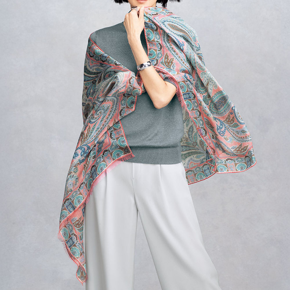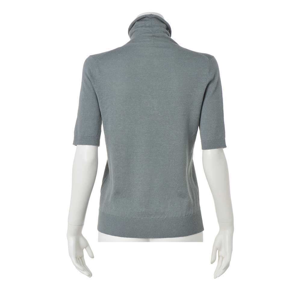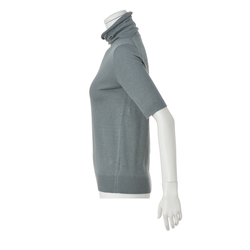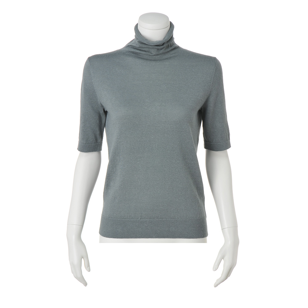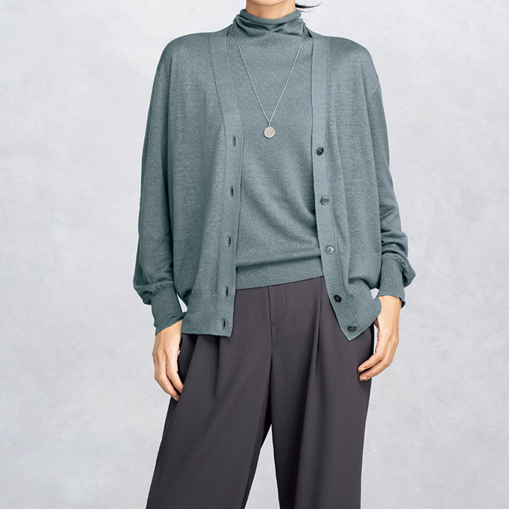 さりげない装いに繊細なトレンド感を添えるセージグリーンのニット上質な素材感と洗練された配色センスを満喫できるイタリア「CARIAGGI」社のニットシリーズは色違いを買い足すファンもいるアイテム。素材の秀逸さだけでなくアイテムごとに格上の洗練シンプルを追求しているのもポイントです。プルオーバーは、糸を二本取りにして透け感をセーブした天竺編み。程良くゆとりのあるタートルネックは折り返したり、自然に弛ませたりアレンジを楽しめます。カーディガン(商品番号PC7093)とアンサンブルで着た時にはもちろん、単品でも主役になる…目が肥えた大人にふさわしいベーシック名品と言えるでしょう。素肌が喜ぶ名素材、リネンカシミヤシルク。さりげない着こなしでも揺るぎない品格と洗練、そして着る人の美意識が香り立つ…。洗練の本質とも言うべきクワイエット・ラグジュアリーを物語るのが、世界のトップメゾンも厚い信頼を寄せるイタリア「カリアッジ」社のトップクオリティヤーンで編み上げたプルオーバーです。素朴なフシ感と清涼感を備えたフレンチリネンを主役に、ホワイトカシミヤとシルクを絶妙なバランスでブレンドした、暖かい季節向けの素材です。柔らかくさらりと爽やかな肌触りとシックでありながら濁りのないダークセージカラーは、わた染めだからこそ表現できる質感と発色。まさに「本物」だけが表現できる魅力です。単品でもアンサンブルでも格別な存在感を放つ逸品としておすすめです。