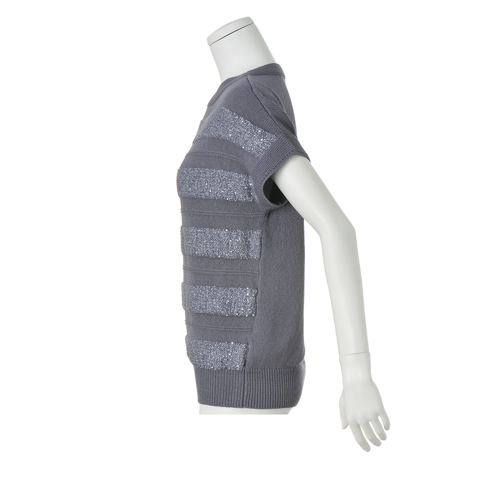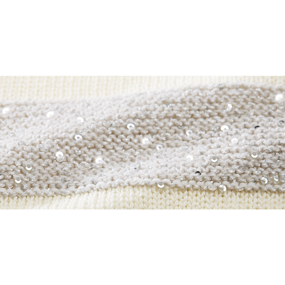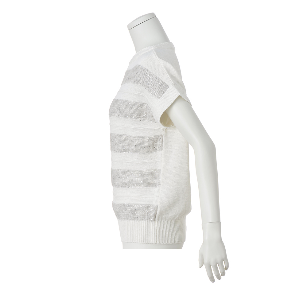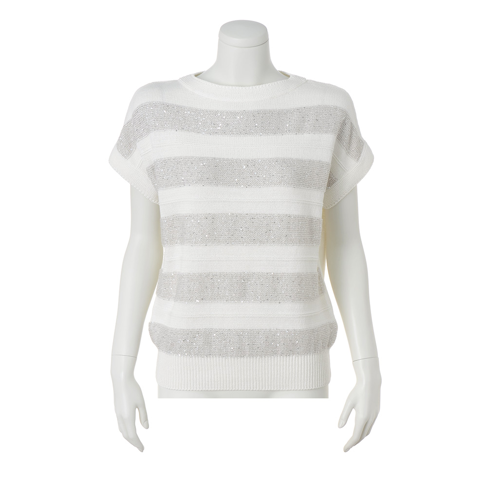 輝きと編み地のクリーンなハーモニー定番のボーダー柄だからこそ、人と差のつく一着を選びたい。スパンコールを編み込んだ人気のボーダーニットを、ホワイト×シルバーの涼やかなカラーリングで。ホワイトは肌触りの良いコットン100%のストレートヤーン、シルバーはイタリア「PECCI」社の華やかなスパンコールヤーンを使用。糸と編み地が引き立て合うよう、スパンコール糸は輝きが際立つ天竺裏目に、天竺表目の白無地部分は中央にガーター編みを入れて立体的なボーダーにしています。フォルムは身体をゆったりと包む程良い身幅、袖は肩で自然に落ちるフレンチスリーブ。パンツにもスカートにも合わせやすい丈感です。