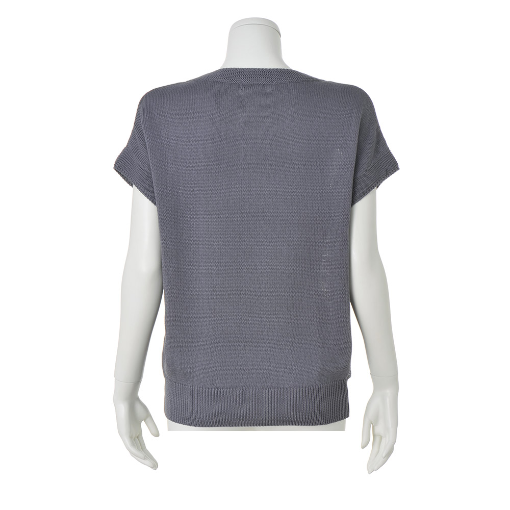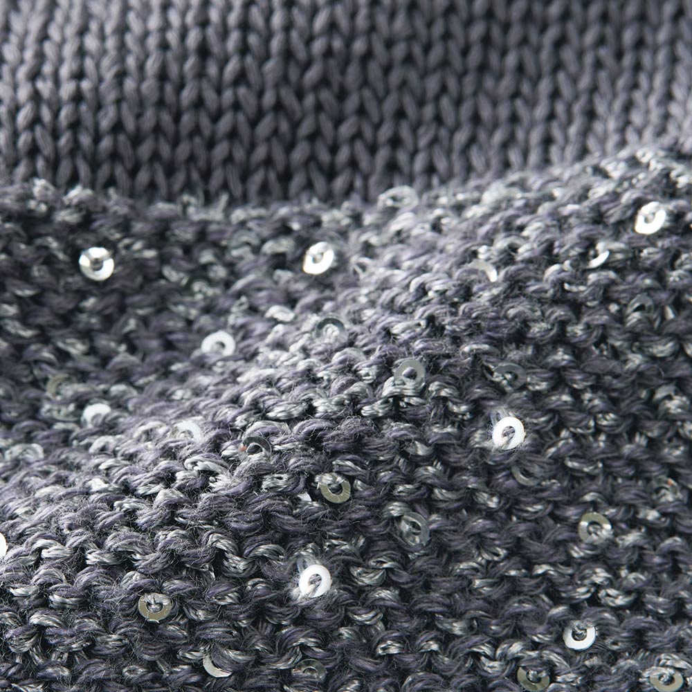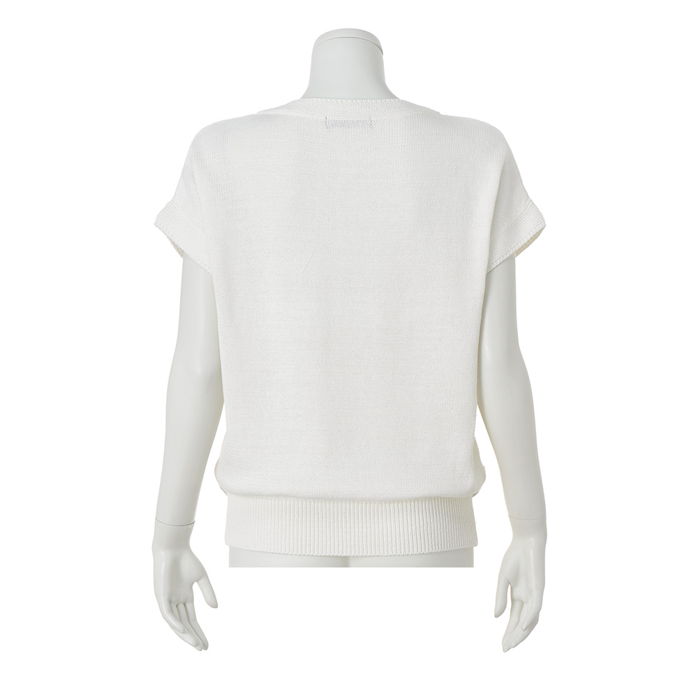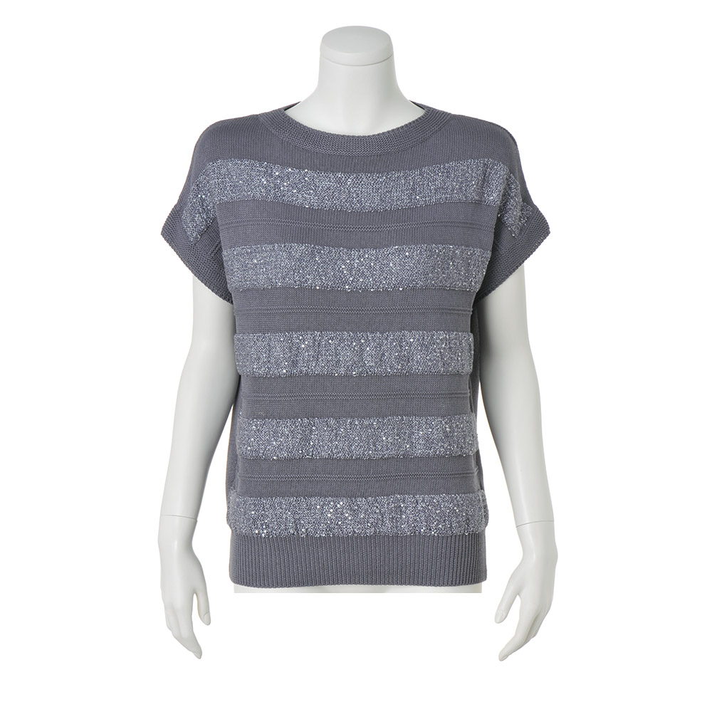 輝きと編み地のクリーンなハーモニー定番のボーダー柄だからこそ、人と差のつく一着を選びたい。スパンコールを編み込んだ人気のボーダーニットを、ホワイト×シルバーの涼やかなカラーリングで。ホワイトは肌触りの良いコットン100%のストレートヤーン、シルバーはイタリア「PECCI」社の華やかなスパンコールヤーンを使用。糸と編み地が引き立て合うよう、スパンコール糸は輝きが際立つ天竺裏目に、天竺表目の白無地部分は中央にガーター編みを入れて立体的なボーダーにしています。フォルムは身体をゆったりと包む程良い身幅、袖は肩で自然に落ちるフレンチスリーブ。パンツにもスカートにも合わせやすい丈感です。