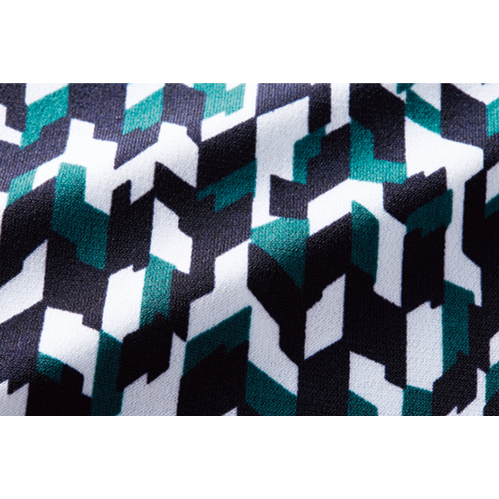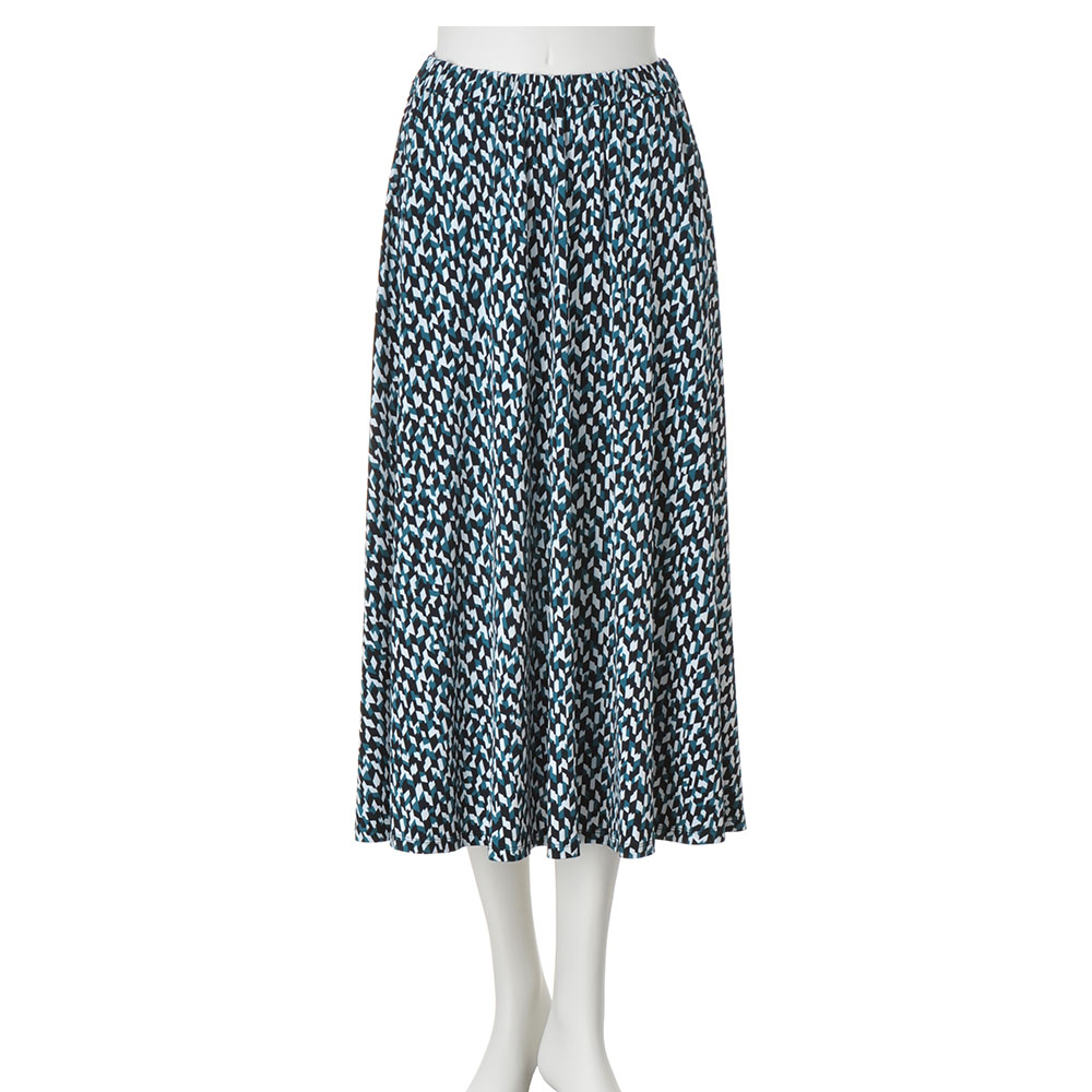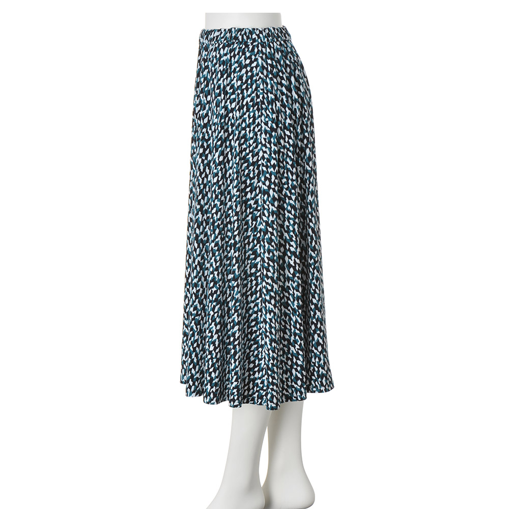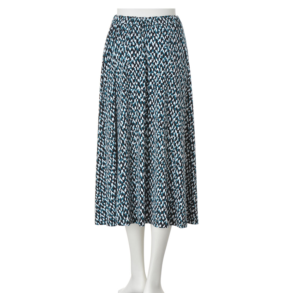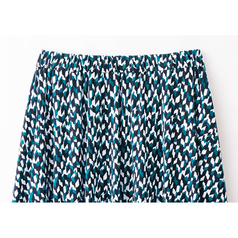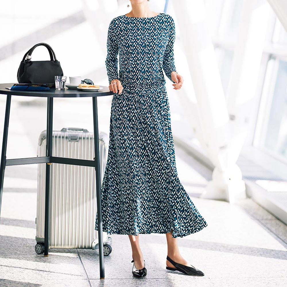 素材は、さらりと滑らかなストレッチジャージー。コントラストのある細やかなモザイク模様が、知的な美しさを印象付けてくれます。生地の落ち感を楽しむフレアーラインスカート。着脱の楽なプルオン仕様ですが、歩くたびに裾のドレープが揺れて着映え力は充分。移動や会議、夜の会食まで一着で通せるオールラウンダーです。